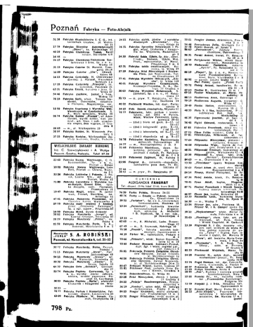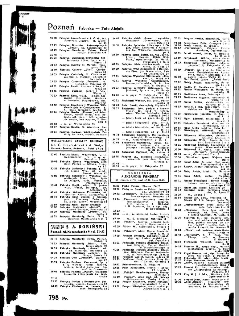 Poznań 5 1 58 17 79 4019 16 48 2 6 25 3133 16 09 1603 17 33 63 3 1 54 46 70 33 12 52 26 74 26 68 50 97 37 3 3 Fabrvk a — Foto-A!cjnik F a b r y k a A k u m u l a t o r ó w I . C. O., inż. Oottschalk C z e s ł a w , p l . Wolno ści 11 Fabryka Bilardów Automatycznych „ B a w o " , ks. Kordeckiego 12 F a b r y k a Chemiczna Tukan, Karol bander, Starolęcka 6/8 — Fabryka Chemiczno-Techniczna Szafarklewlcz i S-ka, Sp. z o. o., . Wielka 16 F a b r y k a C u k r ó w St. M a r e c k i , T r a u gutta 20/26 Fabryka C u k r ó w „ U l a " , Chwallszewo 68 Fabryka Czekolady, H . Chmielewski d a w n i e j : J . Marszal, Wazystkich świętych 4 a Fabryka Czekolady „ F r a n c o l s " , F r . Qolombek, Pocztowa 2 1 Fabryka E m a l i i , Kurzawa i S-ka, G. W i l d a 37 Fabryka g u z i k ó w , Jaekel I S-ka, W o ź n a 12 Fabryka K a f l i , w l a ś c . Tomasz Stasierskl, Ostrzeszów, składnica w Poznaniu, M a g a z y n o w a , nar. Drzewnel Fabryka Kapeluszy I W y r o b ó w W ł ó kienniczych w C z ę s t o c h o w i e , S. A . , biuro s p r z e d a ż y . W i e l k a 20 Fabryka Kołder „ P o z n a ń " , wł. Adam Handel, wyrób kołder, b i e l . p o ś c i e l . , a r t . Tiran, i całk. u r z ą d z e nie w n ę t r z , dom w y p r a w , 27 G r u dnia 6 — m . , a l . Wielkopolska 29 Fabryka Kołder, St. Wieczorek, Pie kary 1 F a b r y k a K o r k ó w , Wielkopolskie Za kłady K o r k o w e , ś r o d k a . Podwale WIELKOPOLSKIE ZAKŁADY KORKOWE Inż. C. S z e w c z y k o w s k l i A. Wulge PozneA - Środka, Podwal*, Telat 37-33 23 60 mi 10 02 5 3 26 7180 19 47 47 41 27 75 19 59 58 82 28 29 2152 F a b r y k a Kwasu W ę g l o w e g o , C. O. Rommenhóller, Sp. z o. o., Poznań — Rataje Fabryka Kwasu W ę g l o w e g o , Leon Rost, P o z n a ń — G ł ó w n a , Rzecz na ł / S Fabryka Lakierów i P o k o s t u , J. Pe rek, Leszno W l k . , s k l . d e t a l . , P o z n a ń , Wodna 13 Fabryka Ł ą c z n i k ó w i W y r o b ó w L a n o - K u t y c h , Ernest Erbe, Spół ka A k c y j n a , oddz. Poznański, Przemysłowa 21 Fabryka M a g l i , wlaśc. M . Jankow i a k , Poznał), Starołęka, św. Antoniego 16 F a b r y k a Makaronu P o z n a ń s k a , w ł . Stanisław Kalota, Warszawska 8 F a b r y k a mąki mięsnej I kostnej, patrz: „Przetwory Zwierzęce", Sp. z o g r . o d p o w . , Mogileńska 57 F a b r y k a M e b l i , Rynek Śródeekł Fabryka Musztardy „ K o s p e " , wł. K o n r a d Sprenger, Strzelecka 37 Fabryka Musztardy „Palmo", św. Rocha 8 Fabryka M u s z t a r d y , Perta, S. A . „ R o b l ń s k l , Masztalarska 6 m . 1 !?r"ł.VÄ S. A. R 0 B 1 N S R I Poznań, al. MasztalarsKa 6, tel. 21*52 Ä 50 72 Remu, P o z n a ń , Bierniki 3 7113 Fabryka Musztardy „ R i v a l " , Patr. Jackowskiego 49 5411 F a b r y k a Musztardy „ S ł o ń c e " , wł. E d . W a r o c z y k , Strzelecka 31 20 32 F a b r y k a Musztardy „Vitello", K. S t r z y ż , Sokoła 19 64 32 Fabryka Octu „ O c t o l u x " , OórczyńSka 27 53 74 Fabryka Papieru Czerwonak, Sp. z o . Q., w y r o b y : papier pakowy, t e k t u r a , torebki papierowe, Po znań 10, C z e r w o m k 38 03 Fabryka Papieru „ M a l t a " , właściciel D r u k a r n i a i Księgarnia ś w . W o j ciecha 9223 — 7 2 7 7 Fabryka Perfum I K o s m e t y k ó w , F a l kiewicz, eksped., Ł u k a s z e w i c z a 22 63 09 Fabryka P i l n i k ó w , W . Bensch. Po z n a ń , Strumykowa 11 798 Fabryka Pz. Musztardy, 24 01 76 31 24 30 63 3 1 27 2 9 77 4 1 40 6 1 3 0 03 5173 40 22 3 4 65 7977 76 78 3 4 77 5168 12 05 23 98 57 44 38 43 Fabryka siatek, płotów I wyrobów drucianych „Drutownla", Po z n a ń , Rataje 44 Fabryka Sprzętów Kościelnych I F i g u r , wlaśc. Drukarnia I Księgar nia ś w . Wojciecha, M a d a l l ń s k i e go 3 F a b r y k i S z k l ą U j ś c i e , Sp. Akc , d a w n . Friedr., Siemens, Ujście, W o j . P o z n . , reprezentacja, a l . Marsz. Piłsudskiego 9 m. 5 Fabryka tablic emaliowanych. Ku r z a w a , O. W i l d a 37 Fabryka W ó d M i n e r a l n y c h 1 Rozlew n i a P i w a , Jan W a w r z y n i a k , T y l ne Chwallszewo 27 Fabryka W y r o b ó w Blaszanych, „ E m c h a " , G. W i l d a 149 Fabryki Wyrobów Ceramicznych, KrotOSZyn-Przysleka, S. A . , Za rząd. 27 Orudnia 4 Fabryka Wyrobów Metalowych, S. J a b ł o ń s k i , Sp. z o. o., F r . R a t a j czaka 17 — m . p r y w . T . Ratajczaka, w l . f i r m y , Skarbowa 14 Fachlnettl W a c ł a w , I n ż . d y p l . , P a r t y zancka 8 Falk D a w i d , ziemiopłody, M ł y ń s k a 12 Falkiewicz, f a b r . p e r f u m i kosme tyków, zał. 1911 w Paryżu, w l a ś c . W a c ł a w Falkiewicz, Ł u k a szewicza 30-32 — ( d o d . ) biura od godz. 8—13, od 16—17 8—13. — ( d o d . ) księgowość godz. I od 16—17 ( d o d . ) laboratoria, od 8—13, od 15—17 — ( d o d . ) ekspedycja od g. 8—17 Falkiewicz Kazimierz, Reprezentacja motocykli, Dąbrowskiego 26 — ta., Rzeczypospolitej 3 m. 3 Falkiewicz S t a n i s ł a w a , dawn. Sokolnlcka, pensjonat dla przy jezdnych I s t a ł y c h , F r . Ratajcza ka 33 m . 7 I 9 Falkowski Zygmunt, d r . Kaliska 5 m. 1 Fangrat A., cukiernia - ekspedycja, zamówienia poza d o m , F r . Ra tajczaka 37 m . p r y w . , F r . Ratajczaka 17 C U K I E R N I A ALEKSANDER FANGRAT T e ł : eksped. 23-98; lokal 57-44; Maro 38-43. 76 59 40 76 39 52 15 24 13 3 3 62 60 67 49 7118 46 39 70 66 75 95 51 01 46 26 84 67 2181 79 9 1 23 28 24 22 3619 84 05 23 52 Farba Polska, Stroma 24-25 Farby — Emalie — Pokost, Jaroszyk Cz., Chwallszewo 24 „ F a r l a b o r " , Sp. z o. o . , l a b o r a t o r i u m farmaceutyczne, Mostowa 15 „Farmahurt", hurtownia towarów farmaceutycznych i drogeryjnych, aptekarze A. Michalski I B . Szymczak, Sp. z o g r . o d p . , pl Nowomiejski 4 — — m . , A . M i c h a l s k i , L u d w . Rzepec kiego 42 — m . , B . Szymczak, Nehrlnga 10 „Fasmlt", fabryka szczotek t e c h nicznych, Gąsiorowskich 4 F ä r b e r W . , radiotechnik, Piek