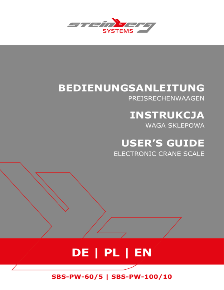BEDIENUNGSANLEITUNG PREISRECHENWAAGEN INSTRUKCJA WAGA SKLEPOWA USER’S GUIDE ELECTRONIC CRANE SCALE DE | PL | EN SBS-PW-60/5 | SBS-PW-100/10 INHALT | TREŚĆ | CONTENT 3 11 19 1. GRUNDLEGENDE HINWEISE Elektrische Preisrechenwaagen von der Firma Steinberg Systems wurden mit hochpräzisen Dehnungssensoren ausgestattet. Moderne Technik unter Verwendung von neuen Erfindungen wie dem Mikroprozessor 8951samt einem A/D-Wandler mit der Dreifachintegration wurden hierzu angepasst. Elektrische Preisrechenwaagen von der Firma Steinberg Systems stellen ein gutes Preis-Leistungs-Verhältnis dar. Folgende Funktionen sind vorhanden: Speichern von bis 99 Einzelwägungen, Überlastungs – und Spannungsabfallanzeige, automatisches AC/DC-Umschalten, Identifizierung der Stromquelle, automatischer Temperaturausgleich, automatischer Energiesparmodus und Speichern der Grundpreise (betrifft 7 unterschiedliche Grundpreise). Insbesondere das Speichern der Daten garantiert präzise Wägung. 2. TECHNISCHE DATEN Modell 3110 SBS-PW-60/5 Präzisionsklasse 3111 SBS-PW-100/10 III Genauigkeit 1/3000 F.S. Wägebereich (Nennwert) 60 kg 100 kg Standardauflösung 6000 10000 Ablesbarkeit (e) 5g 10g Wägebereich (max.) 60kg 100kg Mindestlast 200g Nullstellbereich Tarabereich 0~60d 0~60kg 0~100kg Nullnachführung Limit der Anzeige 0~5g 60.090kg 100.090kg ACHTUNG: e=d 2.3 FEHLERBEREICH Gewicht (beschrieben als e) Fehlerbereich Ausgangsprüfung Prüfung nach Reparatur 0≤m≤500e ±0.5e ±1.0e 500e<m≤2000e ±1.0e ±2.0e 2000e<m≤3000e ±1.5e ±3.0e 3. SPANNUNGSVERSORGUNG 3.1 NETZSPANNUNG: 230V(+10%~-15%); 50±2%Hz / 110V(+10%~15%); 60±2%Hz Energieverbrauch: Nicht mehr als 1VA, normaler Energieverbrauch niedriger als 0.2VA 2 3 DE 3.2 Parameter des Gleichstroms 4.2 Zusätzliche Anzeigen und Display-Funktionen 4.2.1 Display Gewicht Kapazität des Akkus: 6V 4Ah Nennspannung: 6V DC Null-Anzeige [ZERO]: befindet sich im Gewichts-Display oben auf der linken Seite. Sie leuchtet, wenn die Preisrechenwaage nullgestellt wurde. Tara-Anzeige [TARE]: befindet sich im Gewichts-Display unten auf der linken Seite. Sie leuchtet, wenn die Preisrechenwaage tariert wurde. 4. DISPLAYÜBERSICHT 4.1 Displays Display Gewicht (WEIGHT): 5 Stellen Display Grundpreis (UNIT PRICE): 5 Stellen Display Verkaufspreis (TOTAL): 6 Stellen 4.2.2 Display Grundpreis Im Modus Summieren (die Preisrechenwaage zeigt “Add” an) zeigt die Grundpreisanzeige die Anzahl der Einzelwägungen. Beispiel: Auf dem Display erscheint „01” beim ersten Betrag im Arbeitsgang usw. AC-Anzeige: Sie leuchtet, wenn der Wechselstrom angeschlossen ist. Wenn die Anzeige nicht leuchtet, ist die Stromquelle nicht richtig angeschlossen. Überprüfen Sie das Netzkabel, den Netzstecker und die Sicherung. 4.2.3 Display Verkaufspreis Summieren-Anzeige ADD: befindet sich im Display Verkaufspreis unten. Sie leuchtet, wenn sich die Preisrechenwaage im Modus Summieren befindet. Alle Displays besitzen außer Gewichts- und Preisanzeigefunktion auch zusätzliche Informationsfunktionen, wie in der Tabelle beschrieben: WEIGHT (kg) DE SBS-PW-60/5 CLR Löschen des Grundpreises. ZERO Nullstellen der Preisrechenwaage. TARE Tarieren der Preisrechenwaage. Mit der Taste TARE ziehen Sie das Tara-Gewicht ab und schalten Sie die Preisrechenwaage vom Modus Brutto (ohne Tara) in den Modus Netto um. ADDSummieren. SAVE Speichern der Grundpreise. M1-M8Speichern der Werte (7 unterschiedliche Grundpreise). 0~9 Numerische Tastatur (0~9), Eingabe des Grundpreises. • Mit der Taste DECIMAL POINT stellen Sie die Stelle hinter dem Komma des Grundpreises ein. FUN Ein-/Ausschalten der Hinterleuchtung der Anzeigen. 4 Anzeige Bedeutung Beschreibung --------(Querlinie in der Mitte) Die Linie wird über längere Luftzug oder zu hohe Zeit angezeigt, die Nullstel- Luftfeuchtigkeit lung ist instabil --------(Querlinie oben) Die Nullstellung ist zu hoch Kontaktieren Sie Kundendienst den --------(Querlinie unten) Die Nullstellung ist zu niedrig Kontaktieren Sie Kundendienst den Add Im Modus Summieren Normaler Betrieb —Lb— (Alarm) Elektrische Spannung unter 5.4 ± 0.1V —OL— (Alarm) Überlastung —NO (Alarm) Problem mit Installation 0 Energiesparmodus ist Laden Sie sofort den Akku Entfernen Sie das Wägegut von der Waage 5 elektrischer Kontaktieren Sie Kundendienst Normaler Betrieb den DE 5. DIE WICHTIGSTEN FUNKTIONEN DER PREISRECHENWAAGE UND TASTENFUNKTIONEN 5.1 Vor Erstinberiebnahme Schließen Sie den Wechselstrom AC an. Stellen Sie die Preisrechenwaage auf eine stabile und gerade Fläche. Vermeiden Sie Aufstellorte, an denen die Preisrechenwaage Erschütterungen, direktem Luftzug, direkter Sonneneinstrahlung und hoher Temperatur ausgesetzt wird. Überprüfen Sie nach dem Einschalten, ob die Anzeige AC leuchtet. Sollte dies nicht der Fall sein, überprüfen Sie entsprechende Teile. 5.2 Wägen Stellen Sie auf die Preisrechenwaage kein Wägegut, das den maximalen Wägebereich überschreitet. Ist die Preisrechenwaage überlastet (im Display erscheint die Anzeige OL), hört man einen Alarmton. Entfernen Sie in diesem Fall unverzüglich das Wägegut von der Preisrechenwaage, um Beschädigung zu vermeiden. 5.3 Eingabe des Grundpreises DE Verwenden Sie die numerische Tastatur 0-9 zur Eingabe des Grundpreises vor oder nach dem Beladen der Preisrechenwaage. Achten Sie darauf, dass Sie bei der Eingabe des Grundpreises den Zeitabstand zwischen Eingabe der einzelnen Zahlen unter 6 Sekunden halten. Bei mehr als 6 Sekunden wird die letzte eingegebene Zahl durch das System gelöscht. Wenn ein negativer Wert (z.B. ein negativer Tara-Wert) im Display erscheint, zeigt das Display Verkaufspreis folgende Anzeige “-------------”, was bedeutet, dass es keinen Verkaufspreis gibt. Wenn im Display Verkaufspreis folgende Anzeige “--------------” erscheint, übersteigt der zu zahlende Betrag bestehend aus Einzelwägungen 9999,99 (EUR). 5.4 Tara Wenn Sie ein lockeres Wägegut wägen, stellen Sie einen geeigneten Behälter auf die Waagschale