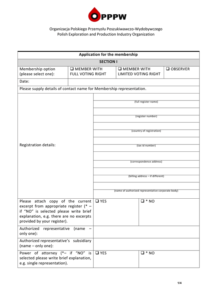 Organizacja Polskiego Przemysłu Poszukiwawczo-Wydobywczego Polish Exploration and Production Industry Organization Application for the membership SECTION I Membership option (please select one): MEMBER WITH FULL VOTING RIGHT MEMBER WITH LIMITED VOTING RIGHT OBSERVER Date: Please supply details of contact name for Membership representation. (full register name) (register number) (country of registration) Registration details: (tax id number) (correspondence address) (billing address – if different) (name of authorized representative corporate body) Please attach copy of the current YES excerpt from appropriate register (* – if “NO” is selected please write brief explanation, e.g. there are no excerpts provided by your register). * NO Authorized representative (name – only one): Authorized representative’s subsidiary (name – only one): Power of attorney (*– if “NO” is YES selected please write brief explanation, e.g. single representation). * NO 1/4 Logo (upload: jpg, png, gif version): YES NO Telephone: Fax: Email: Please return signed by authorized representative (-s) application form via email to: [email protected] and mail to: Organizacja Polskiego Przemysłu Poszukiwawczo–Wydobywczego – Związek Pracodawców ul. Biała 4 lok. 83/85, 00-895 Warszawa SECTION II Candidate description (text taped below will be published on the OPPPW website, as your company profile, please feel free to draft a short description here). Company Activity Area: History, Vision and Mission: Plans and Perspectives: Names of concessions that Company holds or holds interest to (if Company holds interest to concession (-s) in Poland through its subsidiary or JV please indicate its full register name and specify whether Company has majority of voting rights in such subsidiary / JV): Number of employees: 2/4 Extract from the By-Laws of Organization with respect to membership status: Section 3.02 To be admitted to the Organization, a candidate shall file a written application for admission. The application should include all information necessary to evaluate the applicant and should indicate the applicant’s name, legal form, permanent address and/or registered office, the number and place of registration and documents confirming the fulfilment of the conditions set out in sub-paragraphs a) and b) or c). The Organization’s Management Board shall accept a new Member in the form of an “accepting resolution” provided that to be accepted a candidate for a new Member must satisfy the necessary condition: a) be an employer in the meaning of the Polish Labour Code dated 26 June 1974; and one of the additional conditions: b) be granted the right to concessions for exploration, appraisal, production of hydrocarbons in Poland, or be a dominant entity within the meaning of the Accounting Act of 29 September 1994 (Journal of Laws of 2013 item 330 as amended) in relation to the entrepreneur being the concession holder referred to above (“Dominant Entity”); c) be a business entity providing operational or related engineering services to the oil and natural gas exploration and production industry in Poland. Candidates, who jointly meet the conditions a) and b) may acquire the rights of a Member with full voting right, and the candidates, who jointly meet the conditions a) and c) may acqu ire the rights of a Member with limited voting right, however, if the Dominant Entity is or becomes a Member, then the concession holder, being its subordinate entity, shall lose the right to be a Member. Candidates meeting the requirement of paragraph. 3.02 b) or c), but does not meeting the requirement of paragraph 3.02 a), not being a Member, may be given Observer status. Observers do not have voting rights and their representatives may not be the members of the Organization’s authorities. By -Laws provisions relating to the Members, taking into account the preceding sentence, shall apply to Observers. Observer status is acquired with proper application of the procedure described in paragraph 3.02 and lies within the exclusive competence of the Board of the Organization. Wyciąg ze statutu organizacji związany ze statusem członkowskim: Artykuł 3.02. Przyjęcie do Organizacji wymaga złożenia przez kandydata pisemnego wniosku. Wniosek ten powinien zawierać wszelkie informacje niezbędne do właściwej oceny wnioskodawcy, w tym n azwę (firmę) wnioskodawcy, formę prawną, stały adres lub adres siedziby, numer rejestracyjny i miejsce rejestracji oraz dokumenty potwierdzające spełnienie warunków określonych w punktach a) oraz b) lub c). Zarząd Organizacji przyjmuje nowego Członka w drodze „uchwały przyjmującej”, z tym, że aby zostać przyjętym, kandydat na Członka musi spełniać warunek konieczny: a) być pracodawcą w rozumieniu przepisów polskiego Kodeksu Pracy z 26 czerwca 1974 r.; oraz jeden z warunków dodatkowych: b) posiadać prawa do koncesji na poszukiwanie, rozpoznawanie, wydobywanie węglowodorów w Polsce, lub być podmiotem dominującym w rozumieniu ustawy z dnia 29 września 1994 roku o rachunkowości (Dz. U. z 2013 r. poz. 330 z późn. zm.) w stosunku do przedsiębiorcy będącego posiadaczem koncesji, o której mowa powyżej („Podmiot Dominujący”); c) być przedsiębiorcą dostarczającym usługi operacyjne lub techniczne dla branży poszukiwawczo - wydobywczej ropy i gazu ziemnego w Polsce. Kandydaci spełniający łącznie warunki a) i b) mogą nabyć prawa Członka z pełnym prawem głosu, a kandydaci spełniający łącznie warunki a) i c) mogą nabyć prawa Członka z ograniczonym prawem głosu, z tym że jeżeli Podmio t Dominujący jest bądź stanie się Członkiem, to posiadacz koncesji będący jego podmiotem podporządkowanym traci uprawnienie do bycia Członkiem. Kandydaci spełniający wymóg z pkt. 3.02 b) lub c), lecz nie spełniający wymogu z pkt. 3.02 a) nie będąc członki em mogą mieć nadany status obserwatora (dalej: „obserwatorzy”). Obse