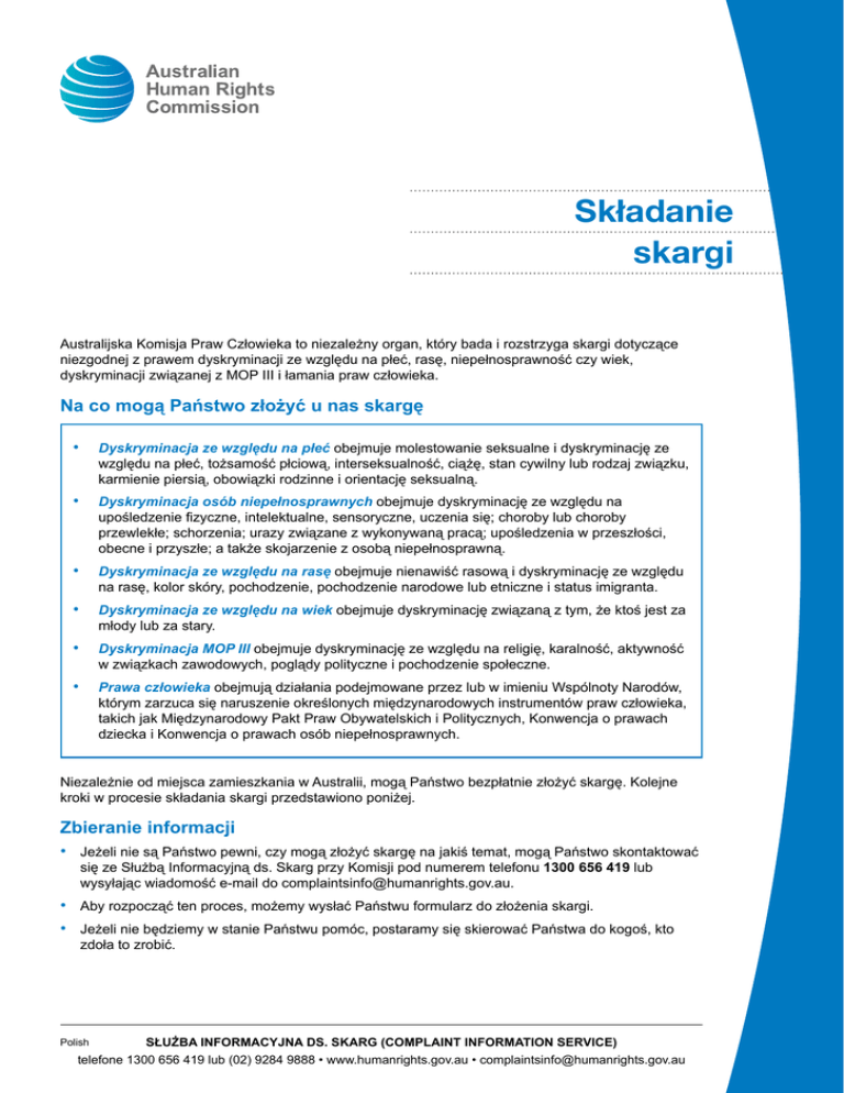 Składanie skargi Australijska Komisja Praw Człowieka to niezależny organ, który bada i rozstrzyga skargi dotyczące niezgodnej z prawem dyskryminacji ze względu na płeć, rasę, niepełnosprawność czy wiek, dyskryminacji związanej z MOP III i łamania praw człowieka. Na co mogą Państwo złożyć u nas skargę • Dyskryminacja ze względu na płeć obejmuje molestowanie seksualne i dyskryminację ze względu na płeć, tożsamość płciową, interseksualność, ciążę, stan cywilny lub rodzaj związku, karmienie piersią, obowiązki rodzinne i orientację seksualną. • Dyskryminacja osób niepełnosprawnych obejmuje dyskryminację ze względu na upośledzenie fizyczne, intelektualne, sensoryczne, uczenia się; choroby lub choroby przewlekłe; schorzenia; urazy związane z wykonywaną pracą; upośledzenia w przeszłości, obecne i przyszłe; a także skojarzenie z osobą niepełnosprawną. • Dyskryminacja ze względu na rasę obejmuje nienawiść rasową i dyskryminację ze względu na rasę, kolor skóry, pochodzenie, pochodzenie narodowe lub etniczne i status imigranta. • Dyskryminacja ze względu na wiek obejmuje dyskryminację związaną z tym, że ktoś jest za młody lub za stary. • Dyskryminacja MOP III obejmuje dyskryminację ze względu na religię, karalność, aktywność w związkach zawodowych, poglądy polityczne i pochodzenie społeczne. • Prawa człowieka obejmują działania podejmowane przez lub w imieniu Wspólnoty Narodów, którym zarzuca się naruszenie określonych międzynarodowych instrumentów praw człowieka, takich jak Międzynarodowy Pakt Praw Obywatelskich i Politycznych, Konwencja o prawach dziecka i Konwencja o prawach osób niepełnosprawnych. Niezależnie od miejsca zamieszkania w Australii, mogą Państwo bezpłatnie złożyć skargę. Kolejne kroki w procesie składania skargi przedstawiono poniżej. Zbieranie informacji • Jeżeli nie są Państwo pewni, czy mogą złożyć skargę na jakiś temat, mogą Państwo skontaktować się ze Służbą Informacyjną ds. Skarg przy Komisji pod numerem telefonu 1300 656 419 lub wysyłając wiadomość e-mail do [email protected]. • Aby rozpocząć ten proces, możemy wysłać Państwu formularz do złożenia skargi. • Jeżeli nie będziemy w stanie Państwu pomóc, postaramy się skierować Państwa do kogoś, kto zdoła to zrobić. Polish SŁUŻBA INFORMACYJNA DS. SKARG (COMPLAINT INFORMATION SERVICE) telefone 1300 656 419 lub (02) 9284 9888 • www.humanrights.gov.au • [email protected] Składanie skargi • Skarga musi mieć formę pisemną. Formularz mogą Państwo wypełnić i wysłać do nas pocztą lub faksem; istnieje też możliwość złożenia skargi online na naszej stronie internetowej. (www.humanrights.gov.au) • Mogą Państwo złożyć skargę w dowolnie wybranym przez siebie języku, a w razie potrzeby możemy również pomóc w jej napisaniu. • Do złożenia skargi nie potrzebują Państwo prawnika. • Jeżeli nie będziemy mogli zająć się sprawą, wyjaśnimy dlaczego. Rozpatrywanie skargi • Skontaktujemy się z Państwem, aby omówić skargę. Możemy też poprosić o dodatkowe informacje. • Ogólnie rzecz biorąc, Komisja skontaktuje się z osobą lub organizacją, na którą się Państwo skarżą, przekaże im kopię Państwa skargi i poprosi o uwagi i inne ważne informacje. Skontaktujemy się z Państwem i przekażemy, co powiedzieli w odpowiedzi na skargę. • W niektórych przypadkach możemy zdecydować, że nie będziemy się dalej zajmowali się Państwa skargą. Jeżeli tak się stanie, wyjaśnimy tego powody. • Możemy porozmawiać z Państwem o próbie rozwiązania problemu w postępowaniu pojednawczym. Postępowanie pojednawcze • Postępowanie pojednawcze oznacza, że staramy się pomóc Państwu i osobie lub organizacji, na którą się Państwo skarżą, znaleźć sposób na rozstrzygnięcie sprawy. • Postępowanie pojednawcze może mieć formę spotkania twarzą w twarz, nazywanego „konferencją pojednawczą“, lub konferencji telefonicznej. W niektórych przypadkach skargi mogą być rozwiązane w drodze wymiany listów lub poprzez wymianę wiadomości telefonicznie lub e-mailowo za pośrednictwem mediatora. • Skargi mogą być rozstrzygane na wiele różnych sposobów. Na przykład, poprzez przeprosiny, zmianę zasad postępowania lub rekompensatę. Możliwe postępowanie sądowe – dyskryminacja ze względu na płeć, niepełnosprawność, rasę i wiek • Komisja nie jest uprawniona do stwierdzenia, czy doszło do niezgodnej z prawem dyskryminacji. • Jeżeli Państwa skarga nie zostanie rozstrzygnięta lub z jakiegoś powodu jej rozpatrywanie zostanie wstrzymane, mogą Państwo wnieść sprawę do sądu. Sąd może postanowić o wystąpieniu niezgodnego z prawem aktu dyskryminacji. • Od chwili, kiedy Komisja sfinalizuje skargę, mają Państwo 60 dni na złożenie wniosku w Australijskim Federalnym Sądzie Okręgowym lub w Australijskim Sądzie Federalnym. • Komisja nie może w Państwa imieniu zgłosić sprawy do sądu ani reprezentować Państwa w sądzie. • Jeżeli chcą Państwo iść do sądu, możliwe, że trzeba będzie porozmawiać z adwokatem albo radcą prawnym. Polish SŁUŻBA INFORMACYJNA DS. SKARG (COMPLAINT INFORMATION SERVICE) telefone 1300 656 419 lub (02) 9284 9888 • www.humanrights.gov.au • [email protected] Decyzja/Raport – dyskryminacja w związku z MOP III i prawa człowieka • Jeżeli skarga nie zostanie rozstrzygnięta albo z jakiegoś powodu jej rozpatrywanie zostanie wstrzymane, przewodniczący Komisji zdecyduje, czy doszło do dyskryminacji w rozumieniu MOP III lub do naruszenia praw człowieka. Może to oznaczać, że przewodniczący przeprowadzi publiczne przesłuchanie, podczas którego każda strona przedstawi swoją wersję wydarzeń i odpowie na pytania. • Jeżeli przewodniczący uzna, że doszło do dyskryminacji lub naruszenia praw człowieka, powiadomi o sprawie fed