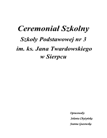 Ceremoniał Szkolny Szkoły Podstawowej nr 3 im. ks. Jana Twardowskiego w Sierpcu Opracowały: Jolanta Chyżyńska Joanna Guzowska Spis treści: Wstęp Symbole Szkoły……………………………………..........................…...............…… 1 Patron Szkoły……………………………………......................................… 1 Sztandar Szkoły………………...……............................…………......……. 3 Pieśń Szkoły…………………………...........................………………...…. 8 Logo Szkoły……………………………...........................……………......... 9 Pasowanie na ucznia…………………………………...............................… 9 Pożegnanie absolwentów………..........................……………………...…. 10 Apele i uroczystości…………………..........................……………...……. 10 Dekoracja budynku szkolnego flagami państwowymi….............................. 11 Wstęp Głównym zadaniem szkoły jest nauczanie wychowanie młodych ludzi. Ponieważ znajomość savoir vivre i kultury języka jest podstawą funkcjonowania w społeczeństwie, obok wiedzy i umiejętności, przekazywanych na zajęciach lekcyjnych i pozalekcyjnych, należy uczyć dzieci i młodzież zasad postępowania w różnych miejscach i sytuacjach, poczynając od reguł dotyczących świąt i apeli. Zbiorem ustanowionych i obowiązujących w szkole norm zachowania się w czasie uroczystości szkolnych jest Ceremoniał Szkolny, który stanowi integralną część tradycji i harmonogramu pracy tej placówki. Opisuje symbole szkoły i formy celebracji sztandaru. Zadaniem ceremoniału jest również pomoc w organizacji ślubowań i apeli. Symbole Szkoły 1. Szkoła Podstawowa nr 3 im. ks. Jana Twardowskiego w Sierpcu posiada: a. Patrona – ks. Jana Twardowskiego b. Sztandar c. Pieśń Szkoły d. Logo Szkoły e. Ceremoniał Szkolny Patron Szkoły Ks. Jan Twardowski 1915-2006 Jan Twardowski (ur. 1 czerwca 1915 r. w Warszawie, zm. 18 stycznia 2006 r. w Warszawie) – ksiądz rzymskokatolicki, prałat, filolog polski, poeta, przedstawiciel współczesnej liryki religijnej. Uczęszczał do Gimnazjum im. Tadeusza Czackiego w Warszawie, maturę zdał w roku 1935. W 1937 r. ukazał się pierwszy tomik jego wierszy pt. Powrót Andersena nawiązujący do poetyki Skamandra. W tym samym roku rozpoczął studia polonistyczne na Uniwersytecie Warszawskim, które ukończył dopiero po wojnie w 1947 r. W czasie II wojny światowej, podczas której zaginął cały jego wcześniejszy dorobek poetycki, był żołnierzem Armii Krajowej, uczestniczył w powstaniu warszawskim. Wskutek przeżyć wojennych, w tym zniszczenia jego domu rodzinnego, w 1943 r. postanowił zostać księdzem. W trakcie wojny w marcu 1945 r. zaczął naukę w tajnym Seminarium Duchownym w Warszawie. Naukę w seminarium kontynuował z przerwami do 1948 r., kiedy to 4 lipca przyjął święcenia kapłańskie. W tym też roku uzyskał tytuł magistra filologii polskiej za pracę "Godzina myśli" . Zaraz po studiach w seminarium przybył do parafii w Żbikowie k. Pruszkowa, gdzie był wikarym przez trzy lata. Zajmował się nauczaniem religii w szkole specjalnej. Od 1960 r. aż do emerytury był rektorem kościoła sióstr Wizytek w Warszawie, gdzie głosił kazania dla dzieci, którym później zadedykował m.in. zbiory: Zeszyt w kratkę oraz Patyki i patyczki. Wcześniej, bo już pod koniec 1945 r., powrócił do publikowania wierszy. Jego twórczość trafiła wówczas m.in. na łamy Tygodnika Powszechnego. Wielką popularność przyniósł mu wydany w 1970 r. tom Znaki ufności. W 1980 roku uhonorowano Twardowskiego nagrodą PEN Clubu im. Roberta Gravesa za całokształt twórczości, w 1996 roku Orderem Uśmiechu, w 2000 roku nagrodą IKAR oraz Dziecięcą Nagrodą SERCA a rok później TOTUS, która zwana jest również "katolickim Noblem". W 1999 r. Katolicki Uniwersytet Lubelski przyznał mu tytuł doktora honoris causa. Zmarł wieczorem 18 stycznia 2006 r. w Warszawie. Pochowany w krypcie dla zasłużonych Świątyni Opatrzności Bożej, zgodnie z życzeniem prymasa Polski kardynała Józefa Glempa, a wbrew ostatniej woli księdza Twardowskiego, który chciał być pochowany na warszawskich Powązkach. Wszyscy jesteśmy zobowiązani, aby w naszych działaniach wychowawczych zaszczepić idee i filozofię życiową księdza Jana Twardowskiego - naszego Patrona. Liryka księdza Twardowskiego traktuje zarówno o Bogu, jak i o ludziach. Dobrze widoczne są liczne odwołania i metafory dotyczące przyrody (także jako pochwała stworzenia). Wiersze tego autora często, poprzez apostrofy i inne środki stylistyczne, mają charakter modlitewny (np. słowa Boże po stokroć święty, Mocny i uśmiechnięty w "Suplikacjach"). Sztandar Szkoły Sztandar Szkolny jest symbolem Polski, symbolem Małej Ojczyzny, jaką jest szkoła i jej najbliższe środowisko. Uroczystości z udziałem sztandaru wymagają powagi zachowania, a przechowywanie, transport i przygotowanie sztandaru do prezentacji właściwych postaw jego poszanowania. 1. Sztandar Jest przechowywany w gabinecie wicedyrektora szkoły w zamkniętej gablocie. W tym samym miejscu znajdują się insygnia pocztu sztandarowego. Opis Sztandaru Płat Sztandaru stanowi tkanina o kształcie prostokąta o wymiarach 110cm x 100cm. Jest przymocowany do drzewca, zakończonego metalową głowicą w formie orła w koronie. Tkanina obszyta jest złotą taśmą i wykończona złotymi frędzlami. Awers – główna strona sztandaru wykonana jest z tkaniny koloru czerwonego, na której centralnie umiejscowiony jest wizerunek orła białego ( wzór jest zgodny z orłem ustalonym dla godła Rzeczypospolitej ). Orzeł jest wykonany haftem maszynowym nicią srebrną. Korona, dziób i pazury haftowane są nicią złotą. Rewers – lewa strona płata sztandaru jest koloru białego. W centrum zn