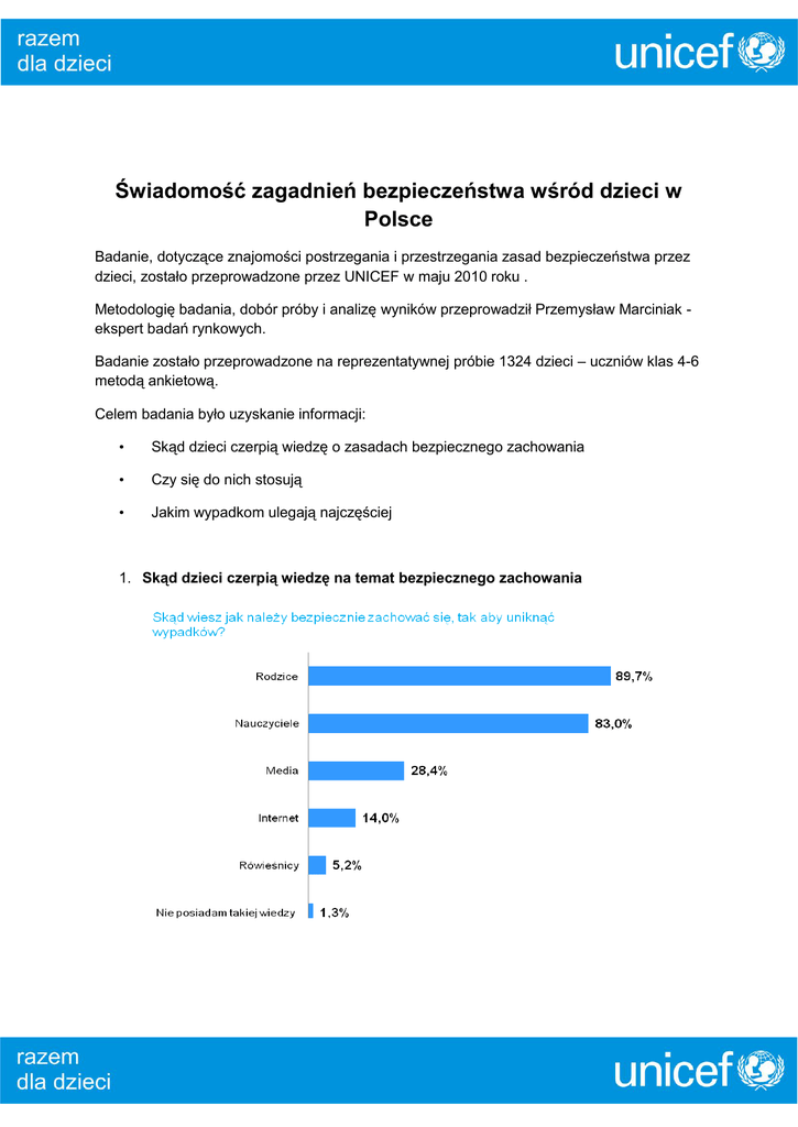 Świadomość zagadnień bezpieczeństwa wśród dzieci w Polsce Badanie, dotyczące znajomości postrzegania i przestrzegania zasad bezpieczeństwa przez dzieci, zostało przeprowadzone przez UNICEF w maju 2010 roku . Metodologię badania, dobór próby i analizę wyników przeprowadził Przemysław Marciniak ekspert badań rynkowych. Badanie zostało przeprowadzone na reprezentatywnej próbie 1324 dzieci – uczniów klas 4-6 metodą ankietową. Celem badania było uzyskanie informacji: • Skąd dzieci czerpią wiedzę o zasadach bezpiecznego zachowania • Czy się do nich stosują • Jakim wypadkom ulegają najczęściej 1. Skąd dzieci czerpią wiedzę na temat bezpiecznego zachowania Ponad 40% rodziców rzadko rozmawia ze swoimi dziećmi na tematy związane z bezpieczeństwem Najczęściej o bezpieczeństwie dzieci rozmawiają na godzinie wychowawczej i zajęciach technicznych Na jakich lekcjach w szkole mówicie o bezpieczeństwie i zapobieganiu wypadkom? godzina wychowawcza 67,9% zajęcia techniczne 51,5% wychowanie fizyczne 28,5% przyroda na żadnej 26,0% 2,6% 2. Przestrzeganie zasad bezpieczeństwa Ponad 30% dzieci podczas jazdy samochodem nie siedzi na tylnym siedzeniu. Czy podczas jazdy samochodem siedzisz na tylnym siedzeniu? 3,0% tak 31,2% nie 65,8% nie jeżdzę samochodem Ponad 9% dzieci nie zapina pasów podczas jazdy samochodem. Czy zapinasz pasy przed jazdą samochodem? 9,2% 2,8% 88,0% Tak Nie Nie jeżdżę samochodem Podczas gdy 9,5% dzieci deklaruje, że w ciągu ostatniego roku uległo wypadkowi samochodowemu. Ponad 78% dzieci nie zakłada kasku jeżdżąc rowerem. Czy wsiadając na rower zakładasz kask? 3,5% 17,9% Tak Nie Nie jeżdżę rowerem 78,7% Podczas gdy 51,4% dzieci deklaruje, że w ciągu ostatniego roku miało wypadek rowerowy. Ponad 87% dzieci przechodzi przez jezdnię w wyznaczonych miejscach Czy przechodzisz przez jezdnię na pasach i przejściach dla pieszych? 12,7% tak nie 87,3% Podczas gdy 9,6% dzieci deklaruje, że w ciągu ostaniego roku miało wypadek jako pieszy. Ponad 85% dzieci zażywa lekarstwa pod nadzorem osoby dorosłej. Czy zażywasz lekarstwa pod nadzorem osoby dorosłej? 14,3% tak nie 85,7% Ponad 35% dzieci miewa kontakt ze szkodliwymi dla zdrowia substancjami. Jak często dotykasz lub bawisz się substancjami, które mogą być szkodliwe dla zdrowia? 4,9% nigdy 30,8% rzadko 64,3% często Podczas gdy 9,1% dzieci deklaruje, że w ciągu ostatniego roku uległo zatruciu. Tylko niecałe 39% dzieci nigdy nie bawi się ogniem Jak często bawisz się zapałkami, zapalniczkami, świecami, fajerwerkami lub ogniem? 15,6% 38,9% nigdy rzadko często 45,5% Podczas gdy 48,4% dzieci deklaruje, że w ciągu ostaniego roku uległo oparzeniu. Prawie 45% dzieci kąpie się nie będąc zawsze pod opieką osoby dorosłej. Czy gdy pływasz lub bawisz się w wodzie to przebywasz pod opieką osoby dorosłej? 9,4% nigdy 55,2% 35,4% rzadko często Podczas gdy 14,6% dzieci deklaruje, że w ciągu ostatniego roku uległo podtopieniu. Prawie 98% dzieci deklaruje, że zna numery alarmowe. Czy znasz numery alarmowe, pod które należy dzwonić kiedy dojdzie do wypadku? 2,2% Tak Nie 97,8% 94% dzieci wie gdzie w domu znajdują się środki pierwszej pomocy. Czy wiesz, gdzie w domu znajdują się środki pierwszej pomocy? 3,8% 2,1% Tak Nie 94,1% U nas w domu nie ma takich środków Do jakich wypadków dochodzi najczęściej Jakim wypadkom dzieci ulegają najczęściej? Zatrucie 9,1% Podczas jazdy … 9,5% Jako pieszy 9,6% Prace w gospodarstwie… Podtopienie Porażenie prądem 12,8% 14,6% 15,6% Upadek z wysokości 47,8% Oparzenie 48,4% Podczas jazdy rowerem 51,4% Więcej informacji : Ewa Falkowska, Dyrektor ds. Advocacy, [email protected], 22 56 80 330,509 224 600 Małgorzata Połowniak, Specjalista ds. Advocacy, [email protected], 22 56 80 332