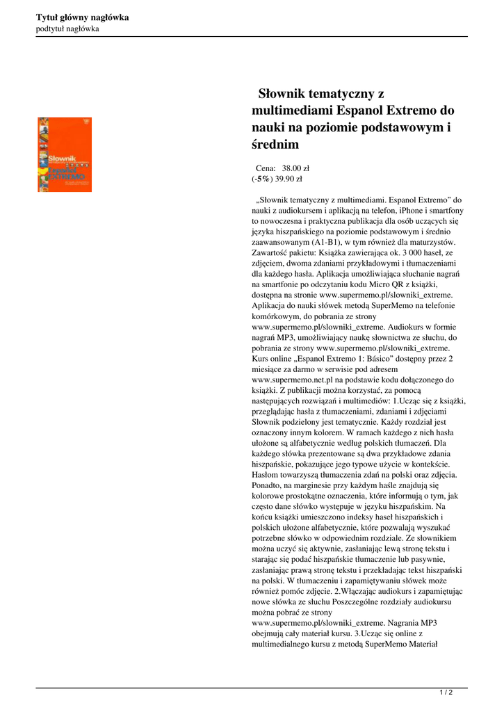 Tytuł główny nagłówka podtytuł nagłówka Słownik tematyczny z multimediami Espanol Extremo do nauki na poziomie podstawowym i średnim Cena: 38.00 zł (-5%) 39.90 zł „Słownik tematyczny z multimediami. Espanol Extremo” do nauki z audiokursem i aplikacją na telefon, iPhone i smartfony to nowoczesna i praktyczna publikacja dla osób uczących się języka hiszpańskiego na poziomie podstawowym i średnio zaawansowanym (A1-B1), w tym również dla maturzystów. Zawartość pakietu: Książka zawierająca ok. 3 000 haseł, ze zdjęciem, dwoma zdaniami przykładowymi i tłumaczeniami dla każdego hasła. Aplikacja umożliwiająca słuchanie nagrań na smartfonie po odczytaniu kodu Micro QR z książki, dostępna na stronie www.supermemo.pl/slowniki_extreme. Aplikacja do nauki słówek metodą SuperMemo na telefonie komórkowym, do pobrania ze strony www.supermemo.pl/slowniki_extreme. Audiokurs w formie nagrań MP3, umożliwiający naukę słownictwa ze słuchu, do pobrania ze strony www.supermemo.pl/slowniki_extreme. Kurs online „Espanol Extremo 1: Básico” dostępny przez 2 miesiące za darmo w serwisie pod adresem www.supermemo.net.pl na podstawie kodu dołączonego do książki. Z publikacji można korzystać, za pomocą następujących rozwiązań i multimediów: 1.Ucząc się z książki, przeglądając hasła z tłumaczeniami, zdaniami i zdjęciami Słownik podzielony jest tematycznie. Każdy rozdział jest oznaczony innym kolorem. W ramach każdego z nich hasła ułożone są alfabetycznie według polskich tłumaczeń. Dla każdego słówka prezentowane są dwa przykładowe zdania hiszpańskie, pokazujące jego typowe użycie w kontekście. Hasłom towarzyszą tłumaczenia zdań na polski oraz zdjęcia. Ponadto, na marginesie przy każdym haśle znajdują się kolorowe prostokątne oznaczenia, które informują o tym, jak często dane słówko występuje w języku hiszpańskim. Na końcu książki umieszczono indeksy haseł hiszpańskich i polskich ułożone alfabetycznie, które pozwalają wyszukać potrzebne słówko w odpowiednim rozdziale. Ze słownikiem można uczyć się aktywnie, zasłaniając lewą stronę tekstu i starając się podać hiszpańskie tłumaczenie lub pasywnie, zasłaniając prawą stronę tekstu i przekładając tekst hiszpański na polski. W tłumaczeniu i zapamiętywaniu słówek może również pomóc zdjęcie. 2.Włączając audiokurs i zapamiętując nowe słówka ze słuchu Poszczególne rozdziały audiokursu można pobrać ze strony www.supermemo.pl/slowniki_extreme. Nagrania MP3 obejmują cały materiał kursu. 3.Ucząc się online z multimedialnego kursu z metodą SuperMemo Materiał 1/2 Tytuł główny nagłówka podtytuł nagłówka słownika dostępny jest również jako kurs online „Espanol Extremo 1: Básico” w serwisie e-learningowym dostępnym pod adresem www.supermemo.net.pl. Na podstawie kodu dołączonego do książki użytkownik może uczyć się online przez 2 miesiące za darmo. 4.Po wgraniu nowych słówek na komórkę – powtarzając je metodą SuperMemo Słówka można powtarzać i utrwalać na telefonie komórkowym w dowolnym miejscu i czasie, łatwo i wygodnie. Udostępniliśmy aplikacje do nauki na ponad 700 modeli telefonów wyposażonych w Javę, do pobrania ze strony www.supermemo.pl/slowniki_extreme. 5.Słuchając nagrań na iPhonie lub smartfonie Dzięki zawartym w książce kodom kreskowym można posłuchać nagrań haseł i zdań na iPhonie lub smartfonie z systemem Android. W tym celu należy pobrać aplikację ze strony www.supermemo.pl/ slowniki_extreme. Następnie wystarczy zeskanować kod na wybranej stronie w książce, a teksty i nagrania z niej pojawią się w smartfonie. Wymagania sprzętowe: - dla aplikacji „Czytnik kodów Micro QR” - iPhone w wersji 3GS i nowszy, smartfony z systemem operacyjnym Android posiadające kamerę oraz opcję autofokus, - dla aplikacji „Słownik na komórkę” - telefon poprawnie skonfigurowany do odbierania wiadomości MMS zawierających aplikację Java, - dla audio kursu - dowolny odtwarzacz MP3 (w tym CD/MP3 i DVD/MP3) oraz modele telefonów komórkowych obsługujące format MP3. 2/2 Powered by TCPDF (www.tcpdf.org)