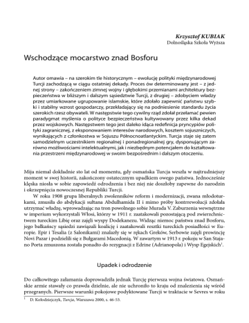 Krzysztof KUBIAK Dolnośląska Szkoła Wyższa Wschodzące mocarstwo znad Bosforu Autor omawia – na szerokim tle historycznym – ewolucję polityki międzynarodowej Turcji zachodzącą w ciągu ostatniej dekady. Proces ów determinowany jest – z jednej strony – zakończeniem zimnej wojny i głębokimi przemianami architektury bezpieczeństwa w bliższym i dalszym sąsiedztwie Turcji, z drugiej – zdobyciem władzy przez umiarkowane ugrupowanie islamskie, które zdołało zapewnić państwu szybki i stabilny wzrost gospodarczy, przekładający się na podniesienie standardu życia szerokich rzesz obywateli. W następstwie tego cywilny rząd zdołał przełamać pewien paradygmat myślenia o polityce bezpieczeństwa kultywowany przez kilka dekad przez wojskowych. Następstwem tego jest daleko idąca redefinicja pryncypiów polityki zagranicznej, z eksponowaniem interesów narodowych, kosztem sojuszniczych, wynikających z członkostwa w Sojuszu Północnoatlantyckim. Turcja staje się zatem samodzielnym uczestnikiem regionalnej i ponadregionalnej gry, dysponującym zarówno możliwościami intelektualnymi, jak i niezbędnym potencjałem do kształtowania przestrzeni międzynarodowej w swoim bezpośrednim i dalszym otoczeniu. Mija niemal dokładnie sto lat od momentu, gdy osmańska Turcja weszła w najtrudniejszy moment w swej historii, zakończony ostatecznym upadkiem owego państwa. Jednocześnie klęska niosła w sobie zapowiedź odrodzenia i bez niej nie doszłoby zapewne do narodzin i okrzepnięcia nowoczesnej Republiki Turcji. W roku 1908 grupa liberalnych zwolenników reform i modernizacji, zwana młodoturkami, zmusiła do abdykacji sułtana Abdulhamida II i mimo próby kontrrewolucji zdołała utrzymać władzę, wprowadzając na tron powolnego sobie Murada V. Zaburzenia wewnętrzne w imperium wykorzystali Włosi, którzy w 1911 r. zaatakowali pozostającą pod zwierzchnictwem tureckim Libię oraz zajęli wyspy Dodekanezu. Widząc niemoc państwa znad Bosforu, jego bałkańscy sąsiedzi zawiązali koalicję i zaatakowali resztki tureckich posiadłości w Europie. Epir i Tesalia (z Salonikami) znalazły się w rękach Greków, Serbowie zajęli prowincję Novi Pazar i podzielili się z Bułgarami Macedonią. W zawartym w 1913 r. pokoju w San Stajano Porta zmuszona została ponadto do rezygnacji z Edrine (Adrianopola) i Wysp Egejskich1. Upadek i odrodzenie Do całkowitego załamania doprowadziła jednak Turcję pierwsza wojna światowa. Osmańskie armie stawały co prawda dzielnie, ale nie uchroniło to kraju od znalezienia się wśród przegranych. Pierwsze warunki pokojowe podyktowane Turcji w traktacie w Sevres w roku 1 D. Kołodziejczyk, Turcja, Warszawa 2000, s. 46-53. ARTYKUŁY 41 1920 były wyjątkowo ostre: prócz utraty wszystkich „nietureckich” prowincji (Arabia, Mezopotamia, Palestyna, Syria) państwo to spychano niejako w głąb Anatolii, gdyż wybrzeża Azji Mniejszej miały się dostać pod władzę Grecji i Włoch. Rozczłonkowano ponadto Anatolię, zgadzając się na powstanie niepodległego Kurdystanu i Armenii. Mimo iż szczątkowy rząd osmański warunki owe zaakceptował, nigdy ich nie zrealizowano. Turecki ruch nacjonalistyczny, na którego czele stanął Mustafa Kemal, zdołał wypracować jednolitą płaszczyznę polityczną i skutecznie poprowadzić wojnę. Czerpiąc pomoc od Sowietów, nacjonaliści rozbili i wyparli z Azji greckie wojska inwazyjne, zmusili do wycofania się Włochów i Francuzów, udaremnili Brytyjczykom utrzymanie trwałych punktów oparcia nad Morzem Marmara. W traktacie w 1923 r. zawartym w Lozannie mocarstwa zmuszone były do zaakceptowania stanu faktycznego, który wytworzył się w toku tureckiej wojny o niepodległość2. Ze zmagań lat 1914-1923 Turcja wyszła jako państwo niewspółmiernie bardziej homogeniczne pod względem etnicznym niż przed wybuchem Wielkiej Wojny, ale również wyniszczone, zrujnowane, pozbawione nowoczesnej infrastruktury i strukturalnie zapóźnione cywilizacyjnie. Dzięki śmiałej, choć bez wątpienia autokratycznie narzuconej społeczeństwu, wizji reformatorów skupionych wokół Mustafy Kemala rozpoczęto jednak, często sięgając po środki wyjątkowo drastyczne, proces forsownej modernizacji. W Turcji zmieniło się niemal wszystko. Zniesiono sułtanat (1922) i kalifat, proklamując republikę (1923), wprowadzono alfabet łaciński zamiast arabskiego, gregoriański kalendarz oraz metryczny system miar i wag, państwo zaczęło ingerować w gospodarkę zarówno w dziedzinie produkcji przemysłowej, jak i rolnej. Rozwiązano bractwa religijne i skonfiskowano ich majątki, prawo zwyczajowe i islamskie zastąpiły nowe kodeksy: cywilny, karny i handlowy – oparte na wzorach zachodnich, kobietom przyznano prawa wyborcze. Turkom – pod groźbą drakońskich kar – nakazano przyjęcie nazwisk (sam Kemal Mustafa przyjął miano Atatürka – „ojca Turków”) oraz noszenie europejskiej odzieży, w tym nakryć głowy zamiast tradycyjnych fezów. Ideologią państwową stał się kemalizm, którego zasadniczymi filarami były: republikanizm, ludowładztwo, sekularyzm (czyli świeckość państwa), reformizm (czyli unowocześnienie państwa), etatyzm i nacjonalizm. Należy przy tym podkreślić, że nacjonalizm w ujęciu kemalistowskim nie miał charakteru rasistowskiego, opierał się raczej na dumie z przynależności do narodu tureckiego3. Turcja Atatürka (pełnił urząd do śmierci w 1938 roku, kiedy to schedę po nim przejął Ismet Inonu) j jego następców była państwem monopartyjnym, dyktaturą, w której władzę dzierżyła założona w 1923 roku Partia Ludowo-Republikańska. Odnoszono jednak znaczne sukcesy w dziele modernizacji państwa, starając jednocześnie nie popełnić błędu roku 1914 i uniknąć uwikłania w kolejną wojnę. Nie przeszkodziło to jednak Ankarze ciągnąć korzyści ze wzrostu napięcia międzynarodowego, na przykład poprzez doprowadzenia do cesji na s