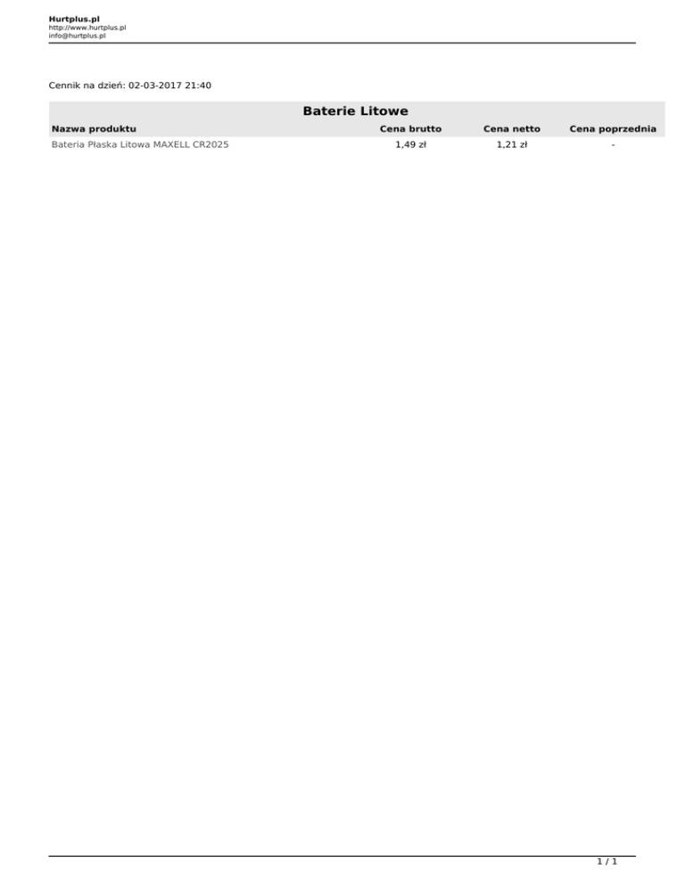 Hurtplus.pl http://www.hurtplus.pl [email protected] Cennik na dzień: 02-03-2017 21:40 Baterie Litowe Nazwa produktu Bateria Płaska Litowa MAXELL CR2025 Cena brutto Cena netto Cena poprzednia 1,49 zł 1,21 zł - 1/1 Powered by TCPDF (www.tcpdf.org)
