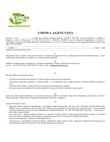 UMOWA AGENCYJNA Zawarta w dniu ........................ w Krakowie pomiędzy Biurem Podróży CZAJKA TRAVEL Joanna Biernacka z siedzibą w Krakowie przy ul. Basztowej 3/3, NIP 685-216-22-22, REGON 121489042, wpis do Rejestru Organizatorów Turystyki i Pośredników Turystycznych Marszałka Woj. Małopolskiego nr Z/12/2012, reprezentowanym przez Joannę Biernacką zwanym dalej ORGANIZATOREM a .................................................................................................................................................................................. z siedzibą w ..............................................................................................................................................................., zwanym dalej Agentem, reprezentowanym przez ...................................................................................................... §1. Organizator zleca Agentowi stałą sprzedaż miejsc w imprezach organizowanych, współorganizowanych i koordynowanych, Agent zobowiązuje się sprzedawać te imprezy we własnym biurze (biurach). §2. Grafiki wszystkich imprez znajdują się w siedzibie Organizatora. Numery telefonów do dyspozycji: tel./fax – 12-430-01-09; kom. 506-965-755. Adres e-mail : [email protected] §3. Do obowiązków Organizatora należy: - systematyczne dostarczanie Agentowi wykazu usług przeznaczonych do sprzedaży; - szczegółowe określenie charakteru i rodzaju usługi, a w szczególności trasy, środka transportu, terminu realizacji, programu i ceny; określenie ilości miejsc w imprezach przeznaczonych do sprzedaży przez Agenta; przesyłanie agentowi mailem potwierdzeń przyjętych rezerwacji, klientów zapisanych przez agenta - §4. Agent nie ponosi odpowiedzialności za wykonanie usług lub wadliwe wykonanie usług przez Organizatora oraz szkody wynikłe z dostarczenia przez Organizatora niepełnych lub błędnych informacji o usługach. §5. Agent zobowiązuje się do: - - - zgłaszania miejsc wyłącznie sprzedanych, tj. gdy Klient wpłacił zaliczkę min. 300 zł/os. przy wyjazdach na Krym (Saki), min. 400zł/os. przy wyjazdach na Krym (Jałta), min.150zł/os. przy wyjazdach weekendowych i sylwestrowych . Kwota zaliczki winna być przelana w całości na konto Organizatora w Banku Millenium 10 1160 2202 0000 0001 8436 4547 w terminie do 7 dni od daty wpłaty Klienta przy rezerwacji – podania pełnych danych, tzn. nazwiska Klienta, adresu, numeru paszportu (dotyczy imprez, na których powyższe dane są wymagane). Rezerwacje nie spełniające powyższych wymogów nie będą przyjmowane; dokonywania sprzedaży w oparciu o druki Organizatora; informowania o sprzedanych miejscach faksem, telefonicznie bądź mailowo (przy zgłoszeniu telefonicznym konieczne jest potwierdzenie mailem lub faksem do 3 dni od daty dokonania rezerwacji); - 1. 2. 3. w przypadku rezygnacji Klienta z zamówionych usług – przekazania Klientowi sumy pomniejszonej o kwotę podaną w dokumencie „Warunki uczestnictwa - Krym”, a kwotę potrącenia przesłać na konto Organizatora (za anulowane miejsce nie przysługuje Agentowi prowizja). §6. Klient wykupujący imprezę w siedzibie Agenta powinien zapoznać się z „Warunkami uczestnictwa - Krym” i potwierdzić ich akceptację własnoręcznym podpisem na umowie. Zasady płatności i anulacji podane są w „Warunkach uczestnictwa - Krym”. W szczególnych przypadkach terminy i warunki anulacji mogą być korygowane za obopólnym porozumieniem stron. §7. Agent przyjmuje do wiadomości, że brak pełnej wpłaty na konto Organizatora w terminie określonym w warunkach sprzedaży (nie później niż 21 dni przed rozpoczęciem imprezy) spowoduje niedopuszczenie Klienta do udziału w imprezie, a za wszelkie reklamacje z tego tytułu będzie odpowiadał Agent. §8. Prowizja dla Agenta wynosi 10 % ceny podstawowej. Cena ubezpieczenia, opłata klimatyczna, dopłaty do wyżywienia czy antenek nie wchodzą w kwotę wyliczenia prowizji Agenta. §9. W związku z wdrożeniem w życie Ustawy o usługach turystycznych stanowiącej, iż przychodem Organizatora imprez jest jej pełny koszt łącznie z pobraną przez Agenta prowizją, Agent zobowiązany jest do niezwłocznego wystawienia faktury VAT lub rachunku uproszczonego Organizatorowi na przysługującą prowizję. Pobrana prowizja stanowi jedyny przychód Agenta. Na życzenie Klienta fakturę (rachunek uproszczony) wystawia Organizator imprezy i przesyła ją na adres Agenta lub Klienta. W takim przypadku Agent zobowiązany jest do przesłania pełnych danych Klienta, łącznie z upoważnieniem do wystawienia faktury VAT bez podpisu odbiorcy. §10. Umowa niniejsza została zawarta na czas nieokreślony. Zmiana umowy wymaga formy pisemnej pod rygorem nieważności. §11. Załączniki do niniejszej umowy stanowią : wzór „Umowy-zgłoszenia – Krym” oraz „Warunki uczestnictwa - Krym” §12. W sprawach nie uregulowanych niniejszą umową znajdują zastosowanie odpowiednie przepisy Kodeksu Cywilnego. §13. Wszelkie spory mogące wyniknąć z realizacji niniejszej umowy rozstrzygać będą sądy powszechne właściwe dla siedziby Organizatora. §14. Umowę sporządzono w dwóch jednobrzmiących egzemplarzach, po jednym dla każdej ze stron. §15. Wyrażamy zgodę na honorowanie faktur Biura Podróży CZAJKA Travel bez podpisu osoby upoważnionej do jej otrzymywania. Nasz numer NIP: ................................... (Agent) Wyrażamy zgodę na honorowanie faktur ….................................... (Agent), bez podpisu osoby upoważnionej do jej otrzymywania. Nasz numer NIP: 685-216-22-22 (Organizator) CZAJKA TRAVEL Joanna Biernacka , ul. Basztowa 3/3; Kraków 31-134 Agent Organizator