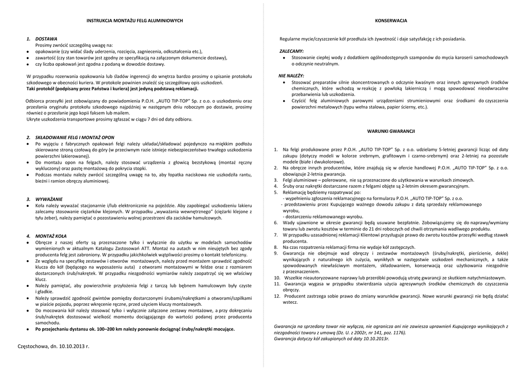 INSTRUKCJA MONTAŻU FELG ALUMINIOWYCH KONSERWACJA 1. DOSTAWA Prosimy zwrócić szczególną uwagę na: opakowanie (czy widać ślady uderzenia, rozcięcia, zagniecenia, odkształcenia etc.), zawartość (czy stan towarów jest zgodny ze specyfikacją na załączonym dokumencie dostawy), czy liczba opakowań jest zgodna z podaną w dowodzie dostawy. Regularne mycie/czyszczenie kół przedłuża ich żywotność i daje satysfakcję z ich posiadania. W przypadku rozerwania opakowania lub śladów ingerencji do wnętrza bardzo prosimy o spisanie protokołu szkodowego w obecności kuriera. W protokole powinien znaleźć się szczegółowy opis uszkodzeń. Taki protokół (podpisany przez Państwa i kuriera) jest jedyną podstawą reklamacji. NIE NALEŻY: Stosować preparatów silnie skoncentrowanych o odczynie kwaśnym oraz innych agresywnych środków chemicznych, które wchodzą w reakcję z powłoką lakierniczą i mogą spowodować nieodwracalne przebarwienia lub uszkodzenia. Czyścić felg aluminiowych parowymi urządzeniami strumieniowymi oraz środkami do czyszczenia powierzchni metalowych (typu wełna stalowa, papier ścierny, etc.). ZALECAMY: Stosowanie ciepłej wody z dodatkiem ogólnodostępnych szamponów do mycia karoserii samochodowych o odczynie neutralnym. Odbiorca przesyłki jest zobowiązany do powiadomienia P.O.H. „AUTO TIP-TOP” Sp. z o.o. o uszkodzeniu oraz przesłania oryginału protokołu szkodowego najpóźniej w następnym dniu roboczym po dostawie, prosimy również o przesłanie jego kopii faksem lub mailem. Ukryte uszkodzenia transportowe prosimy zgłaszać w ciągu 7 dni od daty odbioru. WARUNKI GWARANCJI 2. SKŁADOWANIE FELG I MONTAŻ OPON Po wyjęciu z fabrycznych opakowań felgi należy układać/składować pojedynczo na miękkim podłożu skierowane stroną czołową do góry (w przeciwnym razie istnieje niebezpieczeństwo trwałego uszkodzenia powierzchni lakierowanej). Do montażu opon na felgach, należy stosować urządzenia z głowicą bezstykową (montaż ręczny wykluczony) oraz pastę montażową do pokrycia stopki. Podczas montażu należy zwrócić szczególną uwagę na to, aby łopatka naciskowa nie uszkodziła rantu, bieżni i ramion obręczy aluminiowej. 3. WYWAŻANIE Koła należy wyważać stacjonarnie i/lub elektronicznie na pojeździe. Aby zapobiegać uszkodzeniu lakieru zalecamy stosowanie ciężarków klejonych. W przypadku „wyważania wewnętrznego” (ciężarki klejone z tyłu żeber), należy pamiętać o pozostawieniu wolnej przestrzeni dla zacisków hamulcowych. 4. MONTAŻ KOŁA Obręcze z naszej oferty są przeznaczone tylko i wyłącznie do użytku w modelach samochodów wymienionych w aktualnym Katalogu Zastosowań ATT. Montaż na autach w nim nieujętych bez zgody producenta felg jest zabroniony. W przypadku jakichkolwiek wątpliwości prosimy o kontakt telefoniczny. Ze względu na specyfikę zestawów i otworów montażowych, należy przed montażem sprawdzić zgodność klucza do kół (będącego na wyposażeniu auta) z otworami montażowymi w feldze oraz z rozmiarem dostarczonych śrub/nakrętek. W przypadku niezgodności wymiarów należy zaopatrzyć się we właściwy klucz. Należy pamiętać, aby powierzchnie przyłożenia felgi z tarczą lub bębnem hamulcowym były czyste i gładkie. Należy sprawdzić zgodność gwintów pomiędzy dostarczonymi śrubami/nakrętkami a otworami/szpilkami w piaście pojazdu, poprzez wkręcenie ręczne, przed użyciem kluczy montażowych. Do mocowania kół należy stosować tylko i wyłącznie załączone zestawy montażowe, a przy dokręcaniu śrub/nakrętek dostosować wielkość momentu dociągającego do wartości podanej przez producenta samochodu. Po przejechaniu dystansu ok. 100–200 km należy ponownie dociągnąć śruby/nakrętki mocujące. Częstochowa, dn. 10.10.2013 r. 1. Na felgi produkowane przez P.O.H. „AUTO TIP-TOP” Sp. z o.o. udzielamy 5-letniej gwarancji licząc od daty zakupu (dotyczy modeli w kolorze srebrnym, grafitowym i czarno-srebrnym) oraz 2-letniej na pozostałe modele (białe i dwukolorowe). 2. Na obręcze innych producentów, które znajdują się w ofercie handlowej P.O.H. „AUTO TIP-TOP” Sp. z o.o. obowiązuje 2-letnia gwarancja. 3. Felgi aluminiowe – polerowane, nie są przeznaczone do użytkowania w warunkach zimowych. 4. Śruby oraz nakrętki dostarczane razem z felgami objęte są 2-letnim okresem gwarancyjnym. 5. Reklamację będziemy rozpatrywać po: - wypełnieniu zgłoszenia reklamacyjnego na formularzu P.O.H. „AUTO TIP-TOP” Sp. z o.o. - przedstawieniu przez Kupującego ważnego dowodu zakupu z datą sprzedaży reklamowanego wyrobu, - dostarczeniu reklamowanego wyrobu. 6. Wady ujawnione w okresie gwarancji będą usuwane bezpłatnie. Zobowiązujemy się do naprawy/wymiany towaru lub zwrotu kosztów w terminie do 21 dni roboczych od chwili otrzymania wadliwego produktu. 7. W przypadku uzasadnionej reklamacji Klientowi przysługuje prawo do zwrotu kosztów przesyłki według stawek producenta. 8. Na czas rozpatrzenia reklamacji firma nie wydaje kół zastępczych. 9. Gwarancja nie obejmuje wad obręczy i zestawów montażowych (śruby/nakrętki, pierścienie, dekle) wynikających z naturalnego ich zużycia, wynikłych w następstwie uszkodzeń mechanicznych, a także spowodowanych niewłaściwym montażem, składowaniem, konserwacją oraz użytkowania niezgodnie z przeznaczeniem. 10. Wszelkie nieautoryzowane naprawy lub przeróbki powodują utratę gwarancji ze skutkiem natychmiastowym. 11. Gwarancja wygasa w przypadku stwierdzania użycia agresywnych środków chemicznych do czyszczenia obręczy. 12. Producent zastrzega sobie prawo do zmiany warunków gwarancji. Nowe warunki gwarancji nie będą działać wstecz. Gwarancja na sprzedany towar nie wyłącza, nie ogranicza ani nie zawiesza uprawnień Kupującego wynikających z niezgodności towaru z umową (Dz. U. z 2002r, nr 141, poz. 1176). Gwarancja dotyczy kół zakupionych od dat