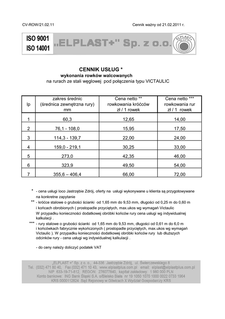 CV-ROW/21.02.11 Cennik ważny od 21.02.2011 r. CENNIK USŁUG * wykonania rowków walcowanych na rurach ze stali węglowej pod połączenia typu VICTAULIC lp zakres średnic (średnica zewnętrzna rury) mm Cena netto ** rowkowania króćców zł / 1 rowek Cena netto *** rowkowania rur zł / 1 rowek 1 60,3 12,65 14,00 2 76,1 - 108,0 15,95 17,50 3 114,3 - 139,7 22,00 24,00 4 159,0 - 219,1 30,25 33,00 5 273,0 42,35 46,00 6 323,9 49,50 54,00 7 355,6 – 406,4 66,00 72,00 * - cena usługi loco Jastrzębie Zdrój, oferty na usługi wykonywane u klienta są przygotowywane na konkretne zapytanie ** - króćce stalowe o grubości ścianki od 1,65 mm do 9,53 mm, długości od 0,25 m do 0,60 m i końcach obrobionych ( prostopadle przyciętych, max.ukos wg wymagań Victaulic W przypadku konieczności dodatkowej obróbki końców rury cena usługi wg indywidualnej kalkulacji . *** - rury stalowe o grubości ścianki od 1,65 mm do 9,53 mm, długości od 0,61 m do 6,0 m i końcówkach fabrycznie wykończonych ( prostopadle przyciętych, max.ukos wg wymagań Victaulic ). W przypadku konieczności dodatkowej obróbki końców rury lub dłuższych odcinków rury - cena usługi wg indywidualnej kalkulacji . - do ceny należy doliczyć podatek VAT