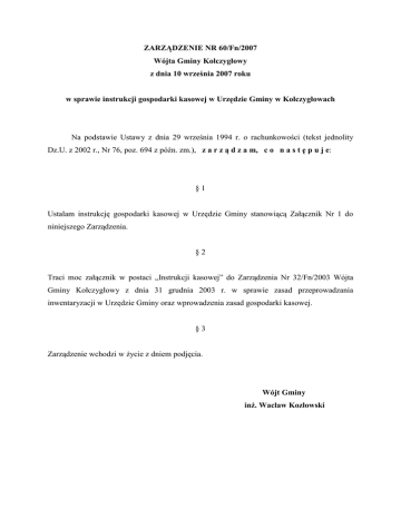 ZARZĄDZENIE NR 60/Fn/2007 Wójta Gminy Kołczygłowy z dnia 10 września 2007 roku w sprawie instrukcji gospodarki kasowej w Urzędzie Gminy w Kołczygłowach Na podstawie Ustawy z dnia 29 września 1994 r. o rachunkowości (tekst jednolity Dz.U. z 2002 r., Nr 76, poz. 694 z późn. zm.), z a r z ą d z a m, c o n a s t ę p u j e: §1 Ustalam instrukcję gospodarki kasowej w Urzędzie Gminy stanowiącą Załącznik Nr 1 do niniejszego Zarządzenia. §2 Traci moc załącznik w postaci „Instrukcji kasowej” do Zarządzenia Nr 32/Fn/2003 Wójta Gminy Kołczygłowy z dnia 31 grudnia 2003 r. w sprawie zasad przeprowadzania inwentaryzacji w Urzędzie Gminy oraz wprowadzenia zasad gospodarki kasowej. §3 Zarządzenie wchodzi w Ŝycie z dniem podjęcia. Wójt Gminy inŜ. Wacław Kozłowski Załącznik Nr 1 do Zarządzenia Nr 60/Fn/2007 Wójta Gminy Kołczygłowy z dnia 10.09.2007r. INSTRUKCJA w sprawie gospodarki kasowej w Urzędzie Gminy w Kołczygłowach Dział I Postanowienia ogólne §1 Instrukcja w sprawie gospodarki kasowej została opracowana na podstawie przepisów ustawy z dnia 29 września 1994 r. o rachunkowości, według stanu obowiązującego na dzień wejścia niniejszej instrukcji w Ŝycie. Rozdział II Objaśnienia §2 Ilekroć w niniejszej instrukcji jest mowa o: – jednostce – oznacza to urząd gminy, gminną jednostkę organizacyjną, – kierowniku jednostki – oznacza to wójta gminy, kierownika gminnej jednostki organizacyjnej, – księgowym – oznacza to skarbnika gminy, głównego księgowego gminnej jednostki organizacyjnej, – wartościach pienięŜnych – oznacza to krajowe i zagraniczne znaki pienięŜne, czeki, weksle i inne dokumenty zastępujące w obrocie gotówkę oraz złoto, srebro i wyroby z tych metali, kamienie szlachetne i perły, a takŜe platynę i pozostałe metale z grupy platynowców, Rozdział III Kasjer §3 1. Kasjerem moŜe być osoba posiadająca minimum średnie wykształcenie, mająca nienaganną opinię, nie karana za przestępstwa gospodarcze lub wykroczenie przeciwko mieniu oraz posiadająca pełną zdolność do czynności prawnych. 2. Przyjęcie – przekazanie kasy moŜe nastąpić jedynie protokolarnie, w obecności komisji wyznaczonej przez kierownika jednostki. Szczegółowe postanowienia w tej kwestii zawiera „Instrukcja w sprawie gospodarki majątkiem trwałym gminy, inwentaryzacji majątku i zasad odpowiedzialności za powierzone mienie”. 3. Kasjer musi na dowód przyjęcia odpowiedzialności materialnej złoŜyć deklarację o odpowiedzialności za powierzone mienie oraz o znajomości przepisów w zakresie dokonywania operacji kasowych i transportu gotówki. 4. Kasjer powinien posiadać obowiązującą w jednostce instrukcję w sprawie gospodarki kasowej oraz wykaz osób upowaŜnionych do dysponowania gotówką i zatwierdzania dowodów kasowych, jak równieŜ wzory ich podpisów. Rozdział IV Pomieszczenie kasy, ochrona i transport wartości pienięŜnych §4 1. Pomieszczenie przeznaczone do przechowywania wartości pienięŜnych powinno być odpowiednio wydzielone i zabezpieczone. Wszystkie okna pomieszczenia kasy winny być okratowane. Drzwi wejściowe do kasy winny być zaopatrzone w co najmniej dwa zamki. 2. W pomieszczeniu kasy powinno znajdować się okratowane i zamykane okienko, przez które kasjer dokonuje wypłaty. Powinno ono być tak zainstalowane, aby uniemoŜliwiło wejście jakiejkolwiek osoby do wnętrza kasy. 3. Pomieszczenie kasy powinno być wyposaŜone w szafę stalową do przechowywania wartości pienięŜnych. §5 1. Wartości pienięŜne muszą być przechowywane w warunkach zapewniających naleŜytą ochronę przed zniszczeniem, utratą lub zagarnięciem. 2. Wartości pienięŜne winny być przechowywane: – w kasecie stalowej, jeŜeli zapas wartości pienięŜnych nie przekracza 2.500 zł – w szafie stalowej, przymocowanej trwale do podłoŜa lub ściany, jeŜeli zapas wartości pienięŜnych nie przekracza 10.000 zł. §6 1. Transport wartości pienięŜnych w kwocie nie przekraczającej równowartości 5.000 zł. moŜe być wykonywany pieszo, przy ochronie dodatkowego pracownika urzędu. 2. Transport wartości pienięŜnych w kwocie przekraczającej równowartość 5.000 zł. podlega ochronie przez dodatkowego pracownika, z uwagi na bliskie połoŜenie banku pełniącego obsługę. W samochodach przewoŜących wartości pienięŜne nie mogą być równocześnie transportowane inne ładunki oraz nie mogą być w nich przewoŜone osoby postronne, nie uczestniczące w tym transporcie. Rozdział V Gospodarka kasowa §7 1. W kasie moŜe być : – niezbędny zapas gotówki na bieŜące wydatki, – gotówka podjęta z rachunku bankowego na pokrycie określonych rodzajowo wydatków, – gotówka pochodząca z bieŜących wpływów do kasy jednostki, – gotówka przechowywana jako depozyt od osób fizycznych i prawnych. 2. Wysokość niezbędnego zapasu gotówki w kasie jest ustalona przez kierownika jednostki, w zaleŜności od warunków zabezpieczenia gotówki i moŜliwości jej odprowadzenia na rachunek bankowy. Przy ustalaniu wysokości zapasu gotówki naleŜy uwzględnić: 1) minimum potrzeb w zakresie obrotu gotówkowego, 2) niezbędny zapas gotówki w kasie, który w miarę wykorzystania moŜe być uzupełniany do ustalonej wysokości (weryfikowanej w razie potrzeby przez kierownika jednostki) ze środków podjętych z rachunku bankowego. 3. NadwyŜkę gotówki znajdującą się w kasie na koniec dnia, ponad ustaloną wysokość jej niezbędnego zapasu, odprowadza się w dniu powstania nadwyŜki, a jeŜeli są warunki do odpowiedniego zabezpieczenia przechowywanej gotówki – w dniu następnym na rachunek bankowy jednostki lub na rachunki bankowe właściwe dla adresatów (odbiorców naleŜności). §8 1. Podjętą z rachunku bankowego gotówkę, przeznaczoną na pokrycie określonych rodzajowo wydatków jednostki naleŜy przeznaczyć na cel określony przy jej podjęciu. Niewykorzysta