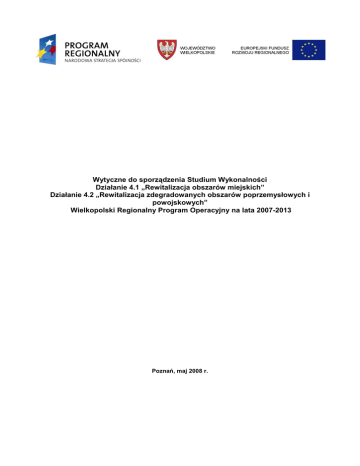 Wytyczne do sporządzenia Studium Wykonalności Działanie 4.1 „Rewitalizacja obszarów miejskich” Działanie 4.2 „Rewitalizacja zdegradowanych obszarów poprzemysłowych i powojskowych” Wielkopolski Regionalny Program Operacyjny na lata 2007-2013 Poznań, maj 2008 r. Spis treści: I. Wnioski ze Studium Wykonalności II. Charakterystyka projektu III. Opis bieŜącej sytuacji Beneficjenta oraz analiza otoczenia projektu IV. Logika interwencji V. Analiza instytucjonalna i prawna inwestycji VI. Analiza techniczna / technologiczna VII. Analiza specyficzna dla sektora VIII. Analiza finansowa i ekonomiczna IX. Analiza oddziaływania na środowisko X. Zgodność z politykami i prawem wspólnotowym XI. Promocja i informacja XII. Załączniki do Studium Wykonalności XIII. Oświadczenie Wnioskodawcy 2 Dla kaŜdego projektu inwestycyjnego Wnioskodawca ubiegający się o dofinansowanie z funduszy Unii Europejskiej powinien przedstawić Studium Wykonalności, umoŜliwiające dokonanie oceny projektu. Niniejsze wytyczne są skierowane do wszystkich podmiotów ubiegających się o wsparcie w ramach Wielkopolskiego Regionalnego Programu Operacyjnego na lata 2007- 2013 w ramach Działania 4.1 – „Rewitalizacja obszarów miejskich” oraz Działania 4.2 – „Rewitalizacja zdegradowanych obszarów poprzemysłowych i powojskowych”. Przygotowując Studium Wykonalności naleŜy mieć na uwadze następujące zasady: 1. Dane przedstawione w Studium Wykonalności muszą być zgodne z danymi zawartymi we wniosku o dofinansowanie. 2. Studium musi być aktualne na dzień składania wniosku. 3. Studium Wykonalności musi być zgodne z: • Wielkopolskim Regionalnym Programem Operacyjnym na lata 2007-2013, • Szczegółowym opisem priorytetów Wielkopolskiego Regionalnego Programu Operacyjnego na lata 2007-2013; • Wytycznymi Instytucji Zarządzającej Wielkopolskim Regionalnym Programem Operacyjnym na lata 2007-2013 w sprawie kwalifikowalności kosztów w ramach Priorytetu I – działanie 1.7 oraz Priorytetów II-VI, • Przewodnikiem – Analiza kosztów i korzyści projektów inwestycyjnych (Fundusz Strukturalny EFRR, Fundusz Spójności i ISPA), Komisja Europejska, • Wytycznymi dotyczącymi metodologii przeprowadzania analizy kosztów i korzyści. Nowy okres programowania 2007-2013. Dokument roboczy nr 4, Komisja Europejska, Dyrekcja Generalna ds. Polityki Regionalnej, 08/2006, • Wytycznymi w zakresie wybranych zagadnień związanych z przygotowaniem projektów inwestycyjnych, w tym projektów generujących dochód, opracowanymi przez Ministerstwo Rozwoju Regionalnego. 4. Analizę naleŜy przeprowadzać w odniesieniu do istniejącego stanu, a nie stanu „0”, czyli metodą przyrostu. Przedstawić naleŜy wariant bezinwestycyjny, wariant uwzględniający realizację wnioskowanego projektu w połączeniu ze stanem obecnym oraz projekt jako ujęcie róŜnicowe (wnioskowany projekt = wariant inwestycyjny – wariant bezinwestycyjny). W przypadku gdy stan istniejący jest toŜsamy ze stanem zerowym lub istnieje moŜliwość jednoznacznego oddzielenia przepływów finansowych z inwestycji od ogólnych przepływów Beneficjenta, analiza moŜe być prowadzona z punktu widzenia projektu (szczegóły w dalszej części) 5. NaleŜy wskazać wszystkie źródła pozyskania danych (zarówno liczbowych, jak i nieliczbowych) oraz okres, którego dotyczą. Dane muszą być wiarygodne i realne. Dane statystyczne powinny być nie starsze niŜ 2 lata, natomiast źródła danych finansowych (np. kosztorysy) nie mogą być starsze niŜ 1 rok. Jeśli w momencie składania Wniosku o dofinansowanie projekt jest w trakcie realizacji (zakończony) – zostały zlecone działania zakładane do realizacji w ramach projektu – do analizy muszą zostać przyjęte wartości rzeczywiste wynikające z zaakceptowanych warunków/podpisanych umów. Wszyscy Beneficjenci zobowiązani są do sporządzenia studiów wykonalności w formie tabelarycznej, zgodnie z przedstawionym schematem. Sporządzając Studium Wykonalności naleŜy stosować czcionkę Arial, rozmiar 10, z pojedynczymi odstępami pomiędzy wierszami. 3 I. Wnioski ze Studium Wykonalności (max 3 strony) Krótkie wprowadzenie do projektu, które jest jednocześnie streszczeniem całego opracowania i przedstawieniem wniosków z przeprowadzanych w całym studium analiz. Wstęp jest więc elementem wtórnym, którego sporządzanie naleŜy rozpocząć po przygotowaniu całego Studium Wykonalności. Obligatoryjne jest wypełnienie poniŜszej tabeli: Wyszczególnienie 1. 8. Nazwa Programu Operacyjnego Numer i nazwa Priorytetu w ramach Programu Operacyjnego Numer i nazwa Działania w ramach Priorytetu Programu Operacyjnego Numer Schematu w ramach Działania (jeśli dotyczy) Nazwa Wnioskodawcy Tytuł projektu Daty rozpoczęcia i zakończenia realizacji projektu Krótki opis przedmiotu projektu oraz jego odbiorców. 9. Cele projektu 2. 3. 4. 5. 6. 7. 10. Skwantyfikowane wskaźniki rezultatu i produktu 11. Całkowity koszt projektu z podziałem na koszty kwalifikowalne i niekwalifikowalne Okres odniesienia (referencyjny) stosowany w analizie finansowej (w latach) Finansowa stopa dyskontowa (w %) Łączny koszt inwestycji (PLN) Wartość rezydualna – liczona metodą księgową (PLN) Luka w finansowaniu (w %) Rzeczywisty poziom dofinansowania (w %) Kwota rzeczywistego poziomu dofinansowania (PLN) Wnioski z analizy finansowej i ekonomicznej (łącznie z podaniem podstawowych wskaźników) 12. 13. 14. 15. 16. 17. 18. 19. 4 II. Charakterystyka projektu Pełna nazwa Wnioskodawcy (lidera wiodącego projektu) Adres Wnioskodawcy Numer telefonu Numer faksu Adres e-mail Adres do korespondencji Numer NIP Numer REGON Status prawny Dane osoby wyznaczonej do kontaktu Krótka charakterystyka działalności Wnioskodawcy (w przypadku partnerstwa projektowego wszystkich zaangaŜowanych podmiotów) Doświadczenie Beneficjenta we wdraŜaniu projektów współfinansowanych ze środków europej