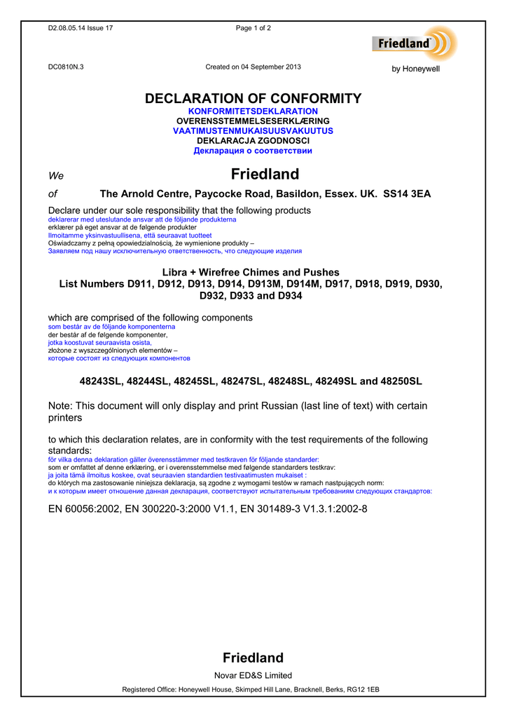 D2.08.05.14 Issue 17 Page 1 of 2 DC0810N.3 Created on 04 September 2013 DECLARATION OF CONFORMITY KONFORMITETSDEKLARATION OVERENSSTEMMELSESERKLÆRING VAATIMUSTENMUKAISUUSVAKUUTUS DEKLARACJA ZGODNOSCI Декларация о соответствии Friedland We of The Arnold Centre, Paycocke Road, Basildon, Essex. UK. SS14 3EA Declare under our sole responsibility that the following products deklarerar med uteslutande ansvar att de följande produkterna erklærer på eget ansvar at de følgende produkter Ilmoitamme yksinvastuullisena, että seuraavat tuotteet Oświadczamy z pełną opowiedzialnością, że wymienione produkty – Заявляем под нашу исключительную ответственность, что следующие изделия Libra + Wirefree Chimes and Pushes List Numbers D911, D912, D913, D914, D913M, D914M, D917, D918, D919, D930, D932, D933 and D934 which are comprised of the following components som består av de följande komponenterna der består af de følgende komponenter, jotka koostuvat seuraavista osista, złożone z wyszczególnionych elementów – которые состоят из следующих компонентов 48243SL, 48244SL, 48245SL, 48247SL, 48248SL, 48249SL and 48250SL Note: This document will only display and print Russian (last line of text) with certain printers to which this declaration relates, are in conformity with the test requirements of the following standards: för vilka denna deklaration gäller överensstämmer med testkraven för följande standarder: som er omfattet af denne erklæring, er i overensstemmelse med følgende standarders testkrav: ja joita tämä ilmoitus koskee, ovat seuraavien standardien testivaatimusten mukaiset : do których ma zastosowanie niniejsza deklaracja, są zgodne z wymogami testów w ramach nastpujących norm: и к которым имеет отношение данная декларация, соответствуют испытательным требованиям следующих стандартов: EN 60056:2002, EN 300220-3:2000 V1.1, EN 301489-3 V1.3.1:2002-8 Friedland Novar ED&S Limited Registered Office: Honeywell House, Skimped Hill Lane, Bracknell, Berks, RG12 1EB D2.08.05.14 Issue 17 Page 2 of 2 DC0810N.3 Created on 04 September 2013 EN 60529:1992 (IP55), EN 60065:2002, EN 61558-1:1997+A1:1998, EN 61558-2-6:1997, EN 300220-3:V1.1.1:2000, EN 300440-1:V1.3.1:2001, EN 300440-2:V1.1.1:2001, EN 301489-3:V1.4.1 and on the basis of this testing, these products are considered to comply with the essential requirements of the following EU Directives och med dessa tester som grund anses dessa produkter överensstämma med de väsentliga kraven i följande EU-direktiv: og baseret på denne testning opfylder disse produkter de følgende EU-direktivers væsentlige krav ja näiden testien perusteella, näiden tuotteiden katsotaan olevan seuraavien EU-direktiivien vaatimusten mukaiset i na podstawie wspomnianych testów stwierdza się, że produkty te odpowiadają podstawowym wymogom następujących dyrektyw Unii Europejskiej : и на основании этих испытаний данные изделия признаны как соответствующие основным требованиям следующих директив ЕС: Low Voltage Directive (2006/95/EC), EMC Directive (2004/108/EC), R&TTE Directive (1999/5/EC), RoHS Directive (2011/65/EU). CE mark affixed – Before 2010 Support documentation reference: GLESO051201 189AV1/2/3/4 GLEMO051203252AVR GLEMO051203252AVR-1 GLEMO0512032522AVE GLEMO0512032522AVE-1 Signature: Print Name: Keith Davis Function: Global Current Products Manager Novar ED&S Limited operates a Quality Management System which is certified to ISO9001 by a UKAS accredited certification body. Friedland Novar ED&S Limited Registered Office: Honeywell House, Skimped Hill Lane, Bracknell, Berks, RG12 1EB