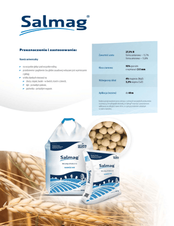 Przeznaczenie i zastosowanie: Nawóz uniwersalny na wszystkie gleby i pod wszystkie rośliny; przedsiewnie i pogłównie (na glebie zasadowej wskazane jest wymieszanie z glebą); w kilku dawkach stosować na: zboża, rzepak, buraki - w dwóch, trzech i czterech, łąki - po każdym pokosie, pastwiska - po każdym wypasie. Jakie zalety ma nasz Salmag®? Dwie formy azotu: szybko działająca – azotanowa, oraz amonowa o spowolnionym działaniu. Dzięki temu dostarczanie azotu jest na względnie stałym poziomie przez cały okres wegetacji roślin; skład wzbogacony o wapń i magnez; wszystkie idealnie dobrane składniki Salmagu® występują w formach łatwo przyswajalnych przez rośliny; budowa chemiczna granulki Salmagu® zabezpiecza ją przed zbyt szybkim wypłukiwaniem azotu, a tym samym jego stratami w glebie; dzięki zastosowaniu procesu granulacji mechanicznej osiągnięta została wyjątkowa wytrzymałość mechaniczna i twardość granulek co: zabezpiecza je przed zbrylaniem, kruszeniem, ścieraniem w trakcie transportu czy magazynowania, umożliwia rozsiewanie na znaczne odległości (nawet do 40 m); wysoka jednorodność granulek (95% granulek o wymiarach 2-5 mm), dzięki czemu: uzyskacie Państwo wyjątkowo równomierny wysiew, doskonale nadaje się do mieszania z innymi nawozami (tzw. blendingu); dobra rozpuszczalność Salmagu® w wodzie, umożliwia jego aplikację w formie płynnej; dzięki uniwersalności zastosowań Salmag® można stosować pogłównie, przedsiewnie, pod wszystkie rośliny – niezależnie od stopnia ich zwięzłości i stopnia zakwaszenia; jest nawozem obojętnym – nie zakwasza gleby; bezpieczny w użyciu – Salmag® spełnia wszystkie wymagane kryteria bezpieczeństwa, co poparte zostało odpowiednimi certyfikatami. Jakie korzyści przyniesie Państwu stosowanie Salmagu®: Stosując Salmag® systematycznie wnosimy niezbędne składniki odżywcze, zapewniając roślinom optymalne warunki rozwoju; efektywniejsze przenoszenie azotu do systemu korzeniowego roślin zmniejsza jego straty, a tym samym poprawia aspekt ekonomiczny nawożenia; uniwersalność stosowania Salmagu® umożliwia jego aplikację pod wszystkie rodzaje upraw, bez względu na okres stosowania (przedsiewnie, pogłównie); doskonale się sprawdza jako nawóz nie tylko pod uprawy polowe, ale również w procesie nawożenia łąk i pastwisk; możliwość aplikacji (rozsiewania) Salmagu® na duże odległości zmniejsza ilość przejazdów przez pole uprawne, a tym samym obniża koszty prowadzenia upraw – oszczędność paliwa, maszyn, czasu; możliwość mieszania Salmagu® z innymi nawozami stałymi (granulowanymi) umożliwia przeprowadzenie pełnego zabiegu nawożenia przy jednej aplikacji – obniżenie kosztu upraw poprzez oszczędność paliwa i czasu; brak cech wybuchowych Salmagu® daje pełne bezpieczeństwo transportu, magazynowania i aplikacji. Zawiera wapń i magnez, które występują w formach łatwo dostępnych dla roślin i zwiększają przyswajalność azotu Niedobór magnezu, nawet utajony, powoduje: spowolniony wzrost roślin od wczesnych faz rozwoju, ponieważ najgorzej pobierają ten składnik młode rośliny. Brak magnezu, obok fosforu, ogranicza prawidłowy rozwój korzeni i ich sprawność, dlatego tak ważne jest stosowanie magnezu do gleby, a nie tyko dolistnie, gdy rośliny są większe; ogranicza pobieranie składników pokarmowych z gleby, najbardziej fosforu i potasu; spadek odporności roślin na choroby; mniejszą zawartość chlorofilu, czyli niższe plony, a w konsekwencji spadek plonu ziarna, bulw, korzeni; niższą zawartość białka, białka gorszej jakości; niższą zawartość tłuszczu, cukrów (na przykład w korzeniach buraka), w tym skrobi w bulwach ziemniaka, mniej karetonu, witaminy A, czyli pogorszenie wartości biologicznej plonu. Salmag® to dobry nawóz Efektywność nawożenia wapniem Wapń jest niezbędnym dla roślin makroskładnikiem. W naszej strefie klimatyczno-glebowej zawartość wapnia w glebie o uregulowanym odczynie jest wystarczająca dla roślin uprawnych. Związki służą przede wszystkim do wapnowania, czyli regulowania odczynu gleby, a nie nawożenia roślin. W glebie, w zasięgu korzeni roślin znajduje się od kilkunastu do kilkudziesięciu ton CaO/ha. Gleba o optymalnym, a nawet zbyt kwaśnym odczynie zabezpiecza roślinę w wapń, dlatego objawy jego niedoboru występują wyjątkowo rzadko.