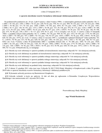 UCHWAŁA NR IX/107/2011 RADY MIEJSKIEJ W KRAPKOWICACH z dnia 23 listopada 2011 r. w sprawie określenia wzorów formularzy informacji i deklaracji podatkowych Na podstawieNa podstawie art. 18 ust. 2 pkt 8 ustawy z dnia 8 marca 1990 r. o samorządzie gminnym (tekst jednolity: Dz. U. z 2001 r. Nr 142, poz. 1591; z 2002 r. Nr 23, poz. 220, Nr 62, poz. 558, Nr 113, poz. 984, Nr 153, poz. 1271, Nr 214, poz. 1806; z 2003 r. Nr 80, poz. 717, Nr 162, poz. 1568; z 2004 r. Nr 102, poz. 1055, Nr 116, poz. 1203, z 2005 r. Nr 172, poz. 1441; z 2006 r. Nr 17, poz. 128, Nr 181, poz. 1337; z 2007 r. Nr 48, poz. 327, Nr 138, poz. 974, Nr 173, poz. 1218; z 2008 r. Nr 180, poz. 1111, Nr 223, poz. 1458; z 2009 r. Nr 52, poz. 420, Nr 157, poz. 1241; z 2010 r. Nr 28, poz. 142, Nr 28, poz. 146, Nr 106, poz. 675, Nr 40, poz. 230; z 2011 r. Nr 117, poz. 679, Nr 21, poz. 113) w związku z art. 6a ust. 11 ustawy z dnia 15 listopada 1984 r. o podatku rolnym (tekst jednolity: Dz. U. z 2006 r. Nr 136, poz. 969, Nr 191, poz. 1412, Nr 245, poz. 1775, Nr 249, poz. 1825; z 2007 r. Nr 109, poz. 747; z 2008 r. Nr 116, poz. 730, Nr 237, poz. 1655; z 2009 r. Nr 56, poz. 458; z 2010 r. Nr 96, poz. 620, Nr 226, poz. 1475), art. 6 ust. 13 ustawy z dnia 12 stycznia 1991 r. o podatkach i opłatach lokalnych1) (tekst jednolity: Dz. U. z 2010 r. Nr 95, poz. 613, Nr 96, poz. 620, Nr 225, poz. 1461, Nr 226, poz. 1475; z 2011 r. Nr 102, poz. 584, Nr 112, poz. 654) i art. 6 ust. 9 ustawy z dnia 30 października 2002 r. o podatku leśnym (Dz. U. Nr 200, poz. 1682, Nr 216, poz. 1826; z 2005 r. Nr 143, poz. 1199, Nr 164, poz. 1365, Nr 179, poz. 1484; z 2006 r. Nr 245, poz. 1775, Nr 249, poz. 1825; z 2008 r. Nr 116, poz. 730; z 2009 r. Nr 56, poz. 458; z 2010 r. Nr 95, poz. 613, Nr 96, poz. 620, Nr 226, poz. 1475, z 2011 r. Nr 102, poz. 584, Nr 112, poz. 654)uchwala się, co następuje: § 1. Określa się wzór informacji w sprawie podatku od nieruchomości stanowiący załącznik Nr 1 do niniejszej uchwały. § 2. Określa się wzór deklaracji na podatek od nieruchomości stanowiący załącznik Nr 2 do niniejszej uchwały. § 3. Określa się wzór informacji w sprawie podatku rolnego stanowiący załącznik Nr 3 do niniejszej uchwały. § 4. Określa się wzór deklaracji w sprawie podatku rolnego stanowiący załącznik Nr 4 do niniejszej uchwały. § 5. Określa się wzór informacji w sprawie podatku leśnego stanowiący załącznik Nr 5 do niniejszej uchwały. § 6. Określa się wzór deklaracji na podatek leśny stanowiący załącznik Nr 6 do niniejszej uchwały. § 7. Z dniem 31 grudnia 2011 roku traci moc Uchwała Nr III/17/2010 Rady Miejskiej w Krapkowicach z dnia 29 grudnia 2010 roku w sprawie określenia wzorów formularzy informacji i deklaracji podatkowych. § 8. Wykonanie uchwały powierza się Burmistrzowi Krapkowic. § 9. Uchwała wchodzi w życie po upływie 14 dni od dnia jej ogłoszenia w Dzienniku Urzędowym Województwa Opolskiego i ma zastosowanie od 1 stycznia 2012 roku. Przewodniczący Rady Miejskiej mgr Witold Rożałowski 1) Niniejsza ustawa dokonuje w zakresie swojej regulacji wdrożenia następujących dyrektyw Wspólnot Europejskich: 1) dyrektywy 92/106/EWG z dnia 7 grudnia 1992 r. w sprawie ustanowienia wspólnych zasad dla niektórych typów transportu kombinowanego towarów między państwami członkowskimi (Dz.Urz. WE L 368 z 17.12.1992), 2) dyrektywy 1999/62/WE z dnia 17 czerwca 1999 r. w sprawie pobierania opłat za użytkowania niektórych typów infrastruktury przez pojazdy ciężarowe (Dz.Urz. WE L 187 z 20.07.1999). Załączniki binarne Załącznik nr 1 do Uchwały Nr IX/107/2011 z dnia 23 listopada 2011 r. Zalacznik1.pdf Załącznik nr 2 do Uchwały Nr IX/107/2011 z dnia 23 listopada 2011 r. Zalacznik2.pdf Załącznik nr 3 do Uchwały Nr IX/107/2011 z dnia 23 listopada 2011 r. Zalacznik3.pdf Załącznik nr 4 do Uchwały Nr IX/107/2011 z dnia 23 listopada 2011 r. Zalacznik4.pdf Załącznik nr 5 do Uchwały Nr IX/107/2011 z dnia 23 listopada 2011 r. Zalacznik5.pdf Załącznik nr 6 do Uchwały Nr IX/107/2011 z dnia 23 listopada 2011 r. Zalacznik6.pdf