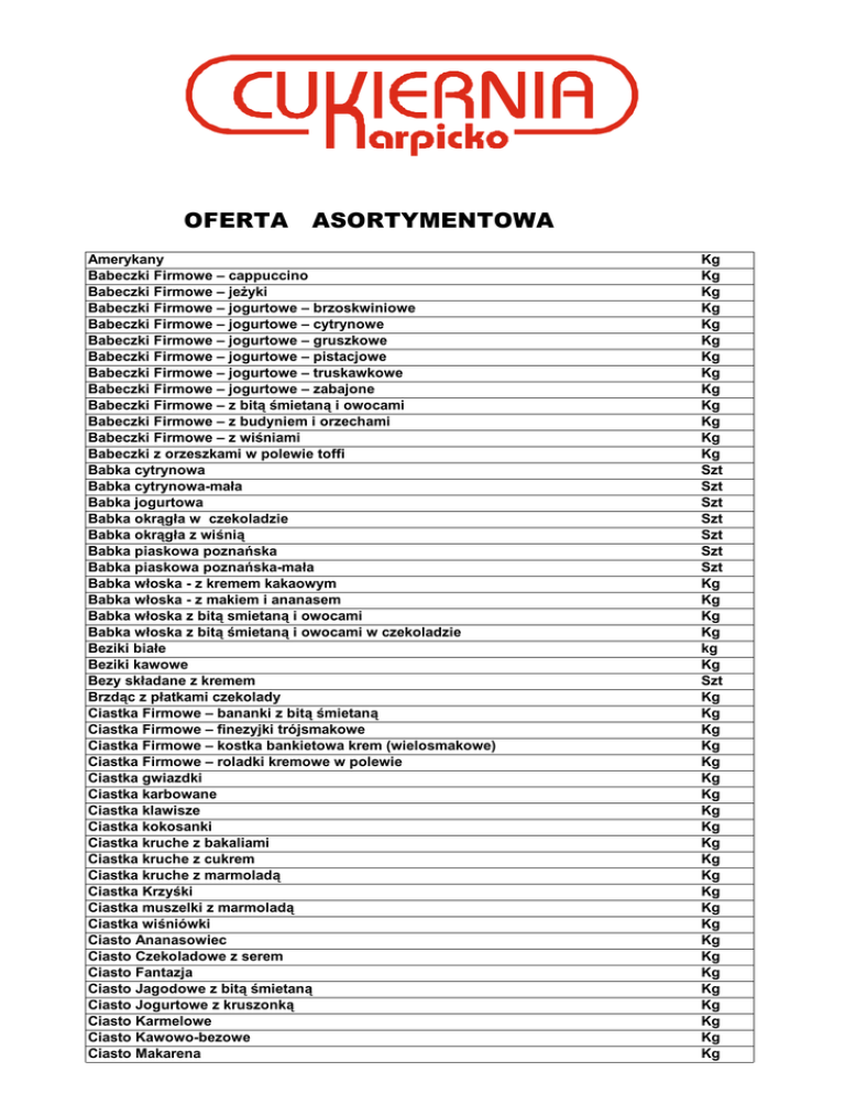 OFERTA ASORTYMENTOWA Amerykany Babeczki Firmowe – cappuccino Babeczki Firmowe – jeżyki Babeczki Firmowe – jogurtowe – brzoskwiniowe Babeczki Firmowe – jogurtowe – cytrynowe Babeczki Firmowe – jogurtowe – gruszkowe Babeczki Firmowe – jogurtowe – pistacjowe Babeczki Firmowe – jogurtowe – truskawkowe Babeczki Firmowe – jogurtowe – zabajone Babeczki Firmowe – z bitą śmietaną i owocami Babeczki Firmowe – z budyniem i orzechami Babeczki Firmowe – z wiśniami Babeczki z orzeszkami w polewie toffi Babka cytrynowa Babka cytrynowa-mała Babka jogurtowa Babka okrągła w czekoladzie Babka okrągła z wiśnią Babka piaskowa poznańska Babka piaskowa poznańska-mała Babka włoska - z kremem kakaowym Babka włoska - z makiem i ananasem Babka włoska z bitą smietaną i owocami Babka włoska z bitą śmietaną i owocami w czekoladzie Beziki białe Beziki kawowe Bezy składane z kremem Brzdąc z płatkami czekolady Ciastka Firmowe – bananki z bitą śmietaną Ciastka Firmowe – finezyjki trójsmakowe Ciastka Firmowe – kostka bankietowa krem (wielosmakowe) Ciastka Firmowe – roladki kremowe w polewie Ciastka gwiazdki Ciastka karbowane Ciastka klawisze Ciastka kokosanki Ciastka kruche z bakaliami Ciastka kruche z cukrem Ciastka kruche z marmoladą Ciastka Krzyśki Ciastka muszelki z marmoladą Ciastka wiśniówki Ciasto Ananasowiec Ciasto Czekoladowe z serem Ciasto Fantazja Ciasto Jagodowe z bitą śmietaną Ciasto Jogurtowe z kruszonką Ciasto Karmelowe Ciasto Kawowo-bezowe Ciasto Makarena Kg Kg Kg Kg Kg Kg Kg Kg Kg Kg Kg Kg Kg Szt Szt Szt Szt Szt Szt Szt Kg Kg Kg Kg kg Kg Szt Kg Kg Kg Kg Kg Kg Kg Kg Kg Kg Kg Kg Kg Kg Kg Kg Kg Kg Kg Kg Kg Kg Kg Ciasto Malinowe z bitą śmietaną Ciasto Malinowe z galaretką Ciasto Marko Ciasto Maślane Ciasto na tackach – jabłecznik Ciasto na tackach z frużeliną (wielosmakowe) Ciasto Przekładaniec na bitej śmietanie Ciasto Rafaello Ciasto Sahero Ciasto Śnieżynka Ciasto Tiramisu Ciasto W-Z Drożdżówka francuska z serem Drożdżówka z budyniem Drożdżówka z makiem Drożdżówka z marmoladą Drożdżówka z serem Drożdżówka ze śliwką Ekler mini z czekoladą Ekler z budyniem Finezja - rolada trójsmakowa Francuz kwadrat Francuz-grzebień z marmoladą Francuz-koperta z jabłkiem Galaretka brzoskwiniowa Galaretka malinowa (sezon) Galaretka truskawkowa Galaretka wieloowocowa (leśna) Jabłecznik kruchy Jabłecznik z bitą śmietaną Jabłecznik z kokosem Jabłecznik z kruszonką Jagodzianka Keks Keks – mały Kula z galaretką i mandarynkami Kula z galaretką i truskawką Makowiec z kruszonką na kruchym spodzie Murzynek z bitą śmietaną i wiśniami Napoleonek Omlety z bitą śmietaną Pączki z nadzieniem brzoskwiniowym Pączki z nadzieniem różanym Pączki z nadzieniem wiśniowym Piernik (sezon) Placek drożdżowy z owocem Placek węgierski ze śliwkami (sezon) Ptasie mleczko cytrynowe Ptasie mleczko truskawkowe Ptyś mini z bitą śmietaną Ptyś z bitą śmietaną Rogal z marmoladą Rogale Marcińskie Rogaliki z marmoladą Rolada firmowa z mandarynkami Rolada firmowa z truskawkami Rolada węgierska czekoladowa Rolada z bitą śmietaną i galaretką w środku Rolada z bitą śmietaną i owocami Rolada z bitą śmietaną i owocem w czekoladzie Rolada z bitą śmietaną o smaku toffi Rożki czekoladowe Rożki śmietankowe Rożki śmietankowe Kg Kg Kg Kg Szt Szt Kg Kg Kg Kg Kg Kg Szt Szt Szt szt Szt Szt kg Kg Kg Kg Kg Kg Kg Kg Kg Kg Kg Kg Kg Kg Szt Szt Szt Kg Kg Kg Kg Kg Szt Szt Szt Szt Kg Kg Kg Kg Kg Kg Kg Szt Kg Kg Kg Kg Kg Kg Kg Kg Kg Kg Kg kg Rulon – makowiec zawijany z makiem Rurka - francuz z bitą śmietana w czekoadzie Rurka - francuz z kremem budyniowym Sernik domowy Sernik kakaowy Sernik na zimno Sernik z brzoskwiniami Sernik z kokosem Sernik z makiem-seromakowiec Sernik z mandarynkami Sernik z wiśniami Strucel z serem Torcik jesienny kremowy 0,8 kg (sezon) Torcik jesienny kremowy 1,60 kg (sezon) Torcik szwardzwaladzki na bitej śmietanie 1,2kg Torcik szwardzwaldzki na bitej śmietanie 0,8 kg Torcik zimowy kremowy 0,8 kg (sezon) Torcik zimowy kremowy 1,60 kg (sezon) Torcik Adwokat 0,8 kg Torcik Adwokat 1,20 kg Torcik biała dama 0,8 kg Torcik biała dama 1,2 kg Torcik biedronka ok 1kg Torcik bita śmietana 0,8 kg Torcik bita śmietana 1,2 kg Torcik cytrynowy 0,8 kg Torcik cytrynowy 1,2 kg Torcik czekoladowy z wiśniami 0,8 kg Torcik czekoladowy z wiśniami 1,2 kg Torcik jeż ok 1 kg Torcik jogurtowy gruszkowy 0,8 kg Torcik jogurtowy gruszkowy 1,2 kg Torcik jogurtowy truskawkowy 0,8 kg Torcik jogurtowy truskawkowy 1,2 kg Torcik karmelowy-tofi na bitej śmietanie 0,8 kg Torcik karmelowy-tofi na bitej śmietanie 1,2 kg Torcik kawowy kremowy 0,8 kg Torcik kawowy kremowy 1,2 kg Torcik Malaga 0,8 kg Torcik Malaga 1,2 kg Torcik mandarynkowo – pomarańczowy na bitej śmietanie 0,8 kg Torcik mandarynkowo – pomarańczowy na bitej śmietanie 1,2 kg Torcik marcepanowy na kremie orzechowym 0,8kg Torcik marcepanowy na kremie orzechowym 1,2kg Torcik Marsylia 0,8 kg Torcik Marsylia 1,20 kg Torcik migdałowo-orzechowy na kremie 0,8 kg Torcik migdałowo-orzechowy na kremie 1,2 kg Torcik morski na bitej śmietanie 0,8 kg Torcik orzechowy na kremie 0,8 kg Torcik orzechowy na kremie 1,2 kg Torcik prażynkowy Paris 0,8 kg Torcik prażynkowy Paris 1,2 kg Torcik samochodzik ok 1kg Torcik straciatella 0,8 kg Torcik straciatella 1,2 kg Torcik tiramisu 0,8 kg Torcik tiramisu 1,2 kg Torcik trójkątny koniakowy na bitej śmietanie Torcik trójkątny węgierski na kremie czekoladowym Torcik trójkątny wiśniowy na bitej śmietanie Torcik węgierski z wiśniami na kremie czekoladowym 0,8 kg Torcik węgierski z wiśniami na kremie czekoladowym 1,2 kg Torcik wiśniowy na bitej śmietanie 0,8 kg Kg kg Kg Kg Kg Kg Kg Kg Kg Kg Kg Kg Kg Kg Kg Kg Kg Kg Kg Kg Kg Kg Szt Kg Kg Kg Kg Kg Kg Szt Kg Kg Kg Kg Kg Kg Kg Kg Kg Kg Kg Kg Kg Kg Kg Kg Kg Kg Kg Kg Kg Kg Kg Szt Kg Kg Kg Kg Kg Kg Kg Kg Kg Kg Torcik wiśniowy na bitej śmietanie 1