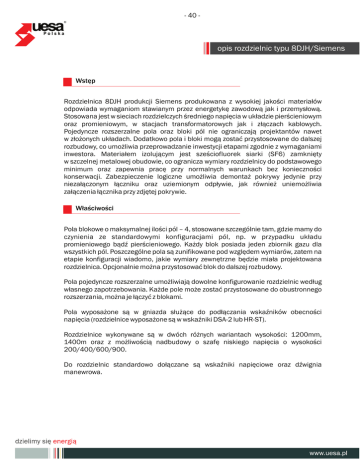 - 40 - opis rozdzielnic typu 8DJH/Siemens Wstęp Rozdzielnica 8DJH produkcji Siemens produkowana z wysokiej jakości materiałów odpowiada wymaganiom stawianym przez energetykę zawodową jak i przemysłową. Stosowana jest w sieciach rozdzielczych średniego napięcia w układzie pierścieniowym oraz promieniowym, w stacjach transformatorowych jak i złączach kablowych. Pojedyncze rozszerzalne pola oraz bloki pól nie ograniczają projektantów nawet w złożonych układach. Dodatkowo pola i bloki mogą zostać przystosowane do dalszej rozbudowy, co umożliwia przeprowadzanie inwestycji etapami zgodnie z wymaganiami inwestora. Materiałem izolującym jest sześciofluorek siarki (SF6) zamknięty w szczelnej metalowej obudowie, co ogranicza wymiary rozdzielnicy do podstawowego minimum oraz zapewnia pracę przy normalnych warunkach bez konieczności konserwacji. Zabezpieczenie logiczne umożliwia demontaż pokrywy jedynie przy niezałączonym łączniku oraz uziemionym odpływie, jak również uniemożliwia załączenia łącznika przy zdjętej pokrywie. Właściwości Pola blokowe o maksymalnej ilości pól – 4, stosowane szczególnie tam, gdzie mamy do czynienia ze standardowymi konfiguracjami pól, np. w przypadku układu promieniowego bądź pierścieniowego. Każdy blok posiada jeden zbiornik gazu dla wszystkich pól. Poszczególne pola są zunifikowane pod względem wymiarów, zatem na etapie konfiguracji wiadomo, jakie wymiary zewnętrzne będzie miała projektowana rozdzielnica. Opcjonalnie można przystosować blok do dalszej rozbudowy. Pola pojedyncze rozszerzalne umożliwiają dowolne konfigurowanie rozdzielnic według własnego zapotrzebowania. Każde pole może zostać przystosowane do obustronnego rozszerzania, można je łączyć z blokami. Pola wyposażone są w gniazda służące do podłączania wskaźników obecności napięcia (rozdzielnice wyposażone są w wskaźniki DSA-2 lub HR-ST). Rozdzielnice wykonywane są w dwóch różnych wariantach wysokości: 1200mm, 1400m oraz z możliwością nadbudowy o szafę niskiego napięcia o wysokości 200/400/600/900. Do rozdzielnic standardowo dołączane są wskaźniki napięciowe oraz dźwignia manewrowa. - 41 - opis rozdzielnic przykładowe typu 8DJH/Siemens konfiguracje Rozwiązania techniczne - obudowa metalowa z izolacją gazem SF6 - pojedynczy system szyn zbiorczych 630 A - rozdzielnica montowana fabrycznie, przetestowana zgodnie z IEC/EN 62271-200 - możliwość rozbudowywania bloków w obie strony (opcjonalnie) - nie wymaga konserwacji - odporna na warunki klimatyczne - łącznik trójpołożeniowy z funkcją rozłącznika i uziemnika szybkiego - wyłącznik próżniowy w 3-ech wersjach - proste łączenie szyn i szybki montaż pól rozbudowywanych bez wykonania prac przy użyciu gazu - wymiana wkładek bezpiecznikowych nie wymaga narzędzi - optymalna wielkość przedziału kablowego - łatwy montaż - wtyki kablowe dla przepustów stożkowych (zalecany osprzęt kablowy prod. NKT) Dodatkowe opcje wyposażenia - pojemnościowy system pomiaru napięcia na szynach zbiorczych, polach pomiarowych (system CAPDIS-Sx+) -napędy silnikowe dla rozłączników i wyłączników z układami sterowania zdalne/lokalne - wyzwalacze dla pól transformatorowych i wyłącznikowych - systemy blokad mechanicznych i magnetycznych - wtykowe przekładniki napięciowe 4MTxx do przyłączy kablowych i na szyny zbiorcze - przekładniki prądowe 4MCxxxx na kable i na izolatory przepustowe - ograniczniki przepięć, głowice sprzęgające (zalecane prod. NKT) - wskaźniki prądu zwarcia, układy SZR - zabezpieczenia autonomiczne typu WIC - aparatura kontrolno-pomiarowa - możliwość rozwiązań indywidualnych –wg ustaleń - 42 - opis rozdzielnic typu 8DJH/Siemens