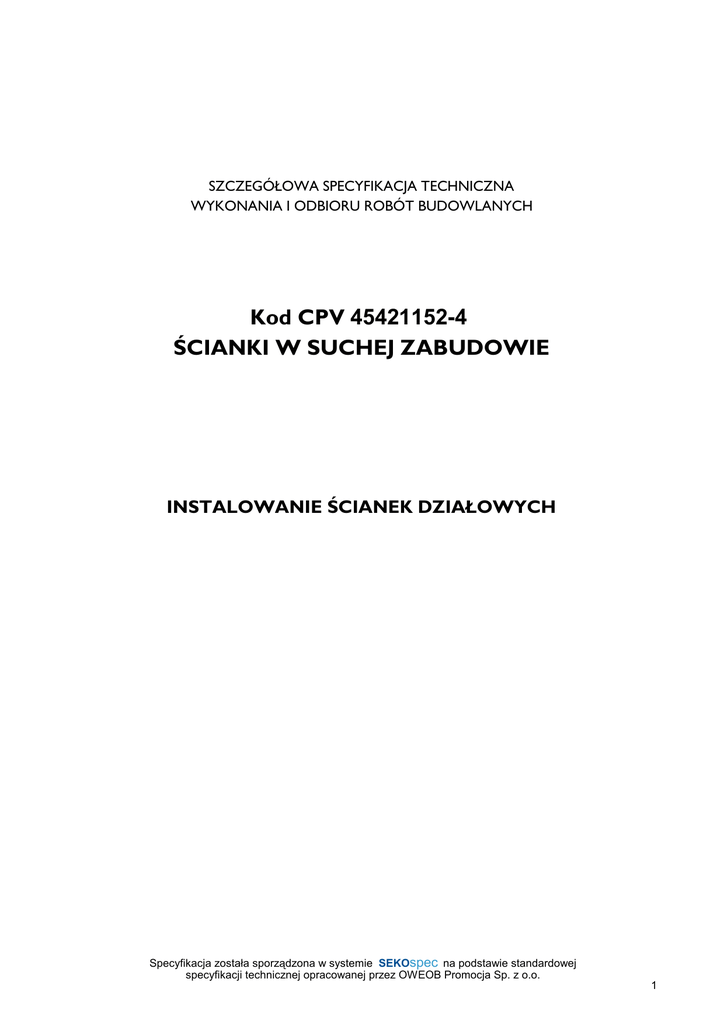 SZCZEGÓŁOWA SPECYFIKACJA TECHNICZNA WYKONANIA I ODBIORU ROBÓT BUDOWLANYCH Kod CPV 45421152-4 ŚCIANKI W SUCHEJ ZABUDOWIE INSTALOWANIE ŚCIANEK DZIAŁOWYCH Specyfikacja została sporządzona w systemie SEKOspec SEKOspec na podstawie standardowej specyfikacji technicznej OWEOB opracowanej Promocjaprzez Sp. zOWEOB o.o. 2005Promocja Sp. z o.o. 1 SPIS TREŚCI 1. WSTĘP ................................................................................................................................................. 3 2. MATERIAŁY ........................................................................................................................................ 4 3. SPRZĘT ................................................................................................................................................ 6 4. TRANSPORT ..................................................................................................................................... 6 5. WYKONANIE ROBÓT .................................................................................................................. 6 6. KONTROLA JAKOŚCI ROBÓT ................................................................................................ 12 7. OBMIAR ROBÓT ........................................................................................................................... 13 8. ODBIÓR ROBÓT .......................................................................................................................... 13 9. PODSTAWA PŁATNOŚCI .......................................................................................................... 14 10. PRZEPISY ZWIĄZANE .............................................................................................................. 15 NajwaŜniejsze oznaczenia i skróty: ST – Specyfikacja Techniczna SST – Szczegółowa Specyfikacja Techniczna ITB – Instytut Techniki Budowlanej Specyfikacja została sporządzona w systemie SEKOspec SEKOspec na podstawie standardowej specyfikacji technicznej OWEOB opracowanej Promocjaprzez Sp. zOWEOB o.o. 2005Promocja Sp. z o.o. 2 1. WSTĘP 1.1. Przedmiot SST Przedmiotem niniejszej szczegółowej specyfikacji technicznej (SST) są wymagania dotyczące wykonania i odbioru montaŜu ścianek działowych z płyt gipsowo-kartonowych (suchych tynków gipsowych). Prace te będą prowadzone przy przebudowie internatu ZSCKR w Widzewie w ramach realizacji projektu Przebudowy Internatu Polegającej Na WyposaŜeniu Pokojów W Indywidualne Węzły Sanitarne 1.2. Zakres stosowania ST Niniejsza specyfikację techniczną (SST) opracowano na podstawieogólnej specyfikacji (ST) oraz projektu budowlanego Przebudowy Internatu Polegającej Na WyposaŜeniu Pokojów W Indywidualne Węzły Sanitarne i jest ona częścią dokumentacji przetargowej i kontraktowej przy przy zlecaniu i realizacji robót wymienionych w pkt. 1.1. 1.3. Zakres robót objętych ST – Okładziny z płyt gipsowo-kartonowych, których dotyczy specyfikacja stanowią poszycie aŜurowej konstrukcji ścian i sufitów w systemie lekkiej zabudowy szkieletowej, jak i okładziny zastępującej tynki na ścianach i sufitach murowanych wykonywanych z materiałów tradycyjnych. – Okładziny objęte niniejszą ST kształtują formę architektoniczną danego elementu konstrukcyjnego, wykonywane są ręcznie z płyt gipsowo-kartonowych odpowiadających wymaganiom norm lub aprobat technicznych. – „Prawa” strona płyty gipsowo-kartonowej pełni rolę jej lica i po zamontowaniu skierowana jest do wnętrza pomieszczenia. Strona „lewa” płyty (niewidoczna po zamontowaniu) posiada nadruk z symbolem producenta oraz zakładkowe połączenia kartonu. - Ustalenia zawarte w niniejszej SST obejmuja wszystkie czynności umozliwiajace i majace na celu wykonanie ścianek działowych, oraz obudowy z płyt g-k na ruszcie stalowym, do ktorego wykonania zostały uŜyte materiały odpowiadajace wymaganiom norm i aprobat technicznych. 1.4. Określenia podstawowe Określenia podane w niniejszej ST są zgodne z ustawą Prawo budowlane, wydanymi do niej rozporządzeniami wykonawczymi, nomenklaturą Polskich Norm, aprobat technicznych, a mianowicie: − roboty budowlane przy wykonaniu okładzin z płyt gipsowo-kartonowych naleŜy rozumieć wszystkie prace budowlane związane z wykonaniem okładzin z płyt gipsowo-kartonowych zgodnie z ustaleniami projektowymi, − Wykonawca – osoba lub organizacja wykonująca ww. roboty budowlane, − procedura – dokument zapewniający jakość, definiujący „jak, kiedy, gdzie i kto”? wykonuje i kontroluje poszczególne operacje robocze – procedura moŜe być zastąpiona przez normy, aprobaty techniczne iinstrukcje, − ustalenia projektowe – ustalenia podane w dokumentacji technicznej zawierające dane opisujące przedmiot i wymagania jakościowe wykonania okładzin. − ściana- konstrukcja pionowa, która ogranicza lub dzieli obiekty i powierzchnie budowlane i przenosi obciaŜenia. − konstrukcja- uporządkowany zespół połączonych części zaprojektowany w celu zapewnienia okreslonego stopnia sztywnosci − ściana działowa- ściana pionowa nienośna dzieląca wnętrze 1.5. Ogólne wymagania dotyczące robót Przy wykonywaniu okładzin z płyt gipsowo-kartonowych naleŜy przestrzegać zasad podanych w normie PN-72/B10122 „Roboty okładzinowe. Suche tynki. Wymagania i badania przy odbiorze”. Specyfikacja została sporządzona w systemie SEKOspec SEKOspec na podstawie standardowej specyfikacji technicznej OWEOB opracowanej Promocjaprzez Sp. zOWEOB o.o. 2005Promocja Sp. z o.o. 3 Wykonawca robót jest odpowiedzialny za jakość ich wykonania oraz za ich zgodność z dokumentacją projektową, ST ( wymagania ogólne) i poleceniami Inspektora nadzoru. Specyfikacja została sporządzona w systemie SEKOspec SEKOspec na podstawie standardowej specyfikacji technicznej OWEOB opracowanej Promocjaprzez Sp. zOWEOB o.o. 2005Promocja Sp. z o.o. 4 2.
