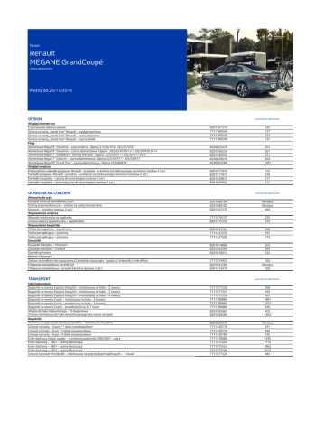 Nowe Renault MEGANE GrandCoupé Gama akcesoriów Ważny od 20/11/2016 DESIGN Wygląd zewnętrzny Chromowane osłony lusterek Osłona na kartę „hands free” Renault – wygląd sportowy Osłona na kartę „hands free” Renault – szara platynowa Osłona na kartę „hands free” Renault – czarna étoilé Felgi Aluminiowa felga 16” Silverline – szarosrebrna - Opona 215/60 R16 - 205/55 R16 Aluminiowa felga 16” Silverline – czarna diamentowa - Opona : 205/55 R16 91 V i 205/50 R16 91 H Aluminiowa felga 17” Exception – ciemny antracyt - Opona : 225/55 R17 i 205/50 R17 93 V Aluminiowa felga 17” Celcium – czarna diamentowa - Opona 225/55 R17 - 205/50 R17 Aluminiowa felga 18” Grand Tour – czarna diamentowa - Opona 225/40 R18 Wygląd wnętrza Podświetlane nakładki progowe - Renault - przednie - w kolorze szczotkowanego aluminium (zestaw 2 szt.) Nakładki progowe- Renault - przednie – w kolorze szczotkowanego aluminium (zestaw 2 szt.) Nakładki na pedały – ręczna skrzynia biegów (zestaw 3 szt.) Nakładki na pedały – automatyczna skrzynia biegów (zestaw 2 szt.) Cena brutto dla klienta 8201547579 7711780544 7711780545 7711780549 342 137 137 137 403002347R 8201549239 8201549242 403002961R 403006336R 501 501 721 702 1201 8201577970 8201577972 8201629815 8201629832 715 530 317 317 OCHRONA NA CODZIEŃ Akcesoria do szyb Komplet osłon przeciwsłonecznych Osłony przeciwsłoneczne – zestaw na szyby boczne tylne Owiewki – przednie (zestaw 2 szt.) Wyposażenie wnętrza Wieszak montowany na zagłówku Zestaw palacza (popielniczka + zapalniczka) Wyposażenie bagażnika Wkład do bagażnika - dwustronny Siatka porządkująca – pozioma Siatka porządkująca – pionowa Dywaniki Dywaniki tekstylne – Premium Dywaniki tekstylne – Confort Dywniki gumowe Ochrona karoserii Zestaw ze środkami do czyszczenia (3 produkty czyszczące, 1 pasta i 2 ściereczki z mikrofibry) Chlapacze standardowe - przód i tył Chlapacze standardowe – przedni lub tylny (zestaw 2 szt.) Cena brutto dla klienta 8201680104 8201680102 8201547573 Wkrótce Wkrótce 260 7711578137 8201375535 225 125 8201643361 7711422533 7711227502 386 197 172 8201614869 8201654204 8201618013 203 185 232 7711574925 8201642585 8201212479 162 Wkrótce 100 TRANSPORT Haki holownicze Bagażnik na rowery Express Hang On – montowany na haku – 2 rowery Bagażnik na rowery Express Hang On – montowany na haku – 3 rowery Bagażnik na rowery Express Hang On – montowany na haku – 4 rowery Bagażnik na rowery Coach – montowany na haku - 2 rowery Bagażnik na rowery Coach – montowany na haku - 3 rowery Bagażnik na rowery Coach – przedłużenie na 3+1 rower Wiązka do haka holowniczego - 13-biegunowa Zestaw montażowy do haka demontowanego bez użycia narzędzi Bagażniki Aluminiowe poprzeczki dachowe QuickFix – montowane na dachu Uchwyt na narty – 4 pary / 1 deski snowboardowe Uchwyt na narty – 6 par / 2 deski snowboardowe Uchwyt na narty – 6 par / 4 deski snowboardowe Kufer dachowy Urban Loader – o zmiennej pojemniści 300/500 l – szary Kufer dachowy – 380 l – czarny błyszczący Kufer dachowy – 480 l – czarny błyszczący Kufer dachowy – 630 l – czarny błyszczący Uchwyt na rower Proride 80 – montowany na poprzeczkach dachowych – 1 rower Cena brutto dla klienta 7711577326 7711577327 7711577328 7711780884 7711780885 7711780886 8201595967 8201636365 266 443 581 1881 2257 626 403 1363 8201633736 7711420778 7711420779 7711420780 7711578086 7711575524 7711575525 7711575526 7711577325 Wkrótce 341 390 545 3355 1770 1862 2072 484 MULTIMEDIA Telefon Przenośny uchwyt na smartfona- monotowany na wywietrznik – magnetyczny Przenośny uchwyt na smartfona- z przyssawką Przenośny uchwyt na smartfona- monotowany na wywietrznik Zestaw głosnomówiący Parrot MINIKIT Néo Zestaw głośnomówiący Supertooth Crystal Wideo Uchwyt na tablet (7–10”) Przenośny odtwarzacz wideo Logicom D-JIX 7'' Audio Zestaw głośników Focal Music Premium 8.1 (2 tweetery, 2 z przodu, 4 z tyłu, 1 subwoofer) Zestaw głośników Focal Music Premium 6.1 (2 tweetery, 2 z przodu, 2 z tyłu, 1 subwoofer) Zestaw głośników Focal Music Live 4.0 (2 tweetery, 2 z przodu lub z tyłu) Zestaw głośników Focal Music Drive 2.0 (2 z przodu lub z tyłu) Cena brutto dla klienta 7711782048 7711780872 7711780873 7711575613 7711574999 89 77 77 341 233 7711574991 7711575977 233 614 7711578133 + 7711578132 7711578133 7711578132 7711575880 3884 2954 930 339 BEZPIECZEŃSTWO Pomoc i oznakowanie Zestaw bezpieczeństwa (kamizelka, trójkąt i apteczka) Mocowanie do gaśnicy Gaśnica - 1 kg Zabezpieczenia antywłamaniowe i monitoring Alarm perymetryczny i wolumetryczny z czujnikiem przechyłu - dla pojazdu z systemem Start & Stop Wideorejestrator jazdy – Road Eyes Foteliki dziecięce Nosidełko dla dzieci Babysafe Plus Podstawka Isofix pod nosidełko dla dzieci Fotelik dziecięcy Duoplus Isofix Fotelik dziecięcy Kidplus Fotelik dziecięcy Kidfix Isofix Łańcuchy i opaski Łańcuchy śniegowe – Premium Grip – Rozmiar 60 – R15”, R16”, R17”, R18” Łańcuchy śniegowe standardowe - 9 mm – Rozmiar 80 - R15” Łańcuchy śniegowe standardowe - 9 mm - Rozmiar 90 - R16" Opaski śniegowe – Rozmiar 54 – R15” Opaski śniegowe - Rozmiar 53 - R16" Wspomaganie jazdy System wspomagania parkowania tyłem System wspomagania parkowania przodem Kamera martwego punktu Kamera z widokiem panoramicznym 360° Cena brutto dla klienta 7711780759 8201598672 7711419386 53 104 57 8201619465 7711577533 1281 884 7711427434 7711427427 7711423381 7711423382 7711422951 865 852 1335 787 968 7711780254 7711578469 7711578470 7711578651 7711578650 1211 338 338 273 273 8201537455 8201537464 Wkrótce Wkrótce 817 817 Wkrótce Wkrótce