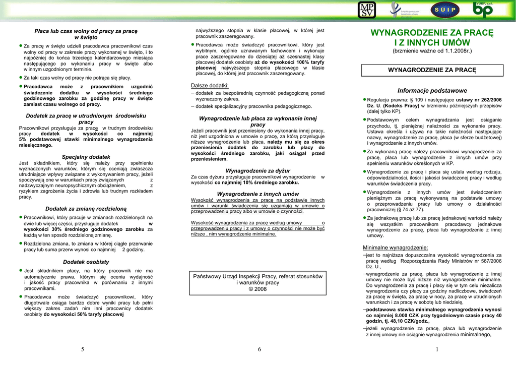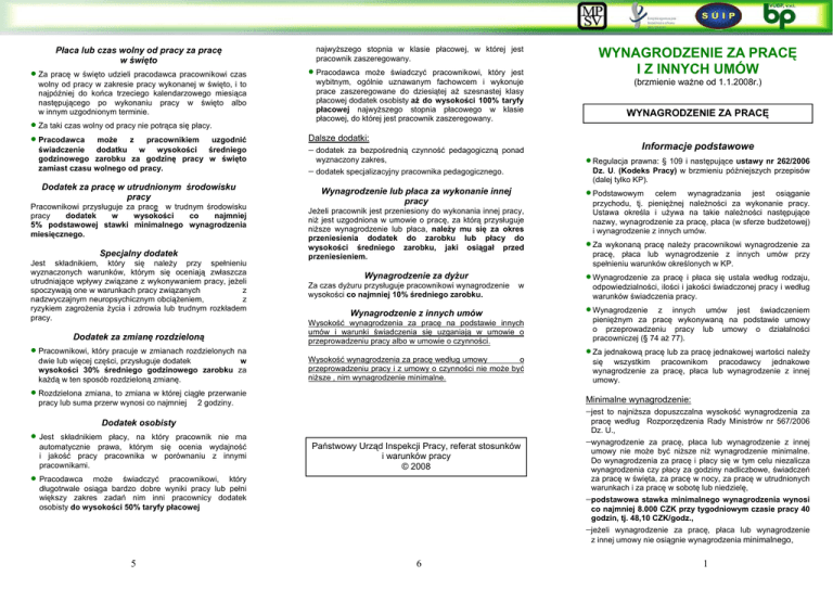 Płaca lub czas wolny od pracy za pracę w święto • Za pracę w święto udzieli pracodawca pracownikowi czas wolny od pracy w zakresie pracy wykonanej w święto, i to najpóźniej do końca trzeciego kalendarzowego miesiąca następującego po wykonaniu pracy w święto albo w innym uzgodnionym terminie. • Za taki czas wolny od pracy nie potrąca się płacy. • Pracodawca może z pracownikiem uzgodnić świadczenie dodatku w wysokości średniego godzinowego zarobku za godzinę pracy w święto zamiast czasu wolnego od pracy. Dodatek za pracę w utrudnionym środowisku pracy Pracownikowi przysługuje za pracę w trudnym środowisku pracy dodatek w wysokości co najmniej 5% podstawowej stawki minimalnego wynagrodzenia miesięcznego. Specjalny dodatek Jest składnikiem, który się należy przy spełnieniu wyznaczonych warunków, którym się oceniają zwłaszcza utrudniające wpływy związane z wykonywaniem pracy, jeżeli spoczywają one w warunkach pracy związanych z nadzwyczajnym neuropsychicznym obciążeniem, z ryzykiem zagrożenia życia i zdrowia lub trudnym rozkładem pracy. Dodatek za zmianę rozdzieloną • Pracownikowi, który pracuje w zmianach rozdzielonych na dwie lub więcej części, przysługuje dodatek w wysokości 30% średniego godzinowego zarobku za każdą w ten sposób rozdzieloną zmianę. najwyższego stopnia w klasie płacowej, w której jest pracownik zaszeregowany. • Pracodawca może świadczyć pracownikowi, który jest wybitnym, ogólnie uznawanym fachowcem i wykonuje prace zaszeregowane do dziesiątej aż szesnastej klasy płacowej dodatek osobisty aż do wysokości 100% taryfy płacowej najwyższego stopnia płacowego w klasie płacowej, do której jest pracownik zaszeregowany. − dodatek za bezpośrednią czynność pedagogiczną ponad wyznaczony zakres, − dodatek specjalizacyjny pracownika pedagogicznego. Jeżeli pracownik jest przeniesiony do wykonania innej pracy, niż jest uzgodniona w umowie o pracę, za którą przysługuje niższe wynagrodzenie lub płaca, należy mu się za okres przeniesienia dodatek do zarobku lub płacy do wysokości średniego zarobku, jaki osiągał przed przeniesieniem. Wynagrodzenie za dyżur Za czas dyżuru przysługuje pracownikowi wynagrodzenie wysokości co najmniej 10% średniego zarobku. w Wynagrodzenie z innych umów Wysokość wynagrodzenia za pracę na podstawie innych umów i warunki świadczenia się uzganiają w umowie o przeprowadzeniu pracy albo w umowie o czynności. Wysokość wynagrodzenia za pracę według umowy o przeprowadzeniu pracy i z umowy o czynności nie może być niższe , nim wynagrodzenie minimalne. • Pracodawca • Regulacja prawna: § 109 i następujące ustawy nr 262/2006 Dz. U. (Kodeks Pracy) w brzmieniu późniejszych przepisów (dalej tylko KP). celem wynagradzania jest osiąganie przychodu, tj. pieniężnej należności za wykonanie pracy. Ustawa określa i używa na takie należności następujące nazwy, wynagrodzenie za pracę, płaca (w sferze budżetowej) i wynagrodzenie z innych umów. • Za wykonaną pracę należy pracownikowi wynagrodzenie za pracę, płaca lub wynagrodzenie z innych umów przy spełnieniu warunków określonych w KP. • Wynagrodzenie za pracę i płaca się ustala według rodzaju, odpowiedzialności, ilości i jakości świadczonej pracy i według warunków świadczenia pracy. • Wynagrodzenie z innych umów jest świadczeniem pieniężnym za pracę wykonywaną na podstawie umowy o przeprowadzeniu pracy lub umowy o działalności pracowniczej (§ 74 aż 77). • Za jednakową pracę lub za pracę jednakowej wartości należy się wszystkim pracownikom pracodawcy jednakowe wynagrodzenie za pracę, płaca lub wynagrodzenie z innej umowy. −jest Państwowy Urząd Inspekcji Pracy, referat stosunków i warunków pracy © 2008 może świadczyć pracownikowi, który długotrwale osiąga bardzo dobre wyniki pracy lub pełni większy zakres zadań nim inni pracownicy dodatek osobisty do wysokości 50% taryfy płacowej 5 Informacje podstawowe Minimalne wynagrodzenie: Dodatek osobisty składnikiem płacy, na który pracownik nie ma automatycznie prawa, którym się ocenia wydajność i jakość pracy pracownika w porównaniu z innymi pracownikami. WYNAGRODZENIE ZA PRACĘ • Podstawowym Wynagrodzenie lub płaca za wykonanie innej pracy 2 godziny. • Jest (brzmienie ważne od 1.1.2008r.) Dalsze dodatki: • Rozdzielona zmiana, to zmiana w której ciągłe przerwanie pracy lub suma przerw wynosi co najmniej WYNAGRODZENIE ZA PRACĘ I Z INNYCH UMÓW 6 to najniższa dopuszczalna wysokość wynagrodzenia za pracę według Rozporzędzenia Rady Ministrów nr 567/2006 Dz. U., −wynagrodzenie za pracę, płaca lub wynagrodzenie z innej umowy nie może być niższe niż wynagrodzenie minimalne. Do wynagrodzenia za pracę i płacy się w tym celu niezalicza wynagrodzenia czy płacy za godziny nadliczbowe, świadczeń za pracę w święta, za pracę w nocy, za pracę w utrudnionych warunkach i za pracę w sobotę lub niedzielę, −podstawowa stawka minimalnego wynagrodzenia wynosi co najmniej 8.000 CZK przy tygodniowym czasie pracy 40 godzin, tj. 48,10 CZK/godz., −jeżeli wynagrodzenie za pracę, płaca lub wynagrodzenie z innej umowy nie osiągnie wynagrodzenia minimalnego, 1 jest pracodawca wyrównanie. zobowiązany pracownikowi udzielić Gwarantowane wynagrodzenie: − to wynagrodzenie lub płaca, na które ma pracownik prawo według KP, umowy, przepisu wewnętrznego lub regulaminu wynagrodzenia, − najniższa stawka gwarantowanego wynagrodzenia nie może być niższa od podstawowej stawki minimalnego wynagrodzenia, − jeżeli wynagrodzenie lub płaca nie osiągnie najniższej stawki gwarantowanego wynagrodzenia, jest pracodawca zobowiązany świadczyć pracownikowi wyrównanie. Wynagrodzenie za pracę • Ustala się w układzie zbiorowym, umowie o pracę albo innej umowie, ewentualnie pracodawca ustala wewnętrznym przepisem – regulaminem wynagrodze
