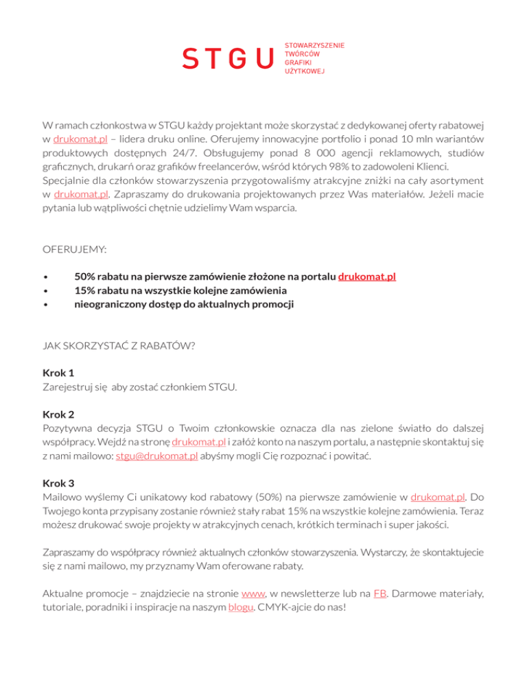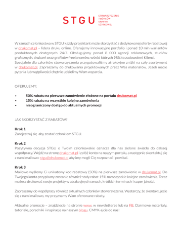 W ramach członkostwa w STGU każdy projektant może skorzystać z dedykowanej oferty rabatowej w drukomat.pl – lidera druku online. Oferujemy innowacyjne portfolio i ponad 10 mln wariantów produktowych dostępnych 24/7. Obsługujemy ponad 8 000 agencji reklamowych, studiów graficznych, drukarń oraz grafików freelancerów, wśród których 98% to zadowoleni Klienci. Specjalnie dla członków stowarzyszenia przygotowaliśmy atrakcyjne zniżki na cały asortyment w drukomat.pl. Zapraszamy do drukowania projektowanych przez Was materiałów. Jeżeli macie pytania lub wątpliwości chętnie udzielimy Wam wsparcia. OFERUJEMY: • • • 50% rabatu na pierwsze zamówienie złożone na portalu drukomat.pl 15% rabatu na wszystkie kolejne zamówienia nieograniczony dostęp do aktualnych promocji JAK SKORZYSTAĆ Z RABATÓW? Krok 1 Zarejestruj się aby zostać członkiem STGU. Krok 2 Pozytywna decyzja STGU o Twoim członkowskie oznacza dla nas zielone światło do dalszej współpracy. Wejdź na stronę drukomat.pl i załóż konto na naszym portalu, a następnie skontaktuj się z nami mailowo: [email protected] abyśmy mogli Cię rozpoznać i powitać. Krok 3 Mailowo wyślemy Ci unikatowy kod rabatowy (50%) na pierwsze zamówienie w drukomat.pl. Do Twojego konta przypisany zostanie również stały rabat 15% na wszystkie kolejne zamówienia. Teraz możesz drukować swoje projekty w atrakcyjnych cenach, krótkich terminach i super jakości. Zapraszamy do współpracy również aktualnych członków stowarzyszenia. Wystarczy, że skontaktujecie się z nami mailowo, my przyznamy Wam oferowane rabaty. Aktualne promocje – znajdziecie na stronie www, w newsletterze lub na FB. Darmowe materiały, tutoriale, poradniki i inspiracje na naszym blogu. CMYK-ajcie do nas!