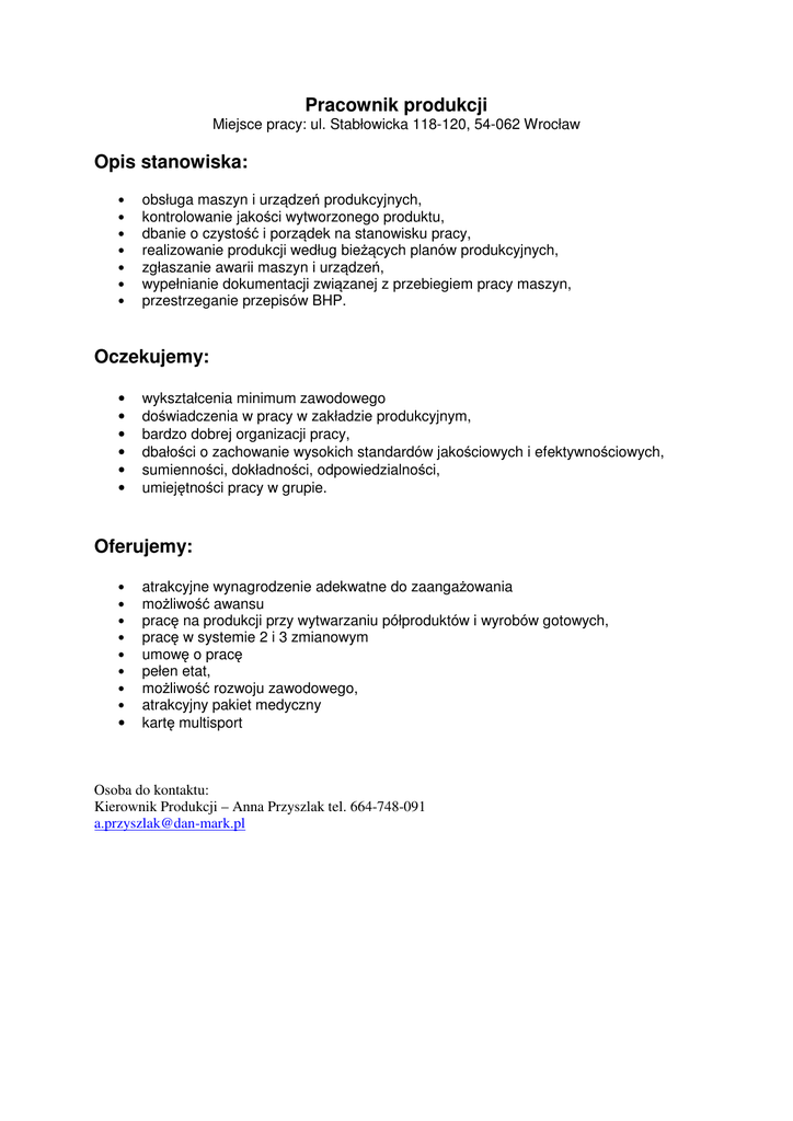 Pracownik produkcji Opis stanowiska: Oczekujemy - DAN-MARK