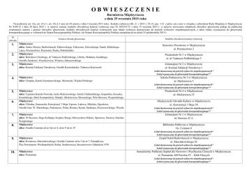 OBWIESZCZENIE Burmistrza Międzyrzecza z dnia 25 września 2015 roku Na podstawie art. 12a, art. 16 § 1, art. 53a § 1 oraz art.54 ustawy z dnia 5 stycznia 2011 roku - Kodeks wyborczy (Dz. U. z 2011 r. Nr 21, poz. 112 z późn. zm.) oraz w związku z uchwałami Rady Miejskiej w Międzyrzeczu Nr X/84/15 z dnia 20 lipca 2015 r. w sprawie zmiany siedziby obwodowej komisji wyborczej oraz Nr XII/101/15 z dnia 15 września 2015 r. w sprawie utworzenia odrębnych obwodów głosowania podaję do publicznej wiadomości numery i granice obwodów głosowania, siedziby obwodowych komisji wyborczych oraz lokale wyborcze dostosowane do potrzeb wyborców niepełnosprawnych, a także lokale wyznaczone do głosowania korespondencyjnego w wyborach do Sejmu Rzeczypospolitej Polskiej i do Senatu Rzeczypospolitej Polskiej zarządzonych na dzień 25 października 2015 r. Nr obwodu 1. 2. 3. Granice obwodu głosowania Międzyrzecz ulice: Antka, Boryny, Budowlanych, Dąbrowskiego, Fabryczna, Głowackiego, Hanki, Kilińskiego, Lipce, Przemysłowa, Reymonta, Rocha, Rokitniańska Międzyrzecz ulice: Bolesława Chrobrego, dr Tadeusza Podbielskiego, Libelta, Mahatmy Gandhiego, Osiedle Zamkowe, Waszkiewicza, Winnica, Zakaszewskiego Międzyrzecz ulice: Komisji Edukacji Narodowej, Osiedle Kasztelańskie, Tadeusza Kościuszki Siedziba obwodowej komisji wyborczej Starostwo Powiatowe w Międzyrzeczu ul. Przemysłowa 2 Przedszkole Nr 1 w Międzyrzeczu ul. dr Tadeusza Podbielskiego 5 Gimnazjum Nr 2 w Międzyrzeczu ul. Komisji Edukacji Narodowej 1 Lokal dostosowany do potrzeb wyborców niepełnosprawnych* Lokal wyznaczony do głosowania korespondencyjnego** 4. Międzyrzecz ulice: Chopina, Karola Szymanowskiego, Moniuszki, Wojska Polskiego Szkoła Podstawowa Nr 3 w Międzyrzeczu ul. Mickiewicza 5 Lokal dostosowany do potrzeb wyborców niepełnosprawnych* Lokal wyznaczony do głosowania korespondencyjnego** 5. 6. 7. 8. Międzyrzecz ulice: Cypriana Kamila Norwida, Jacka Malczewskiego, Józefa Chełmońskiego, Kopernika, Kossaka, Krasińskiego, Marii Konopnickiej, Matejki, Mickiewicza, Słowackiego, Wita Stwosza, Wyspiańskiego Międzyrzecz ulice: Chłodna, Garncarska, Konstytucji 3 Maja, Lipowa, Łąkowa, Młyńska, Ogrodowa, Osiedle Gen. W. Sikorskiego, Podzamcze, Polna, Różana, Rynek, Spokojna, Świerczewskiego, Wesoła Międzyrzecz ulice: 30 Stycznia, Hugo Kołłątaja, Księdza Skargi, Mieczysława Mikuły, Sportowa, Staszica, Szkolna, Ściegiennego Międzyrzecz ulice: Osiedle Centrum od nr 1do nr 4, od nr 9 do nr 19 Przedszkole Nr 6 w Międzyrzeczu ul. Mickiewicza 25 Międzyrzecki Ośrodek Kultury w Międzyrzeczu ul. Konstytucji 3 Maja 30 Lokal dostosowany do potrzeb wyborców niepełnosprawnych* Lokal wyznaczony do głosowania korespondencyjnego** Gimnazjum Nr 1 w Międzyrzeczu ul. Staszica 22 A Biblioteka Publiczna w Międzyrzeczu Os. Centrum 8 Lokal dostosowany do potrzeb wyborców niepełnosprawnych* Lokal wyznaczony do głosowania korespondencyjnego** 9. 10. Międzyrzecz ulice: Kwiatowa, Marcinkowskiego, Osiedle Centrum od nr 5 do nr 7, Pamiątkowa, Plac Powstańców Wielkopolskich, Rolna, Sienkiewicza, Stoczniowców Gdańskich 1970 Międzyrzecz ulice: Poznańska Zespół Szkół Budowlanych w Międzyrzeczu ul. Marcinkowskiego 26 Lokal dostosowany do potrzeb wyborców niepełnosprawnych* Lokal wyznaczony do głosowania korespondencyjnego** Samodzielny Publiczny Szpital dla Nerwowo i Psychicznie Chorych w Międzyrzeczu ul. Poznańska 109 Pawilon IV – Klub Chorych Lokal dostosowany do potrzeb wyborców niepełnosprawnych* Lokal wyznaczony do głosowania korespondencyjnego** 11. 12. 13. 14. 15. Miejscowości: Kaława, Pniewo, Szumiąca, Wysoka Miejscowości: Bukowiec, Czarny Bocian, Wyszanowo Miejscowości: Bobowicko, Karolewo, Kuligowo, Kuźnik, Łęgowskie, Marianowo, Międzyrzecz - Wybudowanie, Skoki, Żółwin Miejscowości: Brzozowy Ług, Głębokie, Jagielnik, Jeleniegłowy, Kalsko, Kęszyca - Kolonia, Kolonia Żółwin, Kwiecie, Lubosinek, Porąbka, Rojewo, Święty Wojciech, Wojciechówek Miejscowości: Kęszyca, Kęszyca Leśna, Nietoperek 16. Miejscowości: Gorzyca, Kursko, Pieski, Zamostowo 17. Międzyrzecz ulice: Piastowska 18. Międzyrzecz ulice: Bolesława Prusa, Jana Zamoyskiego, Pięciu Świętych Braci Międzyrzeckich, Stanisława Ożoga, Zachodnia 19. 20. Międzyrzecz ulice: Aleksandra Zawadzkiego, Alfa Kowalskiego, Długa, Krótka, Ks. Inf. Henryka Guzowskiego, Leśna, L. Kiszmanowicza, Marcelego Nowotki, Rzemieślnicza, Słoneczna, Sybiraka, Żołnierska Międzyrzecz Szpital Międzyrzecki Sp. z o. o. w Międzyrzeczu, ul. Konstytucji 3 Maja 35 21. Międzyrzecz Areszt Śledczy w Międzyrzeczu, ul. Młyńska 21 22. Międzyrzecz Samodzielny Publiczny Szpital dla Nerwowo i Psychicznie Chorych w Międzyrzeczu, ul. Poznańska 109 Szkoła Podstawowa w Kaławie 92 Szkoła Podstawowa w Bukowcu 61 Zespół Szkół Centrum Kształcenia Rolniczego w Bobowicku ul. Międzyrzecka 7a Zespół Szkół Ekonomicznych w Międzyrzeczu ul. Libelta 4 Remiza Ochotniczej Straży Pożarnej w Kęszycy Leśnej 56 Centrum Rekreacyjno-Sportowe w Gorzycy 36 Lokal dostosowany do potrzeb wyborców niepełnosprawnych* Lokal wyznaczony do głosowania korespondencyjnego** Ośrodek Szkolenia i Wychowania Ochotnicze Hufce Pracy w Międzyrzeczu ul. Piastowska 18 Przedszkole Nr 4 w Międzyrzeczu ul. Zachodnia 8 Lokal dostosowany do potrzeb wyborców niepełnosprawnych* Lokal wyznaczony do głosowania korespondencyjnego** Nadleśnictwo Międzyrzecz w Międzyrzeczu ul. Poznańska 38 Lokal dostosowany do potrzeb wyborców niepełnosprawnych* Lokal wyznaczony do głosowania korespondencyjnego** Szpital Międzyrzecki Sp. z o. o. w Międzyrzeczu ul. Konstytucji 3 Maja 35 Areszt Śledczy w Międzyrzeczu ul. Młyńska 21 Samodzielny Publiczny Szpital dla Nerwowo i Psychicznie Chorych w Międzyrzeczu Pawilon IV – Klub Chorych ul. Poznańska 109 (wejście główne) * Wyborca niepełnosprawny o znacznym lub umiarkowanym stopniu niepełnosprawnoś