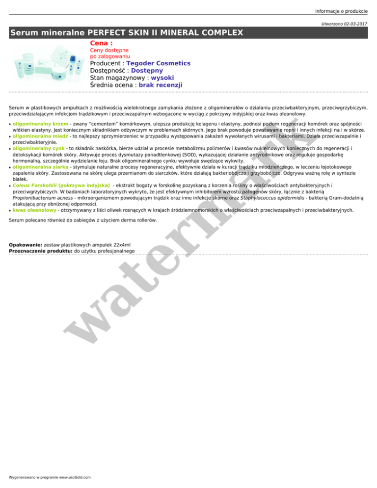 Informacje o produkcie Utworzono 02-03-2017 Serum mineralne PERFECT SKIN II MINERAL COMPLEX Cena : Ceny dostępne po zalogowaniu Producent : Tegoder Cosmetics Dostępność : Dostępny Stan magazynowy : wysoki Średnia ocena : brak recenzji Serum w plastikowych ampułkach z możliwością wielokrotnego zamykania złożone z oligominerałów o działaniu przeciwbakteryjnym, przeciwgrzybiczym, przeciwdziałającym infekcjom trądzikowym i przeciwzapalnym wzbogacone w wyciąg z pokrzywy indyjskiej oraz kwas oleanolowy. ● ● ● ● ● oligomineralny krzem - zwany “cementem” komórkowym, ulepsza produkcję kolagenu i elastyny, podnosi poziom regeneracji komórek oraz spójności włókien elastyny. Jest koniecznym składnikiem odżywczym w problemach skórnych. Jego brak powoduje powstawanie ropni i innych infekcji na i w skórze. oligomineralna miedź - to najlepszy sprzymierzeniec w przypadku występowania zakażeń wywołanych wirusami i bakteriami. Działa przeciwzapalnie i przeciwbakteryjnie. oligomineralny cynk - to składnik naskórka, bierze udział w procesie metabolizmu polimerów i kwasów nukleinowych koniecznych do regeneracji i detoksykacji komórek skóry. Aktywuje proces dysmutazy ponadtlenkowej (SOD), wykazującej działanie antyrodnikowe oraz reguluje gospodarkę hormonalną, szczególnie wydzielanie łoju. Brak oligomineralnego cynku wywołuje swędzące wykwity. oligomineralna siarka - stymuluje naturalne procesy regeneracyjne, efektywnie działa w kuracji trądziku młodzieńczego, w leczeniu łojotokowego zapalenia skóry. Zastosowana na skórę ulega przemianom do siarczków, które działają bakteriobójczo i grzybobójczo. Odgrywa ważną rolę w syntezie białek. Coleus Forskohlii (pokrzywa indyjska) - ekstrakt bogaty w forskolinę pozyskaną z korzenia rośliny o właściwościach antybakteryjnych i przeciwgrzybiczych. W badaniach laboratoryjnych wykryto, że jest efektywnym inhibitorem wzrostu patogenów skóry, łącznie z bakterią Propiionibacterium acness - mikroorganizmem powodującym trądzik oraz inne infekcje skórne oraz Staphylococcus epidermidis - bakterią Gram-dodatnią atakującą przy obniżonej odporności. kwas oleanolowy - otrzymywany z liści oliwek rosnących w krajach śródziemnomorskich o właściwościach przeciwzapalnych i przeciwbakteryjnych. er m ar k ● Serum polecane również do zabiegów z użyciem derma rollerów. w at Opakowanie: zestaw plastikowych ampułek 22x4ml Przeznaczenie produktu: do użytku profesjonalnego Wygenerowano w programie www.oscGold.com