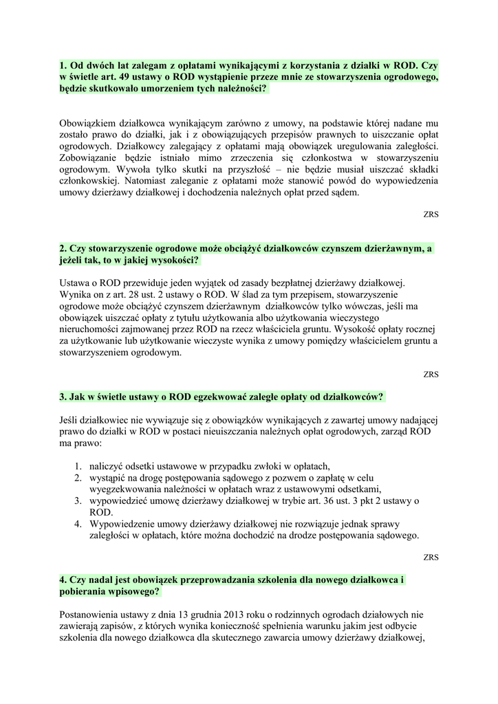 1. Od dwóch lat zalegam z opłatami wynikającymi z korzystania z działki w ROD. Czy w świetle art. 49 ustawy o ROD wystąpienie przeze mnie ze stowarzyszenia ogrodowego, będzie skutkowało umorzeniem tych należności? Obowiązkiem działkowca wynikającym zarówno z umowy, na podstawie której nadane mu zostało prawo do działki, jak i z obowiązujących przepisów prawnych to uiszczanie opłat ogrodowych. Działkowcy zalegający z opłatami mają obowiązek uregulowania zaległości. Zobowiązanie będzie istniało mimo zrzeczenia się członkostwa w stowarzyszeniu ogrodowym. Wywoła tylko skutki na przyszłość – nie będzie musiał uiszczać składki członkowskiej. Natomiast zaleganie z opłatami może stanowić powód do wypowiedzenia umowy dzierżawy działkowej i dochodzenia należnych opłat przed sądem. ZRS 2. Czy stowarzyszenie ogrodowe może obciążyć działkowców czynszem dzierżawnym, a jeżeli tak, to w jakiej wysokości? Ustawa o ROD przewiduje jeden wyjątek od zasady bezpłatnej dzierżawy działkowej. Wynika on z art. 28 ust. 2 ustawy o ROD. W ślad za tym przepisem, stowarzyszenie ogrodowe może obciążyć czynszem dzierżawnym działkowców tylko wówczas, jeśli ma obowiązek uiszczać opłaty z tytułu użytkowania albo użytkowania wieczystego nieruchomości zajmowanej przez ROD na rzecz właściciela gruntu. Wysokość opłaty rocznej za użytkowanie lub użytkowanie wieczyste wynika z umowy pomiędzy właścicielem gruntu a stowarzyszeniem ogrodowym. ZRS 3. Jak w świetle ustawy o ROD egzekwować zaległe opłaty od działkowców? Jeśli działkowiec nie wywiązuje się z obowiązków wynikających z zawartej umowy nadającej prawo do działki w ROD w postaci nieuiszczania należnych opłat ogrodowych, zarząd ROD ma prawo: 1. naliczyć odsetki ustawowe w przypadku zwłoki w opłatach, 2. wystąpić na drogę postępowania sądowego z pozwem o zapłatę w celu wyegzekwowania należności w opłatach wraz z ustawowymi odsetkami, 3. wypowiedzieć umowę dzierżawy działkowej w trybie art. 36 ust. 3 pkt 2 ustawy o ROD. 4. Wypowiedzenie umowy dzierżawy działkowej nie rozwiązuje jednak sprawy zaległości w opłatach, które można dochodzić na drodze postępowania sądowego. ZRS 4. Czy nadal jest obowiązek przeprowadzania szkolenia dla nowego działkowca i pobierania wpisowego? Postanowienia ustawy z dnia 13 grudnia 2013 roku o rodzinnych ogrodach działowych nie zawierają zapisów, z których wynika konieczność spełnienia warunku jakim jest odbycie szkolenia dla nowego działkowca dla skutecznego zawarcia umowy dzierżawy działkowej, czy przy zatwierdzenia umowy przeniesienia praw do działki. Obecnie szkolenie jest przywilejem działkowca, z którego powinien skorzystać, aby poznać zasady funkcjonowania ROD, zagospodarowania działki, obowiązujące przepisy prawne tym bardziej, że podpisując umowę dzierżawy działkowej lub przeniesienia prawa do działki oświadcza, że zapoznał się z postanowieniami ustawy o ROD oraz regulaminem ROD. Opłata wpisowa w aktualnym systemie prawnym została zastąpiona opłatą ogrodową wpłacaną przez działkowca w roku nabycia prawa do działki wynikającą z § 147 ust. 2 pkt 2 statutu PZD. Obowiązuje ona każdego nowego działkowca. ZRS 5. Czy jeśli żona chce mieć wspólne prawo do tej samej działki razem z mężem, musi wnieść opłaty wynikające z § 147 ust. 1 pkt 1 i 2 statutu PZD? Zgodnie z § 148 statutu PZD małżonkowie posiadając wspólnie prawo do działki opłacają opłaty ogrodowe w wymiarze przypadającym na jedną działkę. Oznacza to, że małżonka nie będzie wnosiła opłat wynikających z § 147 ust. 1 pkt 1 i 2 statutu PZD. ZRS 6. W 2014 roku przeniosłam prawo do działki na inną osobę. Umowa została zaakceptowana przez zarząd ROD. Czy należy mi się zwrot wniesionej w 2010 roku opłaty inwestycyjnej? Tak. Zwrot dotyczy tych działkowców, którzy wnieśli opłatę inwestycyjną przed dniem 15 stycznia 2015 r., czyli Pani również. Krajowa Rada PZD podjęła tego dnia uchwałę nr 6/XXIV/2015 w sprawie inwestycji i remontów w rodzinnych ogrodach działkowych w PZD, w której stwierdziła utratę mocy uchwały nr 9/VIII/1999 Krajowej Rady PZD z dnia 17 listopada 1999 r. w sprawie opłaty inwestycyjnej oraz Instrukcji Prezydium KR PZD w sprawie zasad ustalania wysokości zwrotu opłat inwestycyjnych przy zmianie użytkownika działki zatwierdzona uchwałą z dnia 20 maja 1992 r., zgodnie z którą dokonywano zwrotu opłaty inwestycyjnej po odjęciu amortyzacji, która wynosiła 5% w skali roku. ZRS 7. Czy jeśli żona, która nie miała wspólnego prawa do działki w ROD razem z mężem, a po jego śmierci wchodzi w jego prawa, wpłaca opłaty ogrodowe wnoszone w roku nabycia prawa do działki wynikające z § 147 ust. 1 pkt 1 i 2 statutu PZD? Małżonka wstępująca w prawo do działki po zmarłym mężu wpłaca podwyższoną opłatę ogrodową wnoszoną w roku nabycia prawa działki wynikającą z § 147 ust. 1 pkt 2 statutu PZD. Tę opłatę wnosi każda osoba, która nabywa prawo do działki, bądź wstępuje w prawa po zmarłej osobie bliskiej. Przepisy statutu PZD nie przewidują zwolnienia od tej opłaty, w przeciwieństwie do dawnej opłaty inwestycyjnej, czyli opłaty ogrodowej wnoszonej w roku nabycia prawa do działki wynikającej z § 147 ust. 1 pkt 1 statutu PZD. Na to zwolnienie pozwala przepis § 147 ust. 4 statutu PZD. ZRS 8. Od kilku miesięcy zalegam z opłatami za energię elektryczną? Czy zarząd ROD może odciąć mi dostawy prądu? Tak, opóźnienie z uiszczaniem opłaty z tytułu zużytej energii może stanowić podstawę do zablokowania dostaw energii przez zarząd ROD. Długość takiego opóźnienia powinna jednak wynikać z uchwały walnego zebrania. Zarząd ROD zobowiązany jest również powiadomić działkowca o zamiarze odcięcia mu energii elektrycznej z tytułu nieopłacania należności za jej zużycie. WZ 9. Chcę zamienić