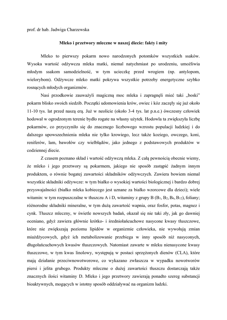 prof. dr hab. Jadwiga Charzewska Mleko i przetwory mleczne w naszej diecie: fakty i mity Mleko to pierwszy pokarm nowo narodzonych potomków wszystkich ssaków. Wysoka wartość odżywcza mleka matki, niemal natychmiast po urodzeniu, umożliwia młodym ssakom samodzielność, w tym ucieczkę przed wrogiem (np. antylopom, wielorybom). Odżywcze mleko matki pokrywa wszystkie potrzeby energetyczne szybko rosnących młodych organizmów. Nasi przodkowie zauważyli magiczną moc mleka i zapragnęli mieć taki „boski” pokarm blisko swoich siedzib. Początki udomowienia krów, owiec i kóz zaczęły się już około 11-10 tys. lat przed naszą erą. Już w neolicie (około 3-4 tys. lat p.n.e.) ówczesny człowiek hodował w ogrodzonym terenie bydło rogate na własny użytek. Hodowla ta zwiększyła liczbę pokarmów, co przyczyniło się do znacznego liczbowego wzrostu populacji ludzkiej i do dalszego upowszechnienia mleka nie tylko krowiego, lecz także koziego, owczego, koni, reniferów, lam, bawołów czy wielbłądów, jako jednego z podstawowych produktów w codziennej diecie. Z czasem poznano skład i wartość odżywczą mleka. Z całą pewnością obecnie wiemy, że mleko i jego przetwory są pokarmem, jakiego nie sposób zastąpić żadnym innym produktem, o równie bogatej zawartości składników odżywczych. Zawiera bowiem niemal wszystkie składniki odżywcze: w tym białko o wysokiej wartości biologicznej i bardzo dobrej przyswajalności (białko mleka kobiecego jest uznane za białko wzorcowe dla dzieci); wiele witamin: w tym rozpuszczalne w tłuszczu A i D, witaminy z grupy B (B1, B2, B6, B12), foliany; różnorodne składniki mineralne, w tym dużą zawartość wapnia, oraz fosfor, potas, magnez i cynk. Tłuszcz mleczny, w świetle nowszych badań, okazał się nie taki zły, jak go dawniej oceniano, gdyż zawiera głównie krótko- i średniołańcuchowe nasycone kwasy tłuszczowe, które nie zwiększają poziomu lipidów w organizmie człowieka, nie wywołują zmian miażdżycowych, gdyż ich metabolizowanie przebiega w inny sposób niż nasyconych, długołańcuchowych kwasów tłuszczowych. Natomiast zawarte w mleku nienasycone kwasy tłuszczowe, w tym kwas linolowy, występują w postaci sprzężonych dienów (CLA), które mają działanie przeciwnowotworowe, co wykazano zwłaszcza w wypadku nowotworów piersi i jelita grubego. Produkty mleczne o dużej zawartości tłuszczu dostarczają także znacznych ilości witaminy D. Mleko i jego przetwory zawierają ponadto szereg substancji bioaktywnych, mogących w istotny sposób oddziaływać na organizm ludzki. Warto również odnotować, że w wypadku dzieci i młodzieży powyżej 10. roku życia jedna szklanka mleka dostarcza wielu składników odżywczych w tym 1/4 ilości składników, które należy codziennie spożyć: białka, wapnia i fosforu, oraz połowę zalecanej ilości witamin B2 i B12, a także ponad 10% magnezu, cynku, potasu, witamin A, B1 i B6. Szczególnym składnikiem mleka jest wapń, który odgrywa rolę w regulacji przemian energetycznych w organizmie. Mała zawartość wapnia w diecie sprzyja akumulacji lipidów w komórce tłuszczowej, co przyczynia się do rozwoju otyłości. W wypadku niedoboru wapnia w diecie następuje demineralizacja własnej tkanki kostnej, co zagraża rozwojem osteoporozy, złamaniami kości i zwiększeniu ryzyka rozwoju chorób krążeniowych. Natomiast w metaanalizie uwzględniającej obserwację 270 000 osób wykazano silny trend do zmniejszenia ryzyka złamań kości biodra wraz ze wzrostem spożycia produktów mlecznych. Ocenia się, że we współczesnych społeczeństwach mleko i produkty mleczne dostarczają od 70% do 80% wapnia z diety, lecz nie u wszystkich osób. W Polsce co drugie dziecko w wieku 4 lat nie realizuje normy na wapń, a wśród uczniów od 80% do 90% ma niedobory tego pierwiastka w diecie. Wśród dorosłych osób niedobory wapnia w diecie wykazuje w Polsce 20-55% osób. W USA wykazano, że tylko 30% osób spożywa wapń w ilości zalecanej normami. Do niedoborów wapnia w diecie wskutek niespożywania mleka i produktów mlecznych przyczyniają się mity i fałszywe poglądy ostrzegające przed spożywaniem zarówno mleka, jak i produktów mlecznych. Faktem jest, że u pewnego odsetka osób stwierdza się alergie na białka mleka krowiego (także koziego, owczego lub kobylego). Nie występują one jednak często, ocenia się, że u około 1,5-2,8% ogólnej populacji dzieci do 2. roku życia. Częstość występowania alergii na białka mleka i produkty mleczne obniża się z wiekiem wraz z osiąganiem większej dojrzałości komórek nabłonka jelit i u starszych dzieci anomalia ta występuje już tylko do 0,3% osób. Reakcja na mleko może pojawić się po raz pierwszy również u osób dorosłych, a zwłaszcza u starszych. Jest to najczęściej niealergiczna nadwrażliwość pokarmowa w postaci nietolerancji laktozy, składnika mleka. Laktoza, czyli cukier mleczny, jest pożytecznym składnikiem mleka, gdyż sprzyja lepszemu przyswajaniu wapnia w przewodzie pokarmowym. Jednakże u niektórych osób z powodu braku enzymu laktazy przewód pokarmowy nie może rozłożyć cukru mlecznego na dwie składowe d-galaktozę i d-glukozę, stąd też odczuwany dyskomfort po spożyciu mleka. U osób starszych, zwłaszcza tych, które wcześniej unikały spożywania mleka, aktywność enzymu laktazy może zmniejszać się szybciej niż u innych i to one mogą odczuwać dolegliwości gastryczne, lecz niepowodujące poważnego zagrożenia dla zdrowia. Dla takich osób bezpieczniejsze jest spożywanie produktów fermentowanych, takich jak jogurt, kefir, sery, gdyż w nich większość lub całość d-galaktozy jest metabolizowana przez bakterie biorące udział w procesach fermentacji. Ponadto, obecnie są już dostępne produkty mleczne pozbawione laktozy, lub można kupić preparaty farmaceutyczne w postaci enzymu laktazy. Po dodaniu do napoju mlecznego enzym 