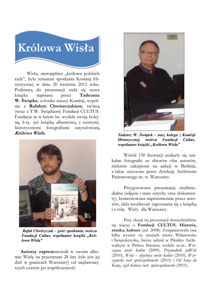 Królowa Wisła Wisła, niewątpliwa ,,królowa polskich rzek”, była tematem spotkania Komisji Historycznej w dniu 20 kwietnia 2012 roku. Podstawą do prezentacji stała się nowa ksiąŜka napisana przez Tadeusza W. Świątka, członka naszej Komisji, wspólnie z Rafałem Chwiszczukiem, twórcą (wraz z T.W. Świątkiem) Fundacji CULTUS. Fundacja ta w lutym br. wydała swoją kolejną, 6-tą juŜ ksiąŜkę albumową, z cennymi, historycznymi fotografiami zatytułowaną Królowa Wisła. Tadeusz W. Świątek – nasz kolega z Komisji Historycznej, twórca Fundacji Cultus, współautor ksiąŜki „Królowa Wisła” Wśród 150 ilustracji znalazły się unikalne fotografie ze zbiorów obu autorów, niektóre zakupione na aukcji w Berlinie, a takŜe uŜyczone przez dyrekcję Archiwum Państwowego m. st. Warszawy. Przygotowana prezentacja multimedialna (zdjęcia i stare sztychy oraz dokumenty), komentowana naprzemiennie przez autorów, dała moŜliwość zapoznania się z ksiąŜką i z rolą Wisły dla Warszawy. Rafał Chwiszczuk – gość spotkania, twórca Fundacji Cultus, współautor ksiąŜki „Królowa Wisła” Autorzy zaprezentowali w swoim albumie Wisłę na przestrzeni 28 km (tyle jest jej dziś w granicach Warszawy) od najdawniejszych czasów po współczesność. Przy okazji tej prezentacji dowiedzieliśmy się więcej o Fundacji CULTUS. Historia, sztuka, kultura (zał. 2008). Zorganizowała ona kilka wystaw na stacjach metra Wilanowska i Świętokrzyska, bierze udział w Pikniku Archiwalnym w Pałacu Staszica, wydała m.in.: Warszawa wielu kultur (2009), Przewodnik poWoli (2010), Wola – dzielnica wielu kultur (2010), Warszawski ruch społecznikowski (2011) i Od Sawy do Kamy, czyli kobiecy ruch społecznikowski (2011). Na te ksiąŜki oraz akcje pozyskiwała fundusze; album o Wiśle był natomiast wydany z funduszy własnych, stąd teraz szczególnie waŜny będzie efekt sprzedaŜy. KsiąŜkę zakupić moŜna w księgarniach oraz przez Internet. RównieŜ na naszym spotkaniu mogliśmy ją nie tylko obejrzeć, ale i kupić (dwie osoby skorzystały z okazji – cena promocyjna 50 zł.). Albumowa księga podzielona jest na działy tematyczne, tak by przedstawić Wisłę w róŜnorodnych aspektach jej symbiozy z miastem i jego mieszkańcami. Pokazuje jej urodę i walory, a takŜe niebezpieczeństwa powodzi i związane z tym zadanie regulacji, pokazuje komunikację wodną, sporty wodne, kluby nadwiślańskie, rekreację sportową i plaŜowanie, pokazuje ,,ludzi Wisły”, mieszkalne barki, historię mostów łączących oba brzegi Wisły niszczonych podczas wojen. PowyŜej i poniŜej: okładki ksiąŜek autorstwa T. Świątka i R. Chwiszczuka, wydanych przez Fundację Cultus Widok Warszawy z Pragi – 1783 r. PlaŜa Kozłowskiego istniejąca do wybuchu Powstania Warszawskiego Przystań w Warszawie nad Wisłą, niedaleko mostu Kierbedzia, skąd odpływały statki do Młocin Widok Pragi z Warszawy Most Poniatowskiego wysadzony przez wycofujące się wojsko rosyjskie w 1915 r. Reklama łodzi spacerowych PlaŜa Poniatówka nad Wisłą, naleŜąca w latach 1922-1944 do rodziny Greczyńskich. Była to najelegantsza prywatna plaŜa warszawska Gościem spotkania była teŜ dr Joanna Angiel z Wydziału Geografii Regionalnych Studiów Regionalnych UW, autorka ksiąŜki Rzeka Wisła - jej wartości i percepcja. Wisła w edukacji geograficznej (Wyd. WGSR UW). Okładka opisywanej ksiąŜki Dr Joanna Angiel Autorka ksiąŜki, wielka miłośniczka Wisły, którą Ŝeglowała ,,od początku do ujścia" i fotografowała - badała percepcję Wisły przez młodzieŜ licealną uczącą się w 11 wybranych miastach nadwiślańskich (Wisła, Kraków, Sandomierz, Kazimierz Dolny, Warszawa, Włocławek, Toruń, Solec Kujawski, Grudziądz, Tczew, Gdańsk) - w 17 szkołach połoŜonych tuŜ nad rzeką. Badania miały słuŜyć wnioskom dotyczącym sposobu nauczania o Wiśle, sugestiom programowym, czyli chodziło o określenie poŜądanych zmian w edukacji geograficznej, takŜe dotyczących zawarto- ści podręczników. Wiedzę o Wiśle - jak dowodzi autorka - naleŜy pogłębić, jest to bowiem rzeka narodowa, jeden z symboli Polski, a nie tylko „królowa polskich rzek”, rozumiana jako najdłuŜsza rzeka w Polsce. Wisła okazała się interesującym tematem dyskusji, w której szczególnie aktywni byli dwaj wioślarze z Komisji: Mieczysław Wojdyga i Tadeusz Burchacki. Dotyczyła ona nie tylko sportów wodnych i rekreacji czy zagospodarowania wybrzeŜy Wisły, regulacji, itp. lecz równieŜ wydarzeń z czasów okupacji hitlerowskiej w Polsce. Zamieszczone tu zdjęcia – przesłane zostały przez autorów obu ksiąŜek do wykorzystania w tym sprawozdaniu. Tekst: bps. Opracowanie: Halina Niemiec Zdjęcia ze spotkania Komisji Historycznej w dniu 20 kwietnia 2012 roku Komisja Historyczna na spotkaniu w dniu 20 kwietnia 2012 roku Od lewej: Barbara Petrozolin-Skowrońska, dr Joanna Angiel, Mieczysław Wojdyga, Tadeusz Burchacki, Janina Wyczółkowska, Agnieszka Wyczółkowska Od lewej: dr Madurowicz, Alicja Lutostańska i Henryk Zieliński