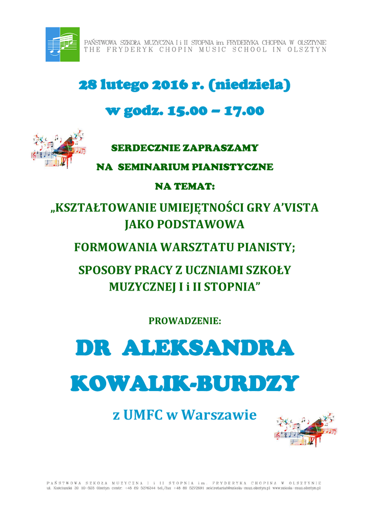 28 lutego 2016 r. (niedziela) w godz. 15.00 – 17.00 SERDECZNIE ZAPRASZAMY NA SEMINARIUM PIANISTYCZNE NA TEMAT: „KSZTAŁTOWANIE UMIEJĘTNOŚCI GRY A’VISTA JAKO PODSTAWOWA FORMOWANIA WARSZTATU PIANISTY; SPOSOBY PRACY Z UCZNIAMI SZKOŁY MUZYCZNEJ I i II STOPNIA” PROWADZENIE: DR ALEKSANDRA KOWALIK-BURDZY z UMFC w Warszawie