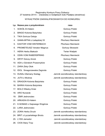 Regionalny Konkurs Pracy Dzikarzy 27 kwietnia 2014 r. (niedziela) w Gołąbkach koło Pasłęka (strzelnica) WYKAZ PSÓW ZAKWALIFIKOWANYCH DO KONKURSU Lp. Nazwa psa z przydomkiem rasa 1. SOKÓŁ El-Halem Gończy Polski 2. BINGO Kolonia Bażyńska Gończy Polski 3. TIKA Gończa Ostoja Gończy Polski 4. GAMA-BITNA z Łabędziej 33 Płochacz Niemiecki 5. KASTOR VOM HINTERBACH Płochacz Niemiecki 6. PROMETEUSZ Venator Magnus 7. HERA Herbu Białozór 8. ODIN VOM RABERSPRING Gończy Słowacki Terier Walijski Płochacz Niemiecki 9. DRYF Dziczy Amok Gończy Polski 10. ADA z Górskich Przesmyków Gończy Polski 11. ZARA Złoty Otok Gończy Polski 12. IDOL Smagorzewska Zagroda Gończy Polski 13. DUNAJ Złamany Szeląg Jamnik szorstkowłosy standardowy 14. JUTA z Modrza Jamnik szorstkowłosy standardowy 15. DRAGON Kolonia Bażyńska Gończy Polski 16. BARKA Kolonia Bażyńska Gończy Polski 17. BOLO Władcy Kniei Gończy Polski 18. ARO Nunarak Gończy Polski 19. ZBIR Jednorożec Gończy Polski 20. ARKADIA El-Halem Gończy Polski 21. K.NOMAD z Gajowego Wzgórza Gończy Polski 22. LARA Jednorożec Gończy Polski 23. ZORA Herbu Druck Jamnik szorstkowłosy standardowy 24. BRIT z Łyczańskiego Brodu Jamnik szorstkowłosy standardowy 25. LYSS Jamador Jamnik szorstkowłosy standartowy 26. CIOS Stary Trop Jamnik szorstkowłosy standartowy 27. BUKI z Wejherowskiej Bukowiny Jamnik szorstkowłosy standartowy 28. BROK Skierbieszowskie Łąki Gończy Słowacki 29. FART z Lutomia Gończy Słowacki 30. BUCHTO z Klanu Ginesa Gończy Słowacki Program Konkursu: W czasie rejestracji psów i przeglądu weterynaryjnego należy posiadać: - oryginały rodowodu psów przystępujących do konkursu, - aktualne świadectwo szczepienia psów przeciwko wściekliźnie, - dowód uiszczenia opłaty za udział w konkursie, - ważną legitymację członkowską ZKwPl lub dowód opłacenia składki członkowskiej za 2014 rok, - w przypadku członków PZŁ korzystających z opłaty za Konkurs w wysokości 50 zł -ważną legitymację członkowską PZŁ W przypadku wycofania psa z Konkursu po 23 kwietnia 2014 r. wniesione opłaty nie będą zwracane . Opłata nie zostanie również zwrócona właścicielowi psa, który nie zostanie dopuszczony do Konkursu z powodu niedopełnienia obowiązków wynikających z Regulaminu Prób i Konkursów Pracy Psów Myśliwskich oraz Niniejszej informacji. Konkurs zostanie przeprowadzony na świniodzikach Poniżej mapka dojazdu do miejscowości Gołąbki