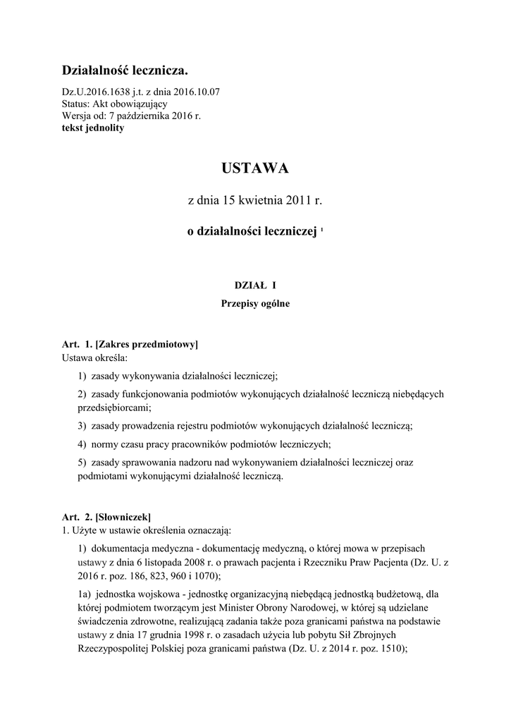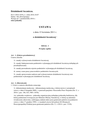 Działalność lecznicza. Dz.U.2016.1638 j.t. z dnia 2016.10.07 Status: Akt obowiązujący Wersja od: 7 października 2016 r. tekst jednolity USTAWA z dnia 15 kwietnia 2011 r. o działalności leczniczej 1 DZIAŁ I Przepisy ogólne Art. 1. [Zakres przedmiotowy] Ustawa określa: 1) zasady wykonywania działalności leczniczej; 2) zasady funkcjonowania podmiotów wykonujących działalność leczniczą niebędących przedsiębiorcami; 3) zasady prowadzenia rejestru podmiotów wykonujących działalność leczniczą; 4) normy czasu pracy pracowników podmiotów leczniczych; 5) zasady sprawowania nadzoru nad wykonywaniem działalności leczniczej oraz podmiotami wykonującymi działalność leczniczą. Art. 2. [Słowniczek] 1. Użyte w ustawie określenia oznaczają: 1) dokumentacja medyczna - dokumentację medyczną, o której mowa w przepisach ustawy z dnia 6 listopada 2008 r. o prawach pacjenta i Rzeczniku Praw Pacjenta (Dz. U. z 2016 r. poz. 186, 823, 960 i 1070); 1a) jednostka wojskowa - jednostkę organizacyjną niebędącą jednostką budżetową, dla której podmiotem tworzącym jest Minister Obrony Narodowej, w której są udzielane świadczenia zdrowotne, realizującą zadania także poza granicami państwa na podstawie ustawy z dnia 17 grudnia 1998 r. o zasadach użycia lub pobytu Sił Zbrojnych Rzeczypospolitej Polskiej poza granicami państwa (Dz. U. z 2014 r. poz. 1510); 2) osoba wykonująca zawód medyczny - osobę uprawnioną na podstawie odrębnych przepisów do udzielania świadczeń zdrowotnych oraz osobę legitymującą się nabyciem fachowych kwalifikacji do udzielania świadczeń zdrowotnych w określonym zakresie lub w określonej dziedzinie medycyny; 3) pacjent - pacjenta w rozumieniu ustawy z dnia 6 listopada 2008 r. o prawach pacjenta i Rzeczniku Praw Pacjenta; 4) podmiot leczniczy niebędący przedsiębiorcą - podmiot leczniczy wymieniony w art. 4 ust. 1 pkt 2, 3 i 7; 5) podmiot wykonujący działalność leczniczą - podmiot leczniczy, o którym mowa w art. 4, oraz lekarza lub pielęgniarkę wykonujących zawód w ramach działalności leczniczej jako praktykę zawodową, o której mowa w art. 5; 6) podmiot tworzący - podmiot albo organ, który utworzył podmiot leczniczy w formie samodzielnego publicznego zakładu opieki zdrowotnej, jednostki budżetowej albo jednostki wojskowej; 7) promocja zdrowia - działania umożliwiające poszczególnym osobom i społeczności zwiększenie kontroli nad czynnikami warunkującymi stan zdrowia i przez to jego poprawę, promowanie zdrowego stylu życia oraz środowiskowych i indywidualnych czynników sprzyjających zdrowiu; 8) (uchylony); 9) szpital - zakład leczniczy, w którym podmiot leczniczy wykonuje działalność leczniczą w rodzaju świadczenia szpitalne; 10) świadczenie zdrowotne - działania służące zachowaniu, ratowaniu, przywracaniu lub poprawie zdrowia oraz inne działania medyczne wynikające z procesu leczenia lub przepisów odrębnych regulujących zasady ich wykonywania; 11) świadczenie szpitalne - wykonywane całą dobę kompleksowe świadczenia zdrowotne polegające na diagnozowaniu, leczeniu, pielęgnacji i rehabilitacji, które nie mogą być realizowane w ramach innych stacjonarnych i całodobowych świadczeń zdrowotnych lub ambulatoryjnych świadczeń zdrowotnych; świadczeniami szpitalnymi są także świadczenia udzielane z zamiarem zakończenia ich udzielania w okresie nieprzekraczającym 24 godzin; 12) stacjonarne i całodobowe świadczenie zdrowotne inne niż świadczenie szpitalne świadczenia opiekuńcze, pielęgnacyjne, paliatywne, hospicyjne, świadczenia z zakresu opieki długoterminowej, rehabilitacji leczniczej, leczenia uzależnień, psychiatrycznej opieki zdrowotnej oraz lecznictwa uzdrowiskowego, udzielane pacjentom, których stan zdrowia wymaga udzielania całodobowych lub całodziennych świadczeń zdrowotnych w odpowiednio urządzonych, stałych pomieszczeniach; 13) uczelnia medyczna - publiczną uczelnię medyczną albo publiczną uczelnię prowadzącą działalność dydaktyczną i badawczą w dziedzinie nauk medycznych oraz Centrum Medyczne Kształcenia Podyplomowego; 14) zakład leczniczy - zespół składników majątkowych, za pomocą którego podmiot leczniczy wykonuje określony rodzaj działalności leczniczej. 2. Ilekroć w ustawie jest mowa o: 1) kierowniku bez bliższego określenia - rozumie się przez to także zarząd spółki kapitałowej, a w przypadku innych podmiotów wykonujących działalność leczniczą osobę uprawnioną do kierowania tymi podmiotami i ich reprezentowania na zewnątrz, jeżeli przepisy ustawy nie stanowią inaczej; 2) działalności leczniczej w rodzaju stacjonarne i całodobowe świadczenia zdrowotne bez bliższego określenia - rozumie się przez to działalność leczniczą w rodzaju świadczenia szpitalne, jak i działalność leczniczą w rodzaju stacjonarne i całodobowe świadczenia zdrowotne inne niż szpitalne; 3) pielęgniarce - rozumie się przez to także położną; 4) lekarzu - rozumie się przez to także lekarza dentystę. 3. Zakład leczniczy jest jednostką lokalną w rozumieniu art. 42 ust. 4 ustawy z dnia 29 czerwca 1995 r. o statystyce publicznej (Dz. U. z 2016 r. poz. 1068), dla której nie sporządza się odrębnego bilansu, chyba że podmiot leczniczy postanowi inaczej w regulaminie organizacyjnym, o którym mowa w art. 24. Art. 3. [Zakres pojęcia"działalaność lecznicza"] 1. Działalność lecznicza polega na udzielaniu świadczeń zdrowotnych. Świadczenia te mogą być udzielane za pośrednictwem systemów teleinformatycznych lub systemów łączności. 2. Działalność lecznicza może również polegać na: 1) promocji zdrowia lub 2) realizacji zadań dydaktycznych i badawczych w powiązaniu z udzielaniem świadczeń zdrowotnych i promocją zdrowia, w tym wdrażaniem nowych technologii medycznych oraz metod leczenia. 2a. Czynności, o których mowa w ust. 2, mogą być wykonywane za pośrednictwem systemó