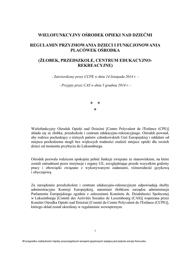 WIELOFUNKCYJNY OŚRODEK OPIEKI NAD DZIEĆMI REGULAMIN PRZYJMOWANIA DZIECI I FUNKCJONOWANIA PLACÓWEK OŚRODKA (ŻŁOBEK, PRZEDSZKOLE, CENTRUM EDUKACYJNOREKREACYJNE) - Zatwierdzony przez CCPE w dniu 14 listopada 2014 r. - Przyjęty przez CAS w dniu 5 grudnia 2014 r. - * * * Wielofunkcyjny Ośrodek Opieki nad Dziećmi [Centre Polyvalent de l'Enfance (CPE)] składa się ze żłobka, przedszkola i centrum edukacyjno-rekreacyjnego. Ośrodek powstał, aby rodzice pochodzący z różnych państw członkowskich Unii Europejskiej i oddaleni od miejsca pochodzenia mogli bez większych trudności znaleźć miejsce opieki dla swoich dzieci od momentu przybycia do Luksemburga. Ośrodek pozwala rodzicom spokojnie pełnić funkcje związane ze stanowiskiem, na które zostali zatrudnieni przez instytucje i organy UE, uwzględniając przede wszystkim godziny pracy i obowiązki związane z wykonywanymi zadaniami, różnorodność językową i obyczajową. Za zarządzanie przedszkolem i centrum edukacyjno-rekreacyjnym odpowiadają służby administracyjne Komisji Europejskiej, natomiast żłobkiem zarządza administracja Parlamentu Europejskiego zgodnie z zaleceniami Komitetu ds. Działalności Społecznej w Luksemburgu [Comité des Activités Sociales de Luxembourg (CAS)] wspierana przez Komitet Ośrodka Opieki nad Dziećmi [Comité du Centre Polyvalent de l'Enfance (CCPE)], którego skład został określony w regulaminie wewnętrznym. 1 W przypadku rozbieżności między poszczególnymi wersjami językowymi wiążąca jest jedynie wersja francuska. ARTYKUŁ 1 Rola żłobka, przedszkola i centrum edukacyjno-rekreacyjnego 1.1. Żłobek Zadanie żłobka polega na zaspokojeniu podstawowych potrzeb dziecka (podstawowa opieka: wyżywienie, higiena i odpoczynek) i zapewnieniu jego bezpieczeństwa emocjonalnego przy zachowaniu ciągłości relacji między dorosłym a dzieckiem. Opracowany został projekt pedagogiczny, który jest udostępniany rodzicom. 1.2. Przedszkole i centrum edukacyjno-rekreacyjne Przedszkole i centrum edukacyjno-rekreacyjne są miejscami opieki, rozbudzania zainteresowań i samodzielności, zabawy oraz rozwoju dziecka w środowisku wielokulturowym i wielojęzycznym. Dziecko uczy się tam życia w grupie w serdecznej i przyjaznej atmosferze. Z wyjątkiem piątku, który jest dniem zarezerwowanym na zajęcia rekreacyjne, pracownicy centrum edukacyjno-rekreacyjnego czuwają, aby dzieci odrabiały lekcje zadawane przez szkołę europejską i wpisane do dzienniczka używanego w tym celu, lecz ich nie sprawdzają. 1.3. W interesie dziecka i dobrego funkcjonowania żłobka, przedszkola i centrum edukacyjnorekreacyjnego (zwanych placówkami, jeżeli są wymieniane w sposób ogólny) rodzice i pracownicy nadzorujący dzieci pozostają w regularnym kontakcie. ARTYKUŁ 2 Przyjmowanie dzieci 2.1. Beneficjenci Wymienione trzy placówki są zarezerwowane dla dzieci urzędników i pracowników instytucji i organów europejskich w Luksemburgu, które są członkami CAS i partycypują w ogólnych kosztach zarządzania daną placówką. Beneficjentami mogą być również dzieci kadry pedagogicznej CPE zatrudnionej przez instytucje i szkoły europejskie. Jeżeli chodzi o partycypację w kosztach, wspomniany personel szkół europejskich, przedszkola i centrum edukacyjno-rekreacyjnego jest traktowany jak personel Komisji Europejskiej. 2 W przypadku rozbieżności między poszczególnymi wersjami językowymi wiążąca jest jedynie wersja francuska. W przypadku gdy wszystkie wnioski osób, których dotyczy poprzedni akapit, zostaną rozpatrzone pozytywnie, istnieje możliwość rozpatrzenia innych wniosków o przyjęcie dzieci, złożonych przez pracowników bezpośrednio związanych z instytucjami, szczególnie beneficjentów umów zawartych na mocy prawa prywatnego, oddelegowanych ekspertów krajowych, stażystów i specjalnych doradców. Jeżeli chodzi o przedszkole i centrum edukacyjno-rekreacyjne, dzieci są zapisywane na cały rok szkolny z wyjątkiem sytuacji przyjęcia dzieci na pobyt warunkowy (por. art. 3.4 i art. 4.4). Przed przewidywaną datą oddania dziecka do przedszkola lub centrum edukacyjnorekreacyjnego pracownicy pracujący na podstawie umowy podlegającej warunkom zatrudnienia innych pracowników Wspólnot lub regulowanej prawem prywatnym, powinni okazać umowę zawartą na czas co najmniej jednego roku lub umowę na czas nieokreślony. 2.2. Wiek Zasadniczo do żłobka są przyjmowane dzieci od 3 miesiąca do 42 miesiąca życia. Do przedszkola mogą zostać przyjęte dzieci od 3 roku życia, pod warunkiem że umieją korzystać z toalety i są w stanie wyraźnie się wypowiadać. Przejście ze żłobka do przedszkola następuje we wrześniu, w styczniu i po świętach wielkanocnych. Żadne dziecko uczęszczające do żłobka nie może zostać przyjęte do przedszkola podczas wakacji letnich. Do centrum edukacyjno-rekreacyjnego są przyjmowane dzieci w wieku szkolnym, które nie skończyły 14 lat w momencie rozpoczęcia roku szkolnego. 2.3. Przydzielanie dzieci W przypadku żłobków, jeśli liczba wniosków przekracza liczbę dostępnych miejsc, przyznanie miejsca będzie odbywało się zgodnie z poniższymi kryteriami: miejsce zamieszkania rodziców zgodnie z podziałem geograficznym ustalonym przez szkoły europejskie, umieszczenie rodzeństwa w tym samym żłobku. W przypadku dostępności miejsc rodzice mogą wyrazić swoje preferencje odnośnie do wyboru żłobka, do którego chcieliby zapisać dziecko. Przyznanie miejsca w przedszkolu i w centrum edukacyjno-rekreacyjnym (zarówno w Bertrange/ Mamer, jak i na na Kirchbergu) odbywa się zgodnie z polityką zapisów określoną przez szkoły europejskie w Luksemburgu. Dzieci uczęszczające do szkoły są przydzielane automatycznie do przedszkola lub centrum edukacyjno-rekreacyjnego w miejscu, gdzie znajduje się ich szkoła. Dzieci nieuczęszczające do szkoły są przydzielane 3 W przypadku rozbieżności między poszczególnymi we