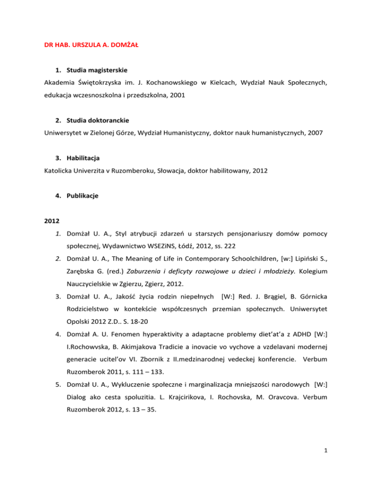 DR HAB. URSZULA A. DOMŻAŁ 1. Studia magisterskie Akademia Świętokrzyska im. J. Kochanowskiego w Kielcach, Wydział Nauk Społecznych, edukacja wczesnoszkolna i przedszkolna, 2001 2. Studia doktoranckie Uniwersytet w Zielonej Górze, Wydział Humanistyczny, doktor nauk humanistycznych, 2007 3. Habilitacja Katolicka Univerzita v Ruzomberoku, Słowacja, doktor habilitowany, 2012 4. Publikacje 2012 1. Domżał U. A., Styl atrybucji zdarzeń u starszych pensjonariuszy domów pomocy społecznej, Wydawnictwo WSEZiNS, Łódź, 2012, ss. 222 2. Domżał U. A., The Meaning of Life in Contemporary Schoolchildren, [w:] Lipiński S., Zarębska G. (red.) Zaburzenia i deficyty rozwojowe u dzieci i młodzieży. Kolegium Nauczycielskie w Zgierzu, Zgierz, 2012. 3. Domżał U. A., Jakość życia rodzin niepełnych [W:] Red. J. Brągiel, B. Górnicka Rodzicielstwo w kontekście współczesnych przemian społecznych. Uniwersytet Opolski 2012 Z.D.. S. 18-20 4. Domżał A. U. Fenomen hyperaktivity a adaptacne problemy diet’at’a z ADHD [W:] I.Rochowvska, B. Akimjakova Tradicie a inovacie vo vychove a vzdelavani modernej generacie ucitel’ov VI. Zbornik z II.medzinarodnej vedeckej konferencie. Verbum Ruzomberok 2011, s. 111 – 133. 5. Domżał U. A., Wykluczenie społeczne i marginalizacja mniejszości narodowych [W:] Dialog ako cesta spoluzitia. L. Krajcirikova, I. Rochovska, M. Oravcova. Verbum Ruzomberok 2012, s. 13 – 35. 1 6. Domżał Z., Starość jako zjawisko bilogiczne i społeczne. [W:] Studia Scientifica Facultatis Paedagogicae. Cislo1, 2011, rocnik X. Universitats Catholica Rosenbergae. S. 117 - 136 7. Domżał Z., Uwarunkowania środowiskowe agresji wśród młodzieży. [W:] Studia Scientifica Facultatis Paedagogicae. Cislo 5, 2011, rocnik X. Universitats Catholica Rosenbergae. S. 9 – 22. 2011 8. Domżał Z., Domżał U. A., (red.) Nowe aspekty pracy socjalnej, Nouveaux aspects dans le travail social, Nove aspekty v socjalnej praci, Wydawnictwo WSEZiNS, Łódź, 2010, ss.264 – wydane w 2011 9. Domżał U. A., Jakość życia starszych pensjonariuszy wybranych domów dziennego pobytu w Łodzi, Wydawnictwo WSEZiNS, Łódź, 2010 (wydane III/2011), ss. 104 10. Domżał, U. A., Domżał Z., Korzenie edukacji i wychowania, [w:] Przegląd Powszechny, Wydawnictwo RHETOS, Warszawa, nr 9 (1081), IX/2011, s. 23 – 31 11. Domżał U. A., Inspiracje baumanowskie dla myślenia o kulturze w pedagogice, [w:] Jaworska-Witkowska M., Witkowski L., (red.) Przeszkody dla rozwoju humanistyki w szkołach wyższych (z pedagogika w tle). W perspektywie troski o uniwersytet, kulturę humanistyczną i podręczniki, Wydawnictwo Adam Marszałek, Toruń, 2011 12. Domżał U. A., Fenomen hyperaktivity a adaptaćne problemy diet’at’a z ADHD [w:] Tradicie a inovacie vo vychove a vzdelavani modernej generacie ucitelov VI. Zbornik z II. medzinarodnej vedeckej konferencie, Ruźomberok, 2011, s. 111 – 132 2010 2 13. Domżał, U.: Logoteoria i logoterapia Viktora Frankla. [W.] New trends in Humanities and Science in the Eastern European Region, Academy of Professional Development and Re-Training of Educators, Moscow, 2010, s. 147-152, ISBN 978-5-8429-9617-9. 14. Domżał, U.: Jakość życia starszych pensjonariuszy wybranych Domów Dziennego Pobytu w Łodzi. WSEZ, Łódź, 2010, ss. 115, ISBN 978-83-61095-42-2. 15. Jaworska-Witkowska M., Domżał U. A.,(red. nauk.): Dzieci i inicjacja uniwersytecka – integralna próba akademicka.WSEZiNS/Impuls, Łódź, 2010, ss. 404, ISBN 978-8361095-34-7 16. Domżał, U.: Opieka nad dziećmi w Polsce w latach 1918-1939 w kontekście międzynarodowej współpracy. [W.] Wychowanie, opieka, edukacja w perspektywie historycznej i współcześnie. WSEZ, Łódź, 2010, s. 247-256, ISBN 978-83-61095-26-2. 17. Domżał, U.: Funkcje i cele działalności opiekuńczej w dwudziestoleciu międzywojennym. [W.] Opieka i edukacja – perspektywa historyczna i współczesne problemy. WSEZ, Łódź, 2010, s. 11-23, ISBN 978-83-61095-24-8. 18. Domżał, U.: Recenzja: Brejnak W., Woźniak W.,Pomoc psychologiczno-pedagogiczna wybrane zagadnienia, WSEZ, Łódź, ISBN 978-83-61095-20-0. 2009 19. Domżał, U.: Międzynarodowa współpraca w zakresie opieki nad dzieckiem (19181939) na podstawie publicystyki w II RP. [W.] In Gremium, tom 3, Oficyna Wydawnicza Uniwersytetu Zielonogórskiego, 2009, s. 111-118, ISBN 978-83-7481307-5. 20. Domżał, U.: Opieka państwa i organizacji pozarządowych nad dzieckiem w latach 1919 – 1939. WSEZ, Łódź, 2009, ss. 119, ISBN 978-83-61095-29-3. 3 21. Domżał, U.: Wybory moralne nauczycieli. [W.] Edukacja Zdrowotna, Półrocznik Naukowy Wyższej Szkoły Edukacji Zdrowotnej w Łodzi, WSEZ, Łódź Vol. 6 nr. 1 / 2009 s. 75-82, ISSN 1733-6155. 22. Lipiński, S., Domżał, U.: The Three Concepts of Neurosis As a Challenge for Modern Pedagogy. [W.]THE TEACHER – THE STUDENT – COMMON EDUCATIONAL AREA part 1, Academy of Professional Development and Re-Training of Educators Moscow Russia, 2009, s. 56-63, ISBN 978-5-8429-0423-5. 23. Domżał, U.: Legislation and Rehabilitation in some 20-centuries until 1939. [W.] HISTORICAL AND CONTEMPORARY CONTEXT OF PEDAGOGY AND REHABILITATION part 2, Academy of Professional Development and Re-Training of Educators Moscow Russia, 2009, s. 154-159, ISBN 978-5-8429-0515-7. 24. THE TEACHER – THE STUDENT – COMMON EDUCATIONAL AREA. /editor Domżał, U./. Academy of Professional Development and Re-Training of Educators Moscow Russia, 2009, s. 173, ISBN 978-5-8429-0423-5 25. Domżał, U.: Stanisław Lipiński, Metodyka wychowania resocjalizującego w placówkach zamkniętych (Reviews). HISTORICAL AND CONTEMPORARY CONTEXT OF PEDAGOGY AND REHABILITATION part 2, Academy of Professional Development and Re-Training of Educators Moscow Russia, 2009, s. 186. 26. Domżał, U.: Recenzja: Lipiński, S.: Metodyka wychowania resocjalizującego w placówkach zamkniętych. WSEZ, Łódź, 2009, ss. 61, ISBN 78-83-16095-01-07. 2008 27. Domżał, U.