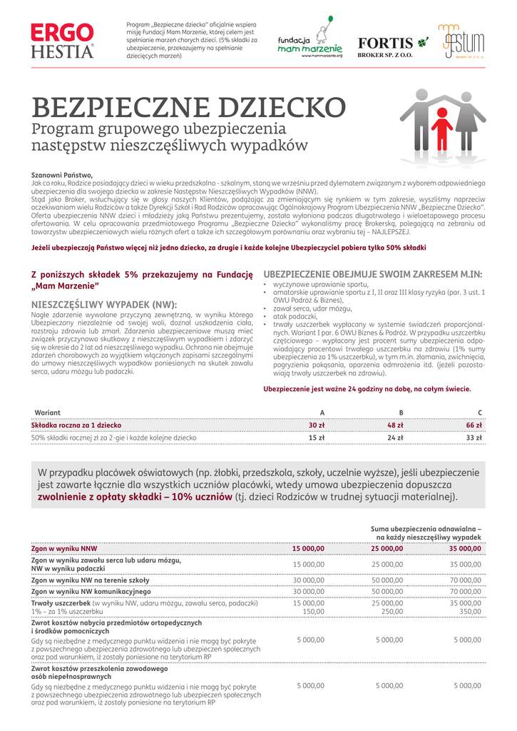 Program „Bezpieczne dziecko” oficjalnie wspiera misję Fundacji Mam Marzenie, której celem jest spełnianie marzeń chorych dzieci. (5% składki za ubezpieczenie, przekazujemy na spełnianie dziecięcych marzeń) BEZPIECZNE DZIECKO Program grupowego ubezpieczenia następstw nieszczęśliwych wypadków Szanowni Państwo, Jak co roku, Rodzice posiadający dzieci w wieku przedszkolno - szkolnym, staną we wrześniu przed dylematem związanym z wyborem odpowiedniego ubezpieczenia dla swojego dziecka w zakresie Następstw Nieszczęśliwych Wypadków (NNW). Stąd jako Broker, wsłuchujący się w głosy naszych Klientów, podążając za zmieniającym się rynkiem w tym zakresie, wyszliśmy naprzeciw oczekiwaniom wielu Rodziców a także Dyrekcji Szkół i Rad Rodziców opracowując Ogólnokrajowy Program Ubezpieczenia NNW „Bezpieczne Dziecko”. Oferta ubezpieczenia NNW dzieci i młodzieży jaką Państwu prezentujemy, została wyłoniona podczas długotrwałego i wieloetapowego procesu ofertowania. W celu opracowania przedmiotowego Programu „Bezpieczne Dziecko” wykonaliśmy pracę Brokerską, polegającą na zebraniu od towarzystw ubezpieczeniowych wielu różnych ofert a także ich szczegółowym porównaniu oraz wybraniu tej – NAJLEPSZEJ. Jeżeli ubezpieczają Państwo więcej niż jedno dziecko, za drugie i każde kolejne Ubezpieczyciel pobiera tylko 50% składki Z poniższych składek 5% przekazujemy na Fundację „Mam Marzenie” NIESZCZĘŚLIWY WYPADEK (NW): Nagłe zdarzenie wywołane przyczyną zewnętrzną, w wyniku którego Ubezpieczony niezależnie od swojej woli, doznał uszkodzenia ciała, rozstroju zdrowia lub zmarł. Zdarzenia ubezpieczeniowe muszą mieć związek przyczynowo skutkowy z nieszczęśliwym wypadkiem i zdarzyć się w okresie do 2 lat od nieszczęśliwego wypadku. Ochrona nie obejmuje zdarzeń chorobowych za wyjątkiem włączonych zapisami szczególnymi do umowy nieszczęśliwych wypadków poniesionych na skutek zawału serca, udaru mózgu lub padaczki. UBEZPIECZENIE OBEJMUJE SWOIM ZAKRESEM M.IN: • wyczynowe uprawianie sportu, • amatorskie uprawianie sportu z I, II oraz III klasy ryzyka (par. 3 ust. 1 OWU Podróż & Biznes), • zawał serca, udar mózgu, • atak padaczki, • trwały uszczerbek wypłacany w systemie świadczeń proporcjonalnych. Wariant I par. 6 OWU Biznes & Podróż. W przypadku uszczerbku częściowego – wypłacany jest procent sumy ubezpieczenia odpowiadający procentowi trwałego uszczerbku na zdrowiu (1% sumy ubezpieczenia za 1% uszczerbku), w tym m.in. złamania, zwichnięcia, pogryzienia pokąsania, oparzenia odmrożenia itd. (jeżeli pozostawiają trwały uszczerbek na zdrowiu). Ubezpieczenie jest ważne 24 godziny na dobę, na całym świecie. Wariant A B C Składka roczna za 1 dziecko 30 zł 48 zł 66 zł 50% składki rocznej zł za 2-gie i każde kolejne dziecko 15 zł 24 zł 33 zł W przypadku placówek oświatowych (np. żłobki, przedszkola, szkoły, uczelnie wyższe), jeśli ubezpieczenie jest zawarte łącznie dla wszystkich uczniów placówki, wtedy umowa ubezpieczenia dopuszcza zwolnienie z opłaty składki – 10% uczniów (tj. dzieci Rodziców w trudnej sytuacji materialnej). Suma ubezpieczenia odnawialna – na każdy nieszczęśliwy wypadek Zgon w wyniku NNW 15 000,00 25 000,00 35 000,00 Zgon w wyniku zawału serca lub udaru mózgu, NW w wyniku padaczki 15 000,00 25 000,00 35 000,00 Zgon w wyniku NW na terenie szkoły 30 000,00 50 000,00 70 000,00 Zgon w wyniku NW komunikacyjnego 30 000,00 50 000,00 70 000,00 Trwały uszczerbek (w wyniku NW, udaru mózgu, zawału serca, padaczki) 1% – za 1% uszczerbku 15 000,00 150,00 25 000,00 250,00 35 000,00 350,00 Zwrot kosztów nabycia przedmiotów ortopedycznych i środków pomocniczych Gdy są niezbędne z medycznego punktu widzenia i nie mogą być pokryte z powszechnego ubezpieczenia zdrowotnego lub ubezpieczeń społecznych oraz pod warunkiem, iż zostały poniesione na terytorium RP 5 000,00 5 000,00 5 000,00 Zwrot kosztów przeszkolenia zawodowego osób niepełnosprawnych Gdy są niezbędne z medycznego punktu widzenia i nie mogą być pokryte z powszechnego ubezpieczenia zdrowotnego lub ubezpieczeń społecznych oraz pod warunkiem, iż zostały poniesione na terytorium RP 5 000,00 5 000,00 5 000,00 Program „Bezpieczne dziecko” oficjalnie wspiera misję Fundacji Mam Marzenie, której celem jest spełnianie marzeń chorych dzieci. (5% składki za ubezpieczenie, przekazujemy na spełnianie dziecięcych marzeń) Dieta szpitalna – za dzień pobytu w szpitalu po NW Pobyt nim. 72 h, max. 90 dni. Nie obejmuje pobytu w sanatoriach, uzdrowiskach, ośrodkach rehabilitacyjnych, domach opieki i hospicjach 50,00 50,00 75,00 Zwrot kosztów leczenia Poniesione na terytorium RP, do 2 lat po NW 2 000,00 2 000,00 3 000,00 Zwrot kosztów rehabilitacji Poniesione na terytorium RP, do 2 lat po NW 2 000,00 2 000,00 3 000,00 75,00 125,00 175,00 2 000,00 200 zł na ząb 2 000,00 200 zł na ząb 2 000,00 200 zł na ząb Jednorazowe świadczenie w przypadku jeżeli NW nie pozostawił trwałego uszczerbku na zdrowiu (leczenie uciążliwe) Jeżeli leczenie wiązało się z koniecznością przeprowadzenia operacji lub hospitalizacji powyżej 5 dni. Wypłacane 1 raz. Odbudowa stomatologiczna zębów Nie obejmuje kosztów zakupu implantów i implantacji ASSISTANCE NA TERENIE RP jeżeli Ubezpieczony uległ nieszczęśliwemu wypadkowi, który jest objęty ochroną ubezpieczeniową • wizyta lekarza Ubezpieczyciel zorganizuje oraz pokryje koszty dojazdu lekarza oraz honorarium za wizytę w miejscu pobytu Ubezpieczonego lub pokryje koszty wizyty lekarskiej w placówce medycznej – do wysokości 500 PLN łącznych kosztów w odniesieniu do jednego nieszczęśliwego wypadku, • wizyta pielęgniarki – Ubezpieczyciel zorganizuje oraz pokryje koszty dojazdu pielęgniarki oraz honorarium za wizytę w miejscu pobytu Ubezpieczonego – do wysokości 500 PLN łącznych kosztów w odniesien