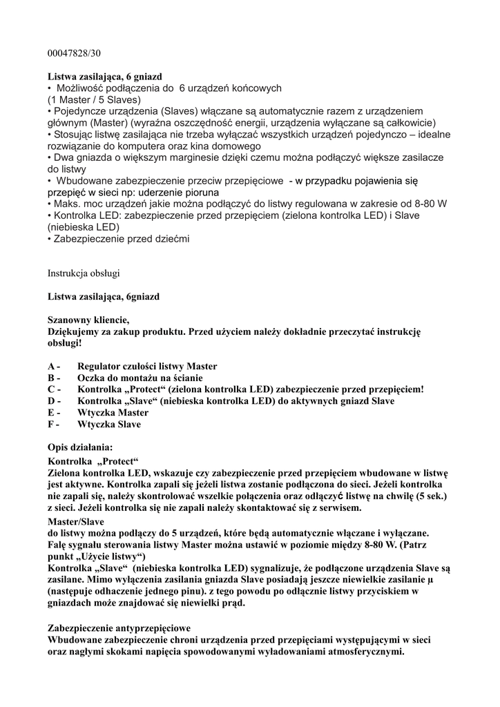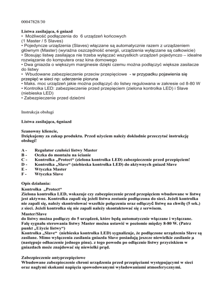 00047828/30 Listwa zasilająca, 6 gniazd • MoŜliwość podłączenia do 6 urządzeń końcowych (1 Master / 5 Slaves) • Pojedyncze urządzenia (Slaves) włączane są automatycznie razem z urządzeniem głównym (Master) (wyraźna oszczędność energii, urządzenia wyłączane są całkowicie) • Stosując listwę zasilająca nie trzeba wyłączać wszystkich urządzeń pojedynczo – idealne rozwiązanie do komputera oraz kina domowego • Dwa gniazda o większym marginesie dzięki czemu moŜna podłączyć większe zasilacze do listwy • Wbudowane zabezpieczenie przeciw przepięciowe - w przypadku pojawienia się przepięć w sieci np: uderzenie pioruna • Maks. moc urządzeń jakie moŜna podłączyć do listwy regulowana w zakresie od 8-80 W • Kontrolka LED: zabezpieczenie przed przepięciem (zielona kontrolka LED) i Slave (niebieska LED) • Zabezpieczenie przed dziećmi Instrukcja obsługi Listwa zasilająca, 6gniazd Szanowny kliencie, Dziękujemy za zakup produktu. Przed uŜyciem naleŜy dokładnie przeczytać instrukcję obsługi! ABCDEF- Regulator czułości listwy Master Oczka do montaŜu na ścianie Kontrolka „Protect“ (zielona kontrolka LED) zabezpieczenie przed przepięciem! Kontrolka „Slave“ (niebieska kontrolka LED) do aktywnych gniazd Slave Wtyczka Master Wtyczka Slave Opis działania: Kontrolka „Protect“ Zielona kontrolka LED, wskazuje czy zabezpieczenie przed przepięciem wbudowane w listwę jest aktywne. Kontrolka zapali się jeŜeli listwa zostanie podłączona do sieci. JeŜeli kontrolka nie zapali się, naleŜy skontrolować wszelkie połączenia oraz odłączyć listwę na chwilę (5 sek.) z sieci. JeŜeli kontrolka się nie zapali naleŜy skontaktować się z serwisem. Master/Slave do listwy moŜna podłączy do 5 urządzeń, które będą automatycznie włączane i wyłączane. Falę sygnału sterowania listwy Master moŜna ustawić w poziomie między 8-80 W. (Patrz punkt „UŜycie listwy“) Kontrolka „Slave“ (niebieska kontrolka LED) sygnalizuje, Ŝe podłączone urządzenia Slave są zasilane. Mimo wyłączenia zasilania gniazda Slave posiadają jeszcze niewielkie zasilanie µ (następuje odhaczenie jednego pinu). z tego powodu po odłącznie listwy przyciskiem w gniazdach moŜe znajdować się niewielki prąd. Zabezpieczenie antyprzepięciowe Wbudowane zabezpieczenie chroni urządzenia przed przepięciami występującymi w sieci oraz nagłymi skokami napięcia spowodowanymi wyładowaniami atmosferycznymi. UŜycie listwy Wszystkie urządzenia poboczne naleŜy podłączyć do gniazd Slave oraz włączyć zasilanie urządzenia. Urządzenie główne podłączyć do wtyczki Master (maks. 550 W). Włączając urządzenie główne, zasilane będą równieŜ urządzenia poboczne. JeŜeli tak się nie stanie, oznacza to, Ŝe ustawione napięcie wzbudzające jest zbyt wysokie. Napięcie to moŜna ustawić za pomocą śrubokręta na regulatorze. Regulator przekręcić powoli w lewo, aby zmniejszyć napięcie wzbudzenia. Przekręcając w prawo, zwiększamy napięcie wzbudzenia, wówczas urządzenie będzie potrzebowało go więcej aby włączyć urządzenia. Proszę uwzględnić fakt, Ŝe przy wyłączeniu urządzenia głównego równieŜ urządzenia poboczne zostaną wyłączone. UWAGA! Napraw dokonywać tylko w autoryzowanych serwisach i przez wyszkolony personel! Dane techniczne: Napięcie znamionowe: 230 V/50 Hz/16 A Moc wejściowa maks.: maks. 3600 W Moc wejściowa wejście Master: przynajmniej. 8 W do maks. 550 W Zakres ustawienia Master: 8-80 W/µ-wyłączenie Wymiary : (L x B x H) 26 x 7 x 4 cm Waga: 710 g UWAGA! WaŜne środki ostroŜności! Urządzenie chronić przed dziećmi! Maks. pobór prądu 16 A, a maks. moc 3600 W nie moŜe zostać przekroczona. Proszę uwzględnić informacje na tabliczkach znamionowych podłączanych urządzeń. Listwa moŜe być podłączona do gniazda sieciowego z zabezpieczeniem 16 A. Praca listwy w niekorzystnych warunkach surowo zabroniona. Niekorzystne warunki to: temp. otoczenia około 50°C, występowanie palnych gazów, szkodliwych oparów, miejsca zakurzone, wilgotność powietrza około 80% (mocno wilgotne pomieszczenia). Listwy uŜywać tylko i wyłącznie w suchych pomieszczeniach. JeŜeli listwa została uszkodzona nie naleŜy jej w Ŝaden sposób uŜytkować. Serwis i naprawa: W przypadku dokonywania naprawy, zdejmowania obudowy, itp. elementy elektroniczne pod napięciem mogą wydostać się na zewnątrz. Elementy te mogą być pod napięciem. W przypadku naprawy, konserwacji, wymiany elementu naleŜy odłączyć listwę od sieci. Napraw dokonywać tylko w autoryzowanych, fachowych serwisach. UŜywając listwy w miejscu pracy naleŜy uwzględnić wszelkie przepisy BHP. W szkołach, instytucjach oświaty, warsztatach, itp. naleŜy zachować bezwzględne środki ostroŜności oraz przepisy BHP! W przypadku nie uŜywania listwy naleŜy, wyciągnąć wtyczkę z gniazda!