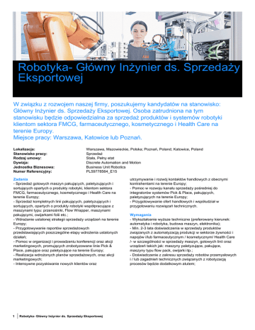 Robotyka- Główny Inżynier ds. Sprzedaży Eksportowej W związku z rozwojem naszej firmy, poszukujemy kandydatów na stanowisko: Główny Inżynier ds. Sprzedaży Eksportowej. Osoba zatrudniona na tym stanowisku będzie odpowiedzialna za sprzedaż produktów i systemów robotyki klientom sektora FMCG, farmaceutycznego, kosmetycznego i Health Care na terenie Europy. Miejsce pracy: Warszawa, Katowice lub Poznań. Lokalizacja: Stanowisko pracy: Rodzaj umowy: Dywizja: Jednostka Biznesowa: Numer Referencyjny: Warszawa, Mazowieckie, Polska; Poznań, Poland; Katowice, Poland Sprzedaż Stała, Pełny etat Discrete Automation and Motion Business Unit Robotics PL59778564_E15 Zadania - Sprzedaż gotowych maszyn pakujących, paletyzujących i sortujących opartych o produkty robotyki, klientom sektora FMCG, farmaceutycznego, kosmetycznego i Health Care na terenie Europy; - Sprzedaż kompletnych linii pakujących, paletyzujących i sortujących, opartych o produkty robotyki współpracujące z maszynami typu: przenośniki, Flow Wrapper, maszynami pakującymi, owijarkami folii etc.; - Wdrażanie ustalonej strategii sprzedaży urządzeń na terenie Europy; - Przygotowywanie raportów sprzedażowych przedstawiających poszczególne etapy wdrożenia ustalonych działań; - Pomoc w organizacji i prowadzeniu konferencji oraz akcji marketingowych, promujących zrobotyzowane linie Pick & Place, pakujące oraz paletyzujące na terenie Europy; - Realizacja wdrożonych planów sprzedażowych, oraz akcji marketingowych; - Intensywne pozyskiwanie nowych klientów oraz 1 Robotyka- Główny Inżynier ds. Sprzedaży Eksportowej utrzymywanie i rozwój kontaktów handlowych z obecnymi kontrahentami na terenie Europy; - Pomoc w rozwoju kanału sprzedaży pośredniej do integratorów systemów Pick & Place, pakujących, paletyzujących na terenie Europy; - Przygotowywanie ofert handlowych i współudział w przygotowaniu rozwiązań technicznych. Wymagania - Wykształcenie wyższe techniczne (preferowany kierunek: automatyka i robotyka, budowa maszyn, elektronika); - Min. 2-3 lata doświadczenia w sprzedaży produktów związanych z automatyzacją produkcji w sektorze żywności i napojów i/lub farmaceutycznym / kosmetycznym/ Health Care /- w szczególności w sprzedaży maszyn, gotowych linii oraz urządzeń takich jak: maszyny paletyzujące, pakujące, maszyny typu flow pack, owijarki itp.; - Doświadczenie z zakresu sprzedaży robotów przemysłowych i / lub zagadnień technicznych związanych z robotyzacją procesów będzie dodatkowym atutem; - Warunek konieczny: bardzo dobra znajomość języka angielskiego pozwalająca na swobodną komunikację w międzynarodowym środowisku; - Znajomość innych języków europejskich będzie dodatkowym atutem; - Prawo jazdy kat.B; - Łatwość w uczeniu się i poznawaniu nowoczesnych technologii i rozwiązań technicznych; - Umiejętności budowania dobrych relacji biznesowych; - Gotowość do częstych podróży służbowych na terenie Europy. Dodatkowe Informacje Oferujemy: - Interesującą pracę w firmie nastawionej na innowacyjne rozwiązania i nowoczesne technologie; - Możliwość rozwoju zawodowego w międzynarodowym środowisku i podnoszenia kwalifikacji zawodowych w różnych obszarach; - Stabilność zatrudnienia w firmie o ugruntowanej pozycji rynkowej; - Atrakcyjne warunki zatrudnienia uzależnione od doświadczenia i posiadanych umiejętności; - Miłą atmosferę pracy. Informacje dodatkowe: Osoby zainteresowane prosimy o przesyłanie CV za pośrednictwem naszej strony internetowej lub wybierając przycisk „Aplikuj” na dole strony. Równocześnie zastrzegamy sobie prawo odpowiedzi wyłącznie na wybrane oferty. Wszystkie oferty powinny zawierać klauzulę: „Wyrażam zgodę na przetwarzanie moich danych osobowych zawartych w ofercie pracy zgodnie z Ustawą z dnia 29 sierpnia 1997 o ochronie danych osobowych (tekst jednolity Dz. U. 2002.101.926. z późn. zm.) dla potrzeb niezbędnych do realizacji procesu rekrutacji”. ABB (www.abb.com) jest liderem w technologiach dla energetyki i automatyki, które pozwalają klientom przemysłowym oraz zakładom użyteczności publicznej zwiększyć swoją efektywność, jednocześnie minimalizując oddziaływanie na środowisko naturalne. Grupa ABB zatrudnia około 135 000 pracowników w blisko 100 krajach świata. Our ambition. Your legacy. 2 Robotyka- Główny Inżynier ds. Sprzedaży Eksportowej