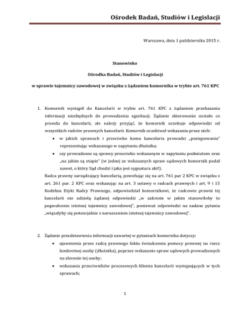 Ośrodek Badań, Studiów i Legislacji Warszawa, dnia 1 października 2015 r. Stanowisko Ośrodka Badań, Studiów i Legislacji w sprawie tajemnicy zawodowej w związku z żądaniem komornika w trybie art. 761 KPC 1. Komornik wystąpił do Kancelarii w trybie art. 761 KPC z żądaniem przekazania informacji niezbędnych do prowadzenia egzekucji. Żądanie skierowanie zostało co prawda do kancelarii, ale należy przyjąć, że komornik oczekuje odpowiedzi od wszystkich radców prawnych kancelarii. Komornik oczekiwał wskazania przez nich: w jakich sprawach i przeciwko komu kancelaria prowadzi „postępowania” reprezentując wskazanego w zapytaniu dłużnika; czy prowadzone są sprawy przeciwko wskazanym w zapytaniu podmiotom oraz „na jakim są etapie” (w jednej ze wskazanych spraw sądowych komornik podał nawet, o który Sąd chodzi i jaka jest sygnatura akt!). Radca prawny zarządzający kancelarią, powołując się na art. 761 par 2 KPC w związku z art. 261 par. 2 KPC oraz wskazując na art. 3 ustawy o radcach prawnych i art. 9 i 15 Kodeksu Etyki Radcy Prawnego, odpowiedział komornikowi, że radcowie prawni tej kancelarii nie udzielą żądanej odpowiedzi „w zakresie w jakim stanowiłoby to pogwałcenie istotnej tajemnicy zawodowej”, ponieważ odpowiedzi na zadane pytania „wiązałyby się potencjalnie z naruszeniem istotnej tajemnicy zawodowej”. 2. Żądanie przedstawienia informacji zawartej w pytaniach komornika dotyczy: ujawnienia przez radcę prawnego faktu świadczenia pomocy prawnej na rzecz konkretnej osoby (dłużnika), poprzez wskazanie spraw sądowych prowadzonych na zlecenie tej osoby; wskazania przeciwników procesowych klienta kancelarii występujących w tych sprawach; 1 Ośrodek Badań, Studiów i Legislacji poinformowania komornika o stanie tych spraw, a więc o przebiegu postępowania (i to nawet w sprawie znanej komornikowi). 3. 1. Problem dochowania zawodowej dyskrecji w sprawach klienta odnosi się w świetle ustawy o ustroju naszego zawodu oraz kodeksu etyki zawodowej do: zachowania w tajemnicy wszystkiego, o czym radca prawny dowiedział się w związku z udzieleniem pomocy prawnej (art. 3 ust.3 tej ustawy) – zaś w ujęciu art. 15 ust. 1 Kodeksu Etyki – zachowania w tajemnicy wszystkich informacji dotyczących klienta i jego spraw, ujawnionych radcy prawnemu przez klienta bądź uzyskanych w inny sposób w związku z wykonywaniem przez niego jakichkolwiek czynności zawodowych, niezależnie od źródła tych informacji oraz formy i sposobu ich utrwalenia; zachowania w tajemnicy wszelkich tworzonych przez radcę prawnego dokumentów oraz jego korespondencji z klientem i osobami uczestniczącymi w prowadzeniu sprawy, o ile powstały one dla celów związanych ze świadczeniem pomocy prawnej; zachowania w tajemnicy samego faktu udzielania klientowi pomocy prawnej. 3.2. Co do obowiązku zachowania w tajemnicy powyższych informacji ujawnionych radcy prawnemu oraz wytworzonych przez niego dokumentów i korespondencji nie ulega wątpliwości, że na gruncie przepisów KPC obowiązek ten ma charakter bezwzględny. Przepis art. 261 § 2 KPC dopuszcza możliwość odmowy przez świadka odpowiedzi na pytanie, jeśliby zeznanie miało być połączone z „pogwałceniem istotnej tajemnicy zawodowej”. Wiąże się z tym również możliwość (a zarazem zawodowa powinność) odmowy przedstawienia sądowi dokumentu (art. 248 KPC). Należy więc przyjąć, że radca prawny w powyższych przypadkach zobowiązany jest przestrzegać tajemnicy w pełnym jej zakresie i nie staje przed koniecznością oceny „istotności” powierzonej mu tajemnicy zawodowej, a sąd cywilny od tego obowiązku zwolnić go nie może. Sąd nie jest uprawniony do własnej oceny tej „istotności”, skoro w przepisach KPC nie wskazano przesłanek i trybu zwalniania z tej tajemnicy. W takiej sytuacji należy dać pierwszeństwo zasadzie ogólnej wynikającej z przepisu art. 3 ust. 5 Ustawy. 2 Ośrodek Badań, Studiów i Legislacji Wystarczy więc, że radca prawny przesłuchiwany w charakterze świadka poda podstawę prawną odmowy odpowiedzi na pytania (tj. Ustawę), na której opiera swą odmowę – bez uzasadniania tego przesłankami faktycznymi. Takie stanowisko zajęła w uchwale KRRP broniąc skutecznie w konkretnej sprawie radcę prawnego pociągniętego przez sąd do odpowiedzialności porządkowej za nieujawnienie okoliczności sprawy. Następnie znalazło to potwierdzenie w orzecznictwie sądowym. 3.3. Powołany w piśmie komornika przepis art. 761 stanowi w par. 2, że od wykonania żądania komornika odnoszącego się do złożenia wyjaśnień i informacji niezbędnych do prowadzenia egzekucji można się uchylić w takim zakresie w jakim według przepisów części pierwszej tego kodeksu można odmówić przedstawienia dokumentu lub złożenia zeznań w charakterze świadka albo odpowiedzi na zadane pytanie. Niewątpliwie odnosi się to do treści art. 261 KPC (dowodu z zeznań świadków) oraz do treści art. 248 par. 2 KPC (dowodu z dokumentu). Wynika z tego, że radca prawny nie może udzielać komornikowi odpowiedzi w zakresie objętym prawnie chronioną tajemnicą zawodową. Niewątpliwie wskazanie przeciwników procesowych klienta stanowiłoby przekazanie „informacji dotyczących klienta i jego spraw” (art. 15 ust. 1 Kodeksu Etyki), a przekazanie informacji o stanie sprawy byłoby ponadto ujawnieniem „tworzonych przez radcę prawnego dokumentów” (art. 15 ust 2 Kodeksu etyki). Ponadto należy wskazać, że w zakresie objętym pytaniami komornik powinien uzyskać informacje z pominięciem „współpracy” radcy prawnego będącego pełnomocnikiem dłużnika. Okoliczność, iż niektóre informacje wchodzące w zakres tajemnicy zawodowej radcy prawnego mogą być dostępne z innych źródeł, nie zwalnia radcy prawnego z obowiązku poufności. Tajemnica radcowska służy bowiem zagwarantowaniu ochrony konstytucyjnych praw podmiotowych związanych z 