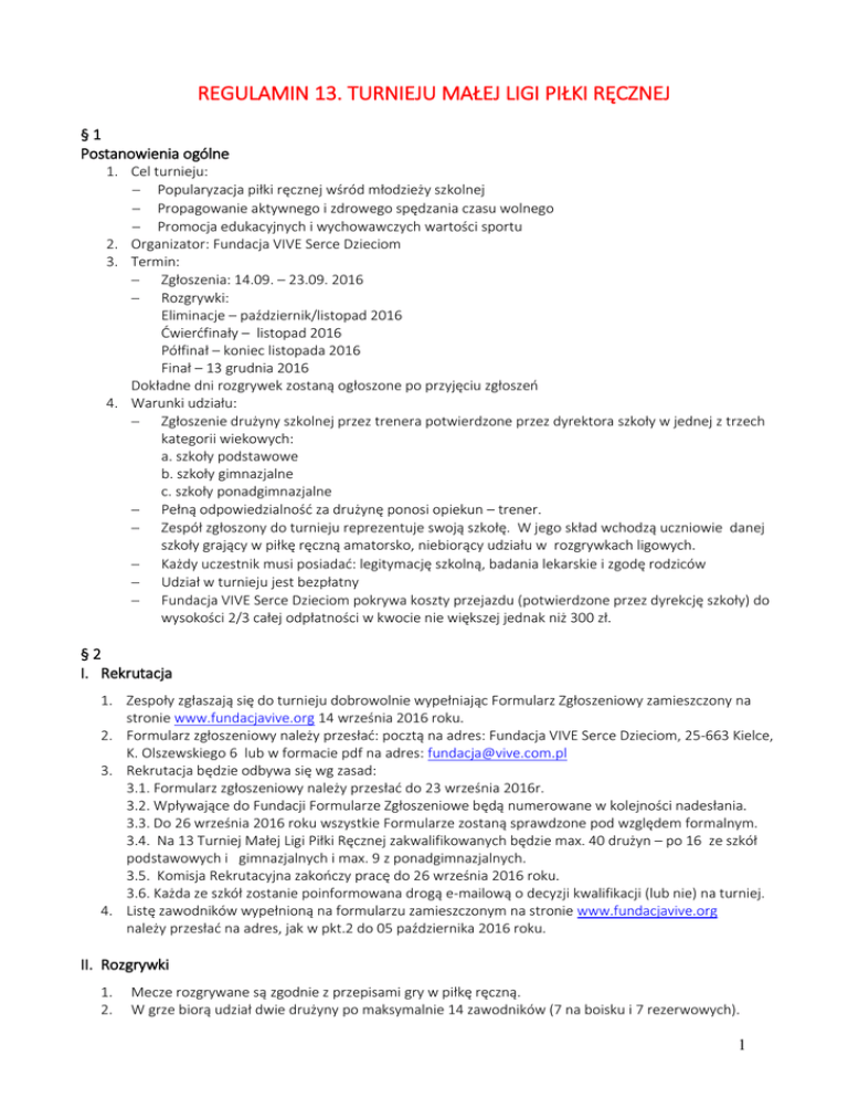 REGULAMIN 13. TURNIEJU MAŁEJ LIGI PIŁKI RĘCZNEJ §1 Postanowienia ogólne 1. Cel turnieju: Popularyzacja piłki ręcznej wśród młodzieży szkolnej Propagowanie aktywnego i zdrowego spędzania czasu wolnego Promocja edukacyjnych i wychowawczych wartości sportu 2. Organizator: Fundacja VIVE Serce Dzieciom 3. Termin: Zgłoszenia: 14.09. – 23.09. 2016 Rozgrywki: Eliminacje – październik/listopad 2016 Ćwierćfinały – listopad 2016 Półfinał – koniec listopada 2016 Finał – 13 grudnia 2016 Dokładne dni rozgrywek zostaną ogłoszone po przyjęciu zgłoszeń 4. Warunki udziału: Zgłoszenie drużyny szkolnej przez trenera potwierdzone przez dyrektora szkoły w jednej z trzech kategorii wiekowych: a. szkoły podstawowe b. szkoły gimnazjalne c. szkoły ponadgimnazjalne Pełną odpowiedzialność za drużynę ponosi opiekun – trener. Zespół zgłoszony do turnieju reprezentuje swoją szkołę. W jego skład wchodzą uczniowie danej szkoły grający w piłkę ręczną amatorsko, niebiorący udziału w rozgrywkach ligowych. Każdy uczestnik musi posiadać: legitymację szkolną, badania lekarskie i zgodę rodziców Udział w turnieju jest bezpłatny Fundacja VIVE Serce Dzieciom pokrywa koszty przejazdu (potwierdzone przez dyrekcję szkoły) do wysokości 2/3 całej odpłatności w kwocie nie większej jednak niż 300 zł. §2 I. Rekrutacja 1. Zespoły zgłaszają się do turnieju dobrowolnie wypełniając Formularz Zgłoszeniowy zamieszczony na stronie www.fundacjavive.org 14 września 2016 roku. 2. Formularz zgłoszeniowy należy przesłać: pocztą na adres: Fundacja VIVE Serce Dzieciom, 25-663 Kielce, K. Olszewskiego 6 lub w formacie pdf na adres: [email protected] 3. Rekrutacja będzie odbywa się wg zasad: 3.1. Formularz zgłoszeniowy należy przesłać do 23 września 2016r. 3.2. Wpływające do Fundacji Formularze Zgłoszeniowe będą numerowane w kolejności nadesłania. 3.3. Do 26 września 2016 roku wszystkie Formularze zostaną sprawdzone pod względem formalnym. 3.4. Na 13 Turniej Małej Ligi Piłki Ręcznej zakwalifikowanych będzie max. 40 drużyn – po 16 ze szkół podstawowych i gimnazjalnych i max. 9 z ponadgimnazjalnych. 3.5. Komisja Rekrutacyjna zakończy pracę do 26 września 2016 roku. 3.6. Każda ze szkół zostanie poinformowana drogą e-mailową o decyzji kwalifikacji (lub nie) na turniej. 4. Listę zawodników wypełnioną na formularzu zamieszczonym na stronie www.fundacjavive.org należy przesłać na adres, jak w pkt.2 do 05 października 2016 roku. II. Rozgrywki 1. 2. Mecze rozgrywane są zgodnie z przepisami gry w piłkę ręczną. W grze biorą udział dwie drużyny po maksymalnie 14 zawodników (7 na boisku i 7 rezerwowych). 1 3. 4. 5. 6. 7. 8. 9. 10. W szkołach podstawowych dopuszcza się udział dziewcząt. W czasie gry na boisku mogą przebywać maksymalnie 3 dziewczynki. Zabrania się używania podczas rozgrywek kleju do piłki pod rygorem natychmiastowej dyskwalifikacji całej drużyny z dalszej części Turnieju. O przypadku użycia kleju przez drużyny poinformowani zostaną: dyrekcja szkoły, jednostka samorządu terytorialnego, pod którą podlega szkoła oraz Świętokrzyski Kurator Oświaty. Zawody w szkołach podstawowych i gimnazjach rozegrane będą wg Systemu Rozgrywek – załącznik 1. Zawody w szkołach ponadgimnazjalnych rozegrane będą wg Systemu Rozgrywek – załącznik 2. W pierwszej fazie turnieju rozgrywki będą rozgrywane między szkołami oddalonymi od siebie o max. 60 km. W przypadku szkół spoza województwa świętokrzyskiego odległość ta może być większa. We wszystkich fazach przerwa między pierwszą i drugą połową trwa 2 minuty, a do ostatniego etapu czas zatrzymywany jest w trakcie gry tylko w szczególnych przypadkach wskazanych przez sędziego. Na etapie finałów trener ma prawo do wzięcia 1 minuty czasu dla drużyny w każdej połowie meczu. Awans do kolejnych faz turnieju wywalczą te drużyny, które uzyskają premiowane miejsca uwzględnione w Systemie Rozgrywek. O kolejności drużyn w tabeli decydują zdobyte punkty. Jeżeli dwa lub więcej zespołów osiągnie tę samą liczbę punktów, to wyższe miejsce w tabeli zajmie zespół, który uzyskał kolejno: większą liczbę zdobytych punktów pomiędzy zainteresowanymi zespołami różnicę bramek pomiędzy zainteresowanymi zespołami liczbę zdobytych bramek pomiędzy zainteresowanymi zespołami wyższą różnicę bramek we wszystkich meczach liczbę zdobytych bramek we wszystkich meczach III. Nagrody Każda ze szkół i każdy zawodnik turnieju otrzymują „DYPLOM UCZESTNICTWA” • Drużyny, które dotrą do półfinałów otrzymują kolejno: - 4 miejsce – dyplom za zajęcie IV miejsca; Puchar + 2 piłki do gry w piłkę ręczną - 3 miejsce – dyplom za zajęcie III miejsca; Puchar + 3 piłki do gry w piłkę ręczną - 2 miejsce – dyplom za zajęcie II miejsca; Puchar + 4 piłki do gry w piłkę ręczną - 1 miejsce – dyplom za zajęcie I miejsce; Puchar + 5 piłek do gry w piłkę ręczną • Nagrody indywidualne dla zawodników z każdej kategorii wiekowej: - najlepszy zawodnik – dyplom, statuetka, nagroda rzeczowa; - najlepszy strzelec – dyplom, statuetka, nagroda rzeczowa; - najlepszy bramkarz – dyplom, statuetka, nagroda rzeczowa; • Nagrody dla trenerów: - dla każdego – dyplom, koszulka z logiem Małej Ligi Piłki Ręcznej - dla dwunastu, których drużyny dotrą do półfinałów – dodatkowa nagroda rzeczowa §3 Organizator zadania zapewnia: opiekę medyczną; obsadę sędziowską; napoje dla każdej z drużyn; poczęstunek dla każdej z drużyn; ubezpieczenie uczestników turnieju; opłatę za przejazd zawodników do wartości określonej w § 1 pkt 4 wg stawek za km dla określonego typu pojazdu podanych przez Fundację e-mailem wszystkim szkołom do 16 września 2016 roku każdej zgłaszającej się drużynie – piłkę do gry §4 1. Regulamin zakłada możliwość dodatkowych nagród przyznaw