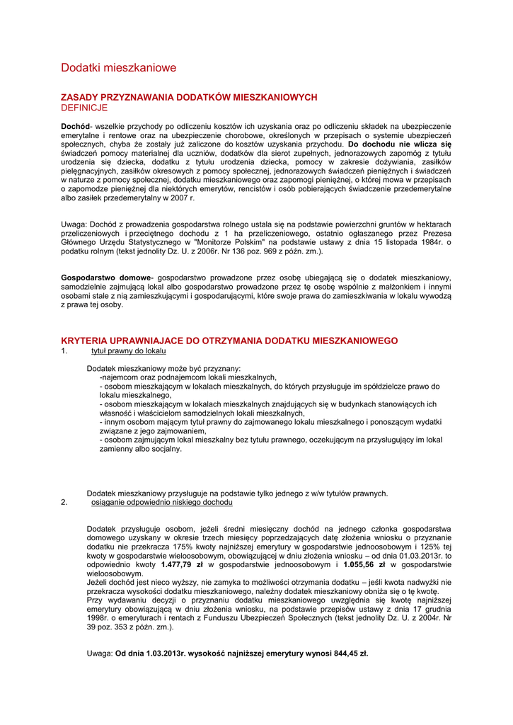 Dodatki mieszkaniowe ZASADY PRZYZNAWANIA DODATKÓW MIESZKANIOWYCH DEFINICJE Dochód- wszelkie przychody po odliczeniu kosztów ich uzyskania oraz po odliczeniu składek na ubezpieczenie emerytalne i rentowe oraz na ubezpieczenie chorobowe, określonych w przepisach o systemie ubezpieczeń społecznych, chyba że zostały już zaliczone do kosztów uzyskania przychodu. Do dochodu nie wlicza się świadczeń pomocy materialnej dla uczniów, dodatków dla sierot zupełnych, jednorazowych zapomóg z tytułu urodzenia się dziecka, dodatku z tytułu urodzenia dziecka, pomocy w zakresie dożywiania, zasiłków pielęgnacyjnych, zasiłków okresowych z pomocy społecznej, jednorazowych świadczeń pieniężnych i świadczeń w naturze z pomocy społecznej, dodatku mieszkaniowego oraz zapomogi pieniężnej, o której mowa w przepisach o zapomodze pieniężnej dla niektórych emerytów, rencistów i osób pobierających świadczenie przedemerytalne albo zasiłek przedemerytalny w 2007 r. Uwaga: Dochód z prowadzenia gospodarstwa rolnego ustala się na podstawie powierzchni gruntów w hektarach przeliczeniowych i przeciętnego dochodu z 1 ha przeliczeniowego, ostatnio ogłaszanego przez Prezesa Głównego Urzędu Statystycznego w "Monitorze Polskim" na podstawie ustawy z dnia 15 listopada 1984r. o podatku rolnym (tekst jednolity Dz. U. z 2006r. Nr 136 poz. 969 z późn. zm.). Gospodarstwo domowe- gospodarstwo prowadzone przez osobę ubiegającą się o dodatek mieszkaniowy, samodzielnie zajmującą lokal albo gospodarstwo prowadzone przez tę osobę wspólnie z małżonkiem i innymi osobami stale z nią zamieszkującymi i gospodarującymi, które swoje prawa do zamieszkiwania w lokalu wywodzą z prawa tej osoby. KRYTERIA UPRAWNIAJACE DO OTRZYMANIA DODATKU MIESZKANIOWEGO 1. tytuł prawny do lokalu Dodatek mieszkaniowy może być przyznany: -najemcom oraz podnajemcom lokali mieszkalnych, - osobom mieszkającym w lokalach mieszkalnych, do których przysługuje im spółdzielcze prawo do lokalu mieszkalnego, - osobom mieszkającym w lokalach mieszkalnych znajdujących się w budynkach stanowiących ich własność i właścicielom samodzielnych lokali mieszkalnych, - innym osobom mającym tytuł prawny do zajmowanego lokalu mieszkalnego i ponoszącym wydatki związane z jego zajmowaniem, - osobom zajmującym lokal mieszkalny bez tytułu prawnego, oczekującym na przysługujący im lokal zamienny albo socjalny. 2. Dodatek mieszkaniowy przysługuje na podstawie tylko jednego z w/w tytułów prawnych. osiąganie odpowiednio niskiego dochodu Dodatek przysługuje osobom, jeżeli średni miesięczny dochód na jednego członka gospodarstwa domowego uzyskany w okresie trzech miesięcy poprzedzających datę złożenia wniosku o przyznanie dodatku nie przekracza 175% kwoty najniższej emerytury w gospodarstwie jednoosobowym i 125% tej kwoty w gospodarstwie wieloosobowym, obowiązującej w dniu złożenia wniosku – od dnia 01.03.2013r. to odpowiednio kwoty 1.477,79 zł w gospodarstwie jednoosobowym i 1.055,56 zł w gospodarstwie wieloosobowym. Jeżeli dochód jest nieco wyższy, nie zamyka to możliwości otrzymania dodatku – jeśli kwota nadwyżki nie przekracza wysokości dodatku mieszkaniowego, należny dodatek mieszkaniowy obniża się o tę kwotę. Przy wydawaniu decyzji o przyznaniu dodatku mieszkaniowego uwzględnia się kwotę najniższej emerytury obowiązującą w dniu złożenia wniosku, na podstawie przepisów ustawy z dnia 17 grudnia 1998r. o emeryturach i rentach z Funduszu Ubezpieczeń Społecznych (tekst jednolity Dz. U. z 2004r. Nr 39 poz. 353 z późn. zm.). Uwaga: Od dnia 1.03.2013r. wysokość najniższej emerytury wynosi 844,45 zł. 3. 1. odpowiednia powierzchnia użytkowa lokalu Powierzchnia użytkowa zajmowanego lokalu mieszkalnego nie może przekraczać normatywnej powierzchni użytkowej o więcej niż: 30 % albo 2. 50 % pod warunkiem, że udział powierzchni pokoi i kuchni w powierzchni użytkowej tego lokalu nie przekracza 60 %. Liczba członków gospodarstwa domowego Powierzchnia normatywna [ w m² ] Powierzchnia dopuszczalna przy 30% przekroczeniu pow. normatywnej [ w m² ] 1 osoba 35 45,50 2 osoby 40 52,00 3 osoby 45 58,50 4 osoby 55 71,50 5 osób 65 84,50 6 osób 70 91,00 W przypadku zamieszkiwania w lokalu większej liczby osób, dla każdej kolejnej osoby zwiększa się normatywną powierzchnię tego lokalu o 5 m². Normy powierzchni użytkowej lokalu mieszkalnego podwyższa się o 15 m² zawsze, jeżeli w mieszkaniu zamieszkuje osoba niepełnosprawna poruszająca się na wózku. W przypadku gospodarstw domowych dwuosobowych lub większych normy powierzchni użytkowej podwyższa się o 15 m², jeżeli w lokalu mieszkalnym zamieszkuje osoba niepełnosprawna, której niepełnosprawność wymaga zamieszkiwania w oddzielnym pokoju. O wymogu zamieszkiwania w oddzielnym pokoju orzekają powiatowe zespoły do spraw orzekania o niepełnosprawności. RODZAJE WYDATKÓW STANOWIĄCYCH PODSTAWĘ OBLICZENIA DODATKU MIESZKANIOWEGO. Wydatkami poniesionymi przez osobę ubiegającą się o dodatek mieszkaniowy są świadczenia okresowe ponoszone przez gospodarstwo domowe w związku z zajmowaniem lokalu mieszkalnego: - czynsz, - opłaty związane z eksploatacją i utrzymaniem nieruchomości w częściach przypadających na lokale mieszkalne w spółdzielni mieszkaniowej, - zaliczki na koszty zarządu nieruchomością wspólną, - odszkodowanie za zajmowanie lokalu bez tytułu prawnego, - inne, niż wymienione powyżej, opłaty za używanie lokalu mieszkalnego, - opłaty za energię cieplną, wodę, odbiór nieczystości stałych i płynnych, - wydatek stanowiący podstawę obliczania ryczałtu na zakup opału. Uwaga: Jeżeli osoba ubiegająca się o dodatek mieszkaniowy zamieszkuje w lokalu mieszkalnym lub domu niewchodzącym w skład mieszkaniowego zasobu gminy, do wydatków przyjmowanych dla celów obliczenia dodatku mieszkaniowego zalicza się: - wydatki, które w wypadku najmu lokalu miesz