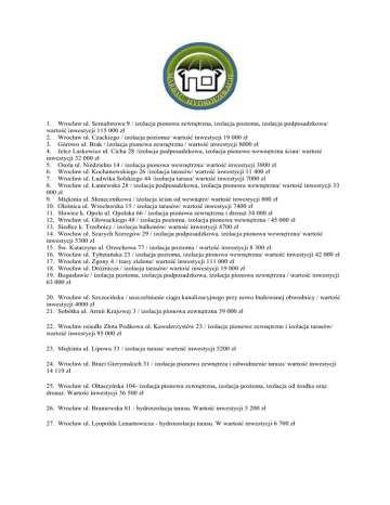 1. Wrocław ul. Semaforowa 9 / izolacja pionowa zewnętrzna, izolacja pozioma, izolacja podposadzkowa/ wartość inwestycji 115 000 zł 2. Wrocław ul. Czackiego / izolacja pozioma/ wartość inwestycji 19 000 zł 3. Górowo ul. Brak / izolacja pionowa zewnętrzna / wartość inwestycji 8000 zł 4. Jelcz Laskowice ul. Cicha 28 /izolacja podposadzkowa, izolacja pionowa wewnętrzna ścian/ wartość inwestycji 32 000 zł 5. Osola ul. Niedzielna 14 / izolacja pionowa wewnętrzna/ wartość inwestycji 3800 zł 6. Wrocław ul. Kochanowskiego 26 /izolacja tarasów/ wartość inwestycji 11 400 zł 7. Wrocław ul. Ludwika Solskiego 44 /izolacja tarasu/ wartość inwestycji 7000 zł 8. Wrocław ul. Łaniewska 28 / izolacja podposadzkowa, izolacja pionowa wewnętrzna/ wartość inwestycji 33 000 zł 9. Miękinia ul. Słonecznikowa / izolacja ścian od wewnątrz/ wartość inwestycji 800 zł 10. Oleśnica ul. Wrocławska 15 / izolacja tarasów/ wartość inwestycji 7400 zł 11. Sławice k. Opola ul. Opolska 66 / izolacja pionowa zewnętrzna i drenaż 34 000 zł 12. Wrocław ul. Głowackiego 48 / izolacja pozioma, izolacja pionowa wewnętrzna / 45 000 zł 13. Siedlce k. Trzebnicy / izolacja balkonów/ wartość inwestycji 4700 zł 14. Wrocław ul. Szarych Szeregów 29 / izolacja podposadzkowa, izolacja pionowa wewnętrzna/ wartość inwestycji 5300 zł 15. Św. Katarzyna ul. Orzechowa 77 / izolacja pozioma / wartość inwestycji 8 300 zł. 16. Wrocław ul. Tybetańska 23 / izolacja pozioma, izolacja pionowa wewnętrzna/ wartość inwestycji 42 000 zł 17. Wrocław ul. Zgony 4 / trasy zielone/ wartość inwestycji 111 000 zł 18. Wrocław ul. Dróżnicza / izolacja tarasów/ wartość inwestycji 19 000 zł 19. Bogusławie / izolacja pozioma, izolacja podposadzkowa, izolacja pionowa zewnętrzna / wartość inwestycji 63 000 zł 20. Wrocław ul. Szczecińska / uszczelnianie ciągu kanalizacyjnego przy nowo budowanej obwodnicy / wartość inwestycji 4000 zł 21. Sobótka ul. Armii Krajowej 3 / izolacja pionowa zewnętrzna 39 000 zł 22. Wrocław osiedle Złota Podkowa ul. Kawalerzystów 23 / izolacje pionowe zewnętrzne i izolacje tarasów/ wartość inwestycji 95 000 zł 23. Miękinia ul. Lipowa 33 / izolacja tarasu/ wartość inwestycji 5200 zł 24. Wrocław ul. Braci Gierymskich 31 / izolacja pionowa zewnętrza i odwodnienie tarasu/ wartość inwestycji 14 119 zł 25. Wrocław ul. Ołtaszyńska 104- izolacja pionowa zewnętrzna, izolacja pozioma, izolacja od środka oraz drenaż. Wartość inwestycji 36 500 zł 26. Wrocław ul. Braniewska 81 - hydroizolacja tarasu. Wartość inwestycji 5 200 zł 27. Wrocław ul. Leopolda Lenartowicza - hydroizolacja tarasu. W wartość inwestycji 6 700 zł