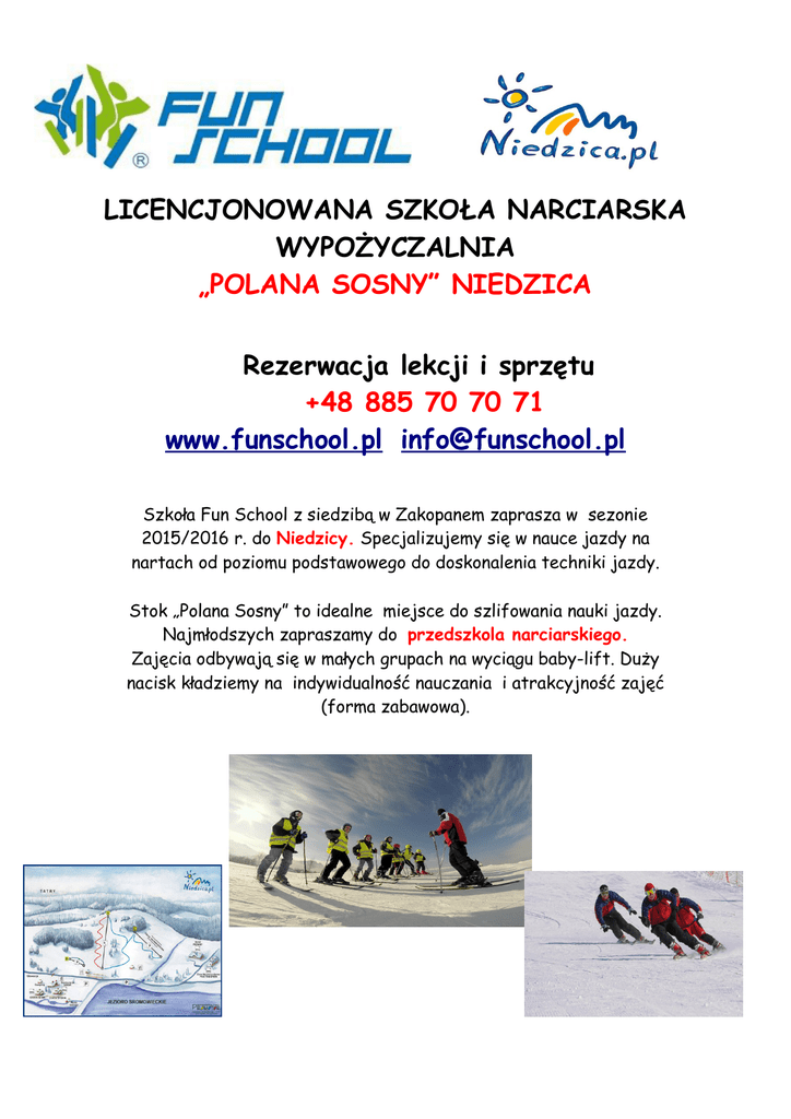 LICENCJONOWANA SZKOŁA NARCIARSKA WYPOŻYCZALNIA „POLANA SOSNY” NIEDZICA Rezerwacja lekcji i sprzętu +48 885 70 70 71 www.funschool.pl [email protected] Szkoła Fun School z siedzibą w Zakopanem zaprasza w sezonie 2015/2016 r. do Niedzicy. Specjalizujemy się w nauce jazdy na nartach od poziomu podstawowego do doskonalenia techniki jazdy. Stok „Polana Sosny” to idealne miejsce do szlifowania nauki jazdy. Najmłodszych zapraszamy do przedszkola narciarskiego. Zajęcia odbywają się w małych grupach na wyciągu baby-lift. Duży nacisk kładziemy na indywidualność nauczania i atrakcyjność zajęć (forma zabawowa). Cennik na sezon 2015/2016 r. LEKCJE INDYWIDUALNE (NARTY, SNOWBOARD) osoba 11 osoba osoby 22 osoby osoby 33 osoby 70 zł zł 70 110złzł 90 135 zł zł 110 Grupa: Grupa: wycena wycena indywidualna indywidualna Oszczędzaj w pakietach ! 1 osoba pakiet Cena Cena za 1 h w pakiecie 5h 325,00 zł 65,00 zł 7h 420,00 zł 60,00 zł 10 h 550,00 zł 55,00 zł Zajęcia pakietowe płatne z góry, do wykorzystania w sezonie 2015/2016r. po wcześniejszej rezerwacji telefonicznej +48 885 70 70 71. CENNIK WYPOŻYCZALNIA Rodzaj usługi 2 h Następna godzina Doba Komplet nart 25,00 zł 5,00 zł 45,00 zł Narty 15,00 zł 4,00 zł 30,00 zł Buty 13,00 zł 3,00 zł 20,00 zł Kijki 7,00 zł 3,00 zł 15,00 zł Snowboard komplet 25,00 zł 5,00 zł 50,00 zł Snowboard 20,00 zł 4,00 zł 35,00 zł Kask 6,00 zł 3,00 zł 15,00 zł UWAGA: grupy wycena indywidualna KURS SYLWESTROWY 28 – 31 grudzień 2015 r. 4 dniowy kurs (8 h lekcyjnych) – 300 zł Grupa poranna: 10:00- 12:00 Grupa popołudniowa: 14:00 -16:00 5 % zniżki – zapisy – 2 dzieci 10 % zniżki – 3 lub więcej KURSY FERYJNE DLA DZIECI Najlepsza propozycja by dzieci poprzez zabawę uczyły się jazdy na nartach wraz z rówieśnikami. Na terenie przedszkola znajdują się figurki i zabawki które umilają część zajęć. Na koniec kursu każde dziecko staruje w zawodach, kibicowanie rodziców obowiązkowe! Dla wszystkich uczestników dyplomy. Zapisz swoją pociechę już dziś ! Zapraszamy w poniższych terminach Zajęcia rozpoczynają się w poniedziałek, kończą w piątek. TERMIN I: 18 styczeń (poniedziałek) - 22 styczeń 2016 r. (piątek) TERMIN II: 25 styczeń (poniedziałek) - 29 styczeń 2016 r. (piątek) TERMIN III: 1 luty (poniedziałek) - 5 luty 2016 r. (piątek) TERMIN IV: 8 luty (poniedziałek) - 12 luty 2016 r. (piątek) TERMIN V: 15 luty (poniedziałek) - 19 luty 2016 r. (piątek) TERMIN VI: 22 luty (poniedziałek) - 26 luty 2016 r. (piątek) 5 % zniżki – zapisy – 2 dzieci 10 % zniżki – 3 lub więcej Kurs 5 dniowy obejmuje (10 h lekcyjnych) w max. 5 osobowych grupach. 380 zł ZAPISY: Prosimy o podanie i wysłanie maila na adres 1. 2. 3. 4. [email protected]: imienia i nazwiska dziecka tel. kontaktowego poziomu zaawansowania terminu kursu + nazwy stoku: NIEDZICA Do zakwalifikowania niezbędna jest wpłata za kurs w wysokości 150zł na poniższe konto: ING o Zakopane: 73 1050 1474 1000 0090 9254 5491