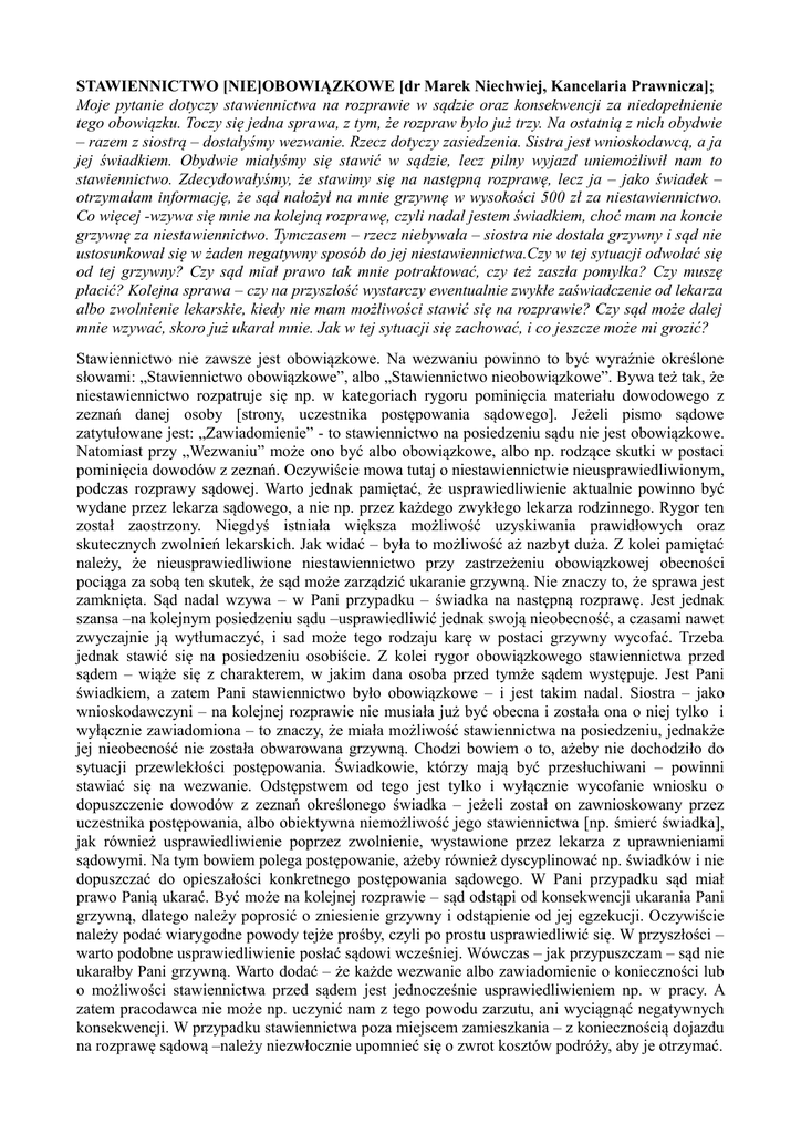 STAWIENNICTWO [NIE]OBOWIĄZKOWE [dr Marek Niechwiej, Kancelaria Prawnicza]; Moje pytanie dotyczy stawiennictwa na rozprawie w sądzie oraz konsekwencji za niedopełnienie tego obowiązku. Toczy się jedna sprawa, z tym, że rozpraw było już trzy. Na ostatnią z nich obydwie – razem z siostrą – dostałyśmy wezwanie. Rzecz dotyczy zasiedzenia. Sistra jest wnioskodawcą, a ja jej świadkiem. Obydwie miałyśmy się stawić w sądzie, lecz pilny wyjazd uniemożliwił nam to stawiennictwo. Zdecydowałyśmy, że stawimy się na następną rozprawę, lecz ja – jako świadek – otrzymałam informację, że sąd nałożył na mnie grzywnę w wysokości 500 zł za niestawiennictwo. Co więcej -wzywa się mnie na kolejną rozprawę, czyli nadal jestem świadkiem, choć mam na koncie grzywnę za niestawiennictwo. Tymczasem – rzecz niebywała – siostra nie dostała grzywny i sąd nie ustosunkował się w żaden negatywny sposób do jej niestawiennictwa.Czy w tej sytuacji odwołać się od tej grzywny? Czy sąd miał prawo tak mnie potraktować, czy też zaszła pomyłka? Czy muszę płacić? Kolejna sprawa – czy na przyszłość wystarczy ewentualnie zwykłe zaświadczenie od lekarza albo zwolnienie lekarskie, kiedy nie mam możliwości stawić się na rozprawie? Czy sąd może dalej mnie wzywać, skoro już ukarał mnie. Jak w tej sytuacji się zachować, i co jeszcze może mi grozić? Stawiennictwo nie zawsze jest obowiązkowe. Na wezwaniu powinno to być wyraźnie określone słowami: „Stawiennictwo obowiązkowe”, albo „Stawiennictwo nieobowiązkowe”. Bywa też tak, że niestawiennictwo rozpatruje się np. w kategoriach rygoru pominięcia materiału dowodowego z zeznań danej osoby [strony, uczestnika postępowania sądowego]. Jeżeli pismo sądowe zatytułowane jest: „Zawiadomienie” - to stawiennictwo na posiedzeniu sądu nie jest obowiązkowe. Natomiast przy „Wezwaniu” może ono być albo obowiązkowe, albo np. rodzące skutki w postaci pominięcia dowodów z zeznań. Oczywiście mowa tutaj o niestawiennictwie nieusprawiedliwionym, podczas rozprawy sądowej. Warto jednak pamiętać, że usprawiedliwienie aktualnie powinno być wydane przez lekarza sądowego, a nie np. przez każdego zwykłego lekarza rodzinnego. Rygor ten został zaostrzony. Niegdyś istniała większa możliwość uzyskiwania prawidłowych oraz skutecznych zwolnień lekarskich. Jak widać – była to możliwość aż nazbyt duża. Z kolei pamiętać należy, że nieusprawiedliwione niestawiennictwo przy zastrzeżeniu obowiązkowej obecności pociąga za sobą ten skutek, że sąd może zarządzić ukaranie grzywną. Nie znaczy to, że sprawa jest zamknięta. Sąd nadal wzywa – w Pani przypadku – świadka na następną rozprawę. Jest jednak szansa –na kolejnym posiedzeniu sądu –usprawiedliwić jednak swoją nieobecność, a czasami nawet zwyczajnie ją wytłumaczyć, i sad może tego rodzaju karę w postaci grzywny wycofać. Trzeba jednak stawić się na posiedzeniu osobiście. Z kolei rygor obowiązkowego stawiennictwa przed sądem – wiąże się z charakterem, w jakim dana osoba przed tymże sądem występuje. Jest Pani świadkiem, a zatem Pani stawiennictwo było obowiązkowe – i jest takim nadal. Siostra – jako wnioskodawczyni – na kolejnej rozprawie nie musiała już być obecna i została ona o niej tylko i wyłącznie zawiadomiona – to znaczy, że miała możliwość stawiennictwa na posiedzeniu, jednakże jej nieobecność nie została obwarowana grzywną. Chodzi bowiem o to, ażeby nie dochodziło do sytuacji przewlekłości postępowania. Świadkowie, którzy mają być przesłuchiwani – powinni stawiać się na wezwanie. Odstępstwem od tego jest tylko i wyłącznie wycofanie wniosku o dopuszczenie dowodów z zeznań określonego świadka – jeżeli został on zawnioskowany przez uczestnika postępowania, albo obiektywna niemożliwość jego stawiennictwa [np. śmierć świadka], jak również usprawiedliwienie poprzez zwolnienie, wystawione przez lekarza z uprawnieniami sądowymi. Na tym bowiem polega postępowanie, ażeby również dyscyplinować np. świadków i nie dopuszczać do opieszałości konkretnego postępowania sądowego. W Pani przypadku sąd miał prawo Panią ukarać. Być może na kolejnej rozprawie – sąd odstąpi od konsekwencji ukarania Pani grzywną, dlatego należy poprosić o zniesienie grzywny i odstąpienie od jej egzekucji. Oczywiście należy podać wiarygodne powody tejże prośby, czyli po prostu usprawiedliwić się. W przyszłości – warto podobne usprawiedliwienie posłać sądowi wcześniej. Wówczas – jak przypuszczam – sąd nie ukarałby Pani grzywną. Warto dodać – że każde wezwanie albo zawiadomienie o konieczności lub o możliwości stawiennictwa przed sądem jest jednocześnie usprawiedliwieniem np. w pracy. A zatem pracodawca nie może np. uczynić nam z tego powodu zarzutu, ani wyciągnąć negatywnych konsekwencji. W przypadku stawiennictwa poza miejscem zamieszkania – z koniecznością dojazdu na rozprawę sądową –należy niezwłocznie upomnieć się o zwrot kosztów podróży, aby je otrzymać.