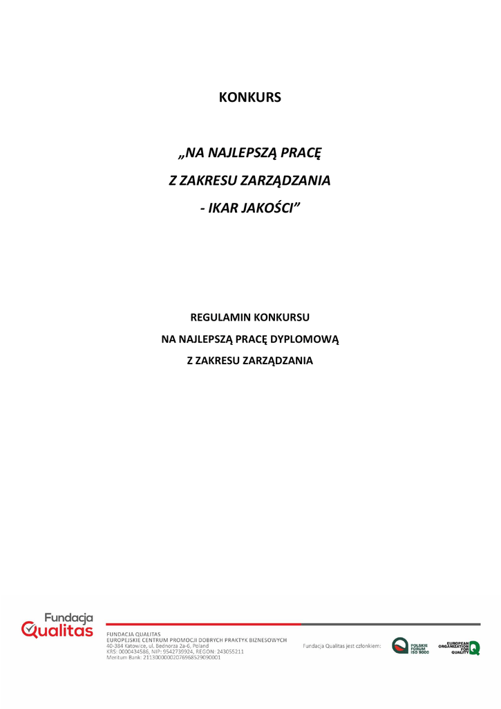 KONKURS „NA NAJLEPSZĄ PRACĘ Z ZAKRESU ZARZĄDZANIA - IKAR JAKOŚCI” REGULAMIN KONKURSU NA NAJLEPSZĄ PRACĘ DYPLOMOWĄ Z ZAKRESU ZARZĄDZANIA §1 Pomysłodawcą i organizatorem konkursu na najlepszą pracę dyplomową jest Fundacja Qualitas Europejskie Centrum Dobrych Praktyk Biznesowych z siedzibą w Katowicach. Fundacja Qualitas zastrzega sobie prawo zmian w niniejszym regulaminie konkursu, a także interpretacji spraw spornych. §2 Konkurs na najlepszą pracę dyplomową realizowany jest na podstawie zgłoszeń konkursowych przesłanych na adres Fundacji Qualitas przez promotorów prac obronionych zarówno w technicznych, jak i ekonomicznych, państwowych i prywatnych uczelniach w Polsce. §3 Idea konkursu ma służyć promowaniu: - autorów nagrodzonych wyróżniających się prac dyplomowych realizowanych na poziomie pierwszego i drugiego stopnia kształcenia wyższego; - tematyki zarządzania jakością; - stworzeniu stałej platformy wymiany informacji pomiędzy studentami i absolwentami uczelni a przedstawicielami świata biznesu; - rozwiązań naukowych, mogących mieć lub mających zastosowanie praktyczne w działalności gospodarczej. §4 Tryb naboru oraz wymogi wobec autorów i ich prac zgłaszanych do konkursu: 4.1. W konkursie zgłaszane są prace w następujących kategoriach: - kategoria pierwsza konkursu – prace dyplomowe inżynierskie, licencjackie, - kategoria druga konkursu – prace dyplomowe magisterskie, z zakresu wszystkich obszarów i dyscyplin nauki, obronione w na terytorium Polski i ukierunkowane na tematykę zarządzania. uczelniach 4.2. Tematyka zgłoszonych prac musi być aktualna i odpowiadać współczesnym zagadnieniom z zakresu zarządzania. Fundacja Qualitas zastrzega sobie prawo podawania w ramach realizacji konkursu obszarów tematycznych prac na stronie internetowej z co najmniej rocznym wyprzedzeniem. Przedmiot badawczy prac powinien dotyczyć szeroko rozumianej problematyki wdrażania, utrzymania, funkcjonowania i doskonalenia zarządzania jakością. Walory metodologiczne prac winny prezentować wysoki poziom, adekwatny do wymogów stawianych pracom inżynierskim, licencjackim i magisterskim. Preferowanymi wyróżnikami pracy są walory: naukowe, poznawcze i praktyczno – wdrożeniowe. 4.3. Do konkursu przyjmowane są prace dyplomowe zakończone w danym roku konkursowym, w którym odbywa się konkurs lub kalendarzowym roku poprzednim. 4.4. Pracę do konkursu zgłasza promotor pracy za zgodą dziekana wydziału na formularzu stanowiącym załącznik nr 1 do niniejszego Regulaminu. Załącznik można pobrać ze strony internetowej www.jakoscroku.pl. Każdy wydział ma prawo zgłoszenia do 3 prac w ramach jednej edycji konkursu, z zastrzeżeniem, że przynajmniej jedna z nich będzie pracą inżynierską i/lub licencjacką. 4.5. Zgłoszenie powinno zawierać: 1) imię i nazwisko autora pracy, dokładne i aktualne dane kontaktowe (adres, adres poczty elektronicznej, numer telefonu), 2) imię i nazwisko oraz tytuł naukowy promotora, nazwę uczelni, wydziału i instytutu (katedry) wraz z dokładnym adresem, w której zgłaszana praca powstała, 3) temat pracy w języku polskim i angielskim, 4) streszczenie pracy max. 2500 znaków w języku polskim i angielskim, wskazujące na najważniejsze walory pracy, w tym uzyskane wyniki. 5.6. Do formularza zgłoszenia konkursowego pracy wymagane jest dołączenie także: 1) posteru prezentującego wyniki pracy w języku polskim wg zamieszczonego wzoru – załącznik 2, 2) pełnego tekstu pracy w wersji elektronicznej (format doc, docx lub pdf), opisanym zgodnie z załącznikiem 3. §5 Organizacja i tryb pracy Kapituły Konkursu: 5.1. Konkurs rozstrzyga Kapituła Konkursu powołana przez Fundację Qualitas. 5.2. Zadaniem Kapituły Konkursu jest koordynacja i realizacja działań zgodnie z harmonogramem konkursu oraz promowanie idei konkursu. 5.3. Fundacja Qualitas powołuje Przewodniczącego i Sekretarza Kapituły. 5.4. W skład Kapituły Konkursu wchodzą osoby powołane przez Fundację Qualitas. 5.5. Udział promotora pracy w posiedzeniach Kapituły Konkursu nie jest możliwy. 5.6. W postępowaniu konkursowym Kapituły Konkursu wyróżnia się: 1. etap pierwszy – postępowanie kwalifikacyjne - zapoznania się członków Kapituły Konkursu ze zgłoszonymi pracami i przyjęcie ich do postępowania konkursowego, 2. etap drugi – postępowanie konkursowe - rozstrzygnięcie konkursu. 5.7. W sprawach nierozstrzygniętych decydujący głos należy do Przewodniczącego Kapituły. 5.8. W wyniku postępowania konkursowego na najlepszą pracę dyplomową przyznawane są w każdej kategorii nagrody i wyróżnienia: zwycięzca w danej kategorii – laureat oraz dwa wyróżnienia. 5.9. Obrady Kapituły są niejawne. Od decyzji w sprawie przyznania nagrody nie przysługuje odwołanie. §6 Formy nagrody: 6.1. Nagrody w ramach realizowanego konkursu przyznawane są autorom prac. 6.2. Autor oraz promotor każdej zgłoszonej pracy spełniającej kryteria konkursu i zakwalifikowanej do postępowania konkursowego – etap drugi, otrzymuje certyfikat uczestnictwa w konkursie, wstawiany przez Fundację Qualitas. 6.3. Laureatom przyznaje się dyplom „Nagroda za najlepszą pracę dotyczącą zarządzania IKAR JAKOŚCI” wraz z medalem IKAR JAKOŚCI, wyróżnionym autorom prac przyznaje się dyplom „Wyróżnienie za najlepszą pracę dotyczącą systemów zarządzania - IKAR JAKOŚCI”. 6.4. Przedmiot i rodzaj nagrody ustalany jest przez Fundację Qualitas. 6.5. W szczególnych przypadkach pozostawia się możliwość odstąpienia od przyznania nagród i wyróżnień w konkursie w danych kategoriach konkursowych. §7 Przeprowadzanie konkursu: 7.1. Konkurs na najlepszą pracę dyplomową przeprowadzany jest raz w roku kalendarzowym. 7.2. Konkurs na najlepszą pracę dyplomową odbywa się zgodnie z harmonogramem konkursu zatwierdzonym przez Fundację Qualitas. Harmonogram podawany jest do publicznej wiadomości na str