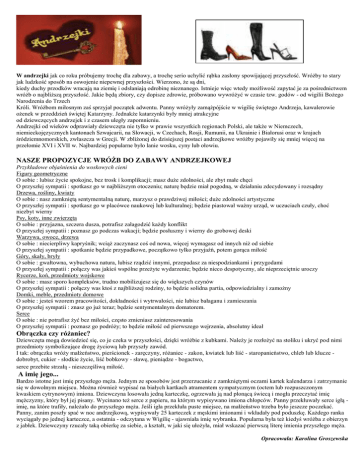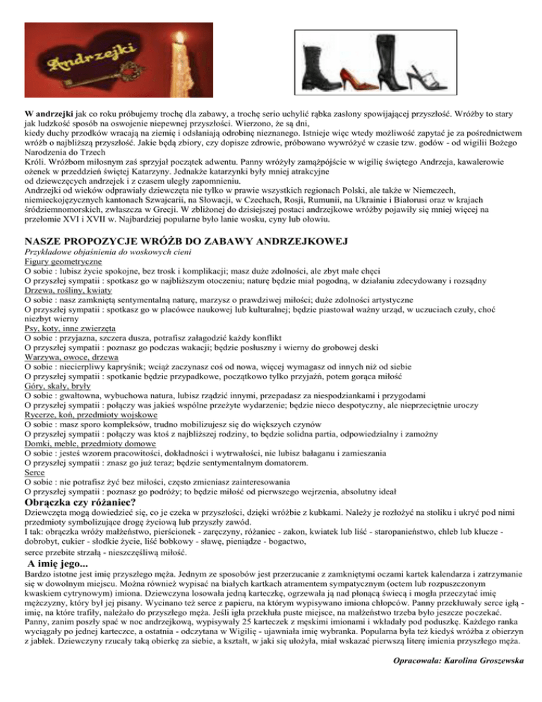 W andrzejki jak co roku próbujemy trochę dla zabawy, a trochę serio uchylić rąbka zasłony spowijającej przyszłość. Wróżby to stary jak ludzkość sposób na oswojenie niepewnej przyszłości. Wierzono, że są dni, kiedy duchy przodków wracają na ziemię i odsłaniają odrobinę nieznanego. Istnieje więc wtedy możliwość zapytać je za pośrednictwem wróżb o najbliższą przyszłość. Jakie będą zbiory, czy dopisze zdrowie, próbowano wywróżyć w czasie tzw. godów - od wigilii Bożego Narodzenia do Trzech Króli. Wróżbom miłosnym zaś sprzyjał początek adwentu. Panny wróżyły zamążpójście w wigilię świętego Andrzeja, kawalerowie ożenek w przeddzień świętej Katarzyny. Jednakże katarzynki były mniej atrakcyjne od dziewczęcych andrzejek i z czasem uległy zapomnieniu. Andrzejki od wieków odprawiały dziewczęta nie tylko w prawie wszystkich regionach Polski, ale także w Niemczech, niemieckojęzycznych kantonach Szwajcarii, na Słowacji, w Czechach, Rosji, Rumunii, na Ukrainie i Białorusi oraz w krajach śródziemnomorskich, zwłaszcza w Grecji. W zbliżonej do dzisiejszej postaci andrzejkowe wróżby pojawiły się mniej więcej na przełomie XVI i XVII w. Najbardziej popularne było lanie wosku, cyny lub ołowiu. NASZE PROPOZYCJE WRÓŻB DO ZABAWY ANDRZEJKOWEJ Przykładowe objaśnienia do woskowych cieni Figury geometryczne O sobie : lubisz życie spokojne, bez trosk i komplikacji; masz duże zdolności, ale zbyt małe chęci O przyszłej sympatii : spotkasz go w najbliższym otoczeniu; naturę będzie miał pogodną, w działaniu zdecydowany i rozsądny Drzewa, rośliny, kwiaty O sobie : nasz zamkniętą sentymentalną naturę, marzysz o prawdziwej miłości; duże zdolności artystyczne O przyszłej sympatii : spotkasz go w placówce naukowej lub kulturalnej; będzie piastował ważny urząd, w uczuciach czuły, choć niezbyt wierny Psy, koty, inne zwierzęta O sobie : przyjazna, szczera dusza, potrafisz załagodzić każdy konflikt O przyszłej sympatii : poznasz go podczas wakacji; będzie posłuszny i wierny do grobowej deski Warzywa, owoce, drzewa O sobie : niecierpliwy kapryśnik; wciąż zaczynasz coś od nowa, więcej wymagasz od innych niż od siebie O przyszłej sympatii : spotkanie będzie przypadkowe, początkowo tylko przyjaźń, potem gorąca miłość Góry, skały, bryły O sobie : gwałtowna, wybuchowa natura, lubisz rządzić innymi, przepadasz za niespodziankami i przygodami O przyszłej sympatii : połączy was jakieś wspólne przeżyte wydarzenie; będzie nieco despotyczny, ale nieprzeciętnie uroczy Rycerze, koń, przedmioty wojskowe O sobie : masz sporo kompleksów, trudno mobilizujesz się do większych czynów O przyszłej sympatii : połączy was ktoś z najbliższej rodziny, to będzie solidna partia, odpowiedzialny i zamożny Domki, meble, przedmioty domowe O sobie : jesteś wzorem pracowitości, dokładności i wytrwałości, nie lubisz bałaganu i zamieszania O przyszłej sympatii : znasz go już teraz; będzie sentymentalnym domatorem. Serce O sobie : nie potrafisz żyć bez miłości, często zmieniasz zainteresowania O przyszłej sympatii : poznasz go podróży; to będzie miłość od pierwszego wejrzenia, absolutny ideał Obrączka czy różaniec? Dziewczęta mogą dowiedzieć się, co je czeka w przyszłości, dzięki wróżbie z kubkami. Należy je rozłożyć na stoliku i ukryć pod nimi przedmioty symbolizujące drogę życiową lub przyszły zawód. I tak: obrączka wróży małżeństwo, pierścionek - zaręczyny, różaniec - zakon, kwiatek lub liść - staropanieństwo, chleb lub klucze dobrobyt, cukier - słodkie życie, liść bobkowy - sławę, pieniądze - bogactwo, serce przebite strzałą - nieszczęśliwą miłość. A imię jego... Bardzo istotne jest imię przyszłego męża. Jednym ze sposobów jest przerzucanie z zamkniętymi oczami kartek kalendarza i zatrzymanie się w dowolnym miejscu. Można również wypisać na białych kartkach atramentem sympatycznym (octem lub rozpuszczonym kwaskiem cytrynowym) imiona. Dziewczyna losowała jedną karteczkę, ogrzewała ją nad płonącą świecą i mogła przeczytać imię mężczyzny, który był jej pisany. Wycinano też serce z papieru, na którym wypisywano imiona chłopców. Panny przekłuwały serce igłą imię, na które trafiły, należało do przyszłego męża. Jeśli igła przekłuła puste miejsce, na małżeństwo trzeba było jeszcze poczekać. Panny, zanim poszły spać w noc andrzejkową, wypisywały 25 karteczek z męskimi imionami i wkładały pod poduszkę. Każdego ranka wyciągały po jednej karteczce, a ostatnia - odczytana w Wigilię - ujawniała imię wybranka. Popularna była też kiedyś wróżba z obierzyn z jabłek. Dziewczyny rzucały taką obierkę za siebie, a kształt, w jaki się ułożyła, miał wskazać pierwszą literę imienia przyszłego męża. Opracowała: Karolina Groszewska