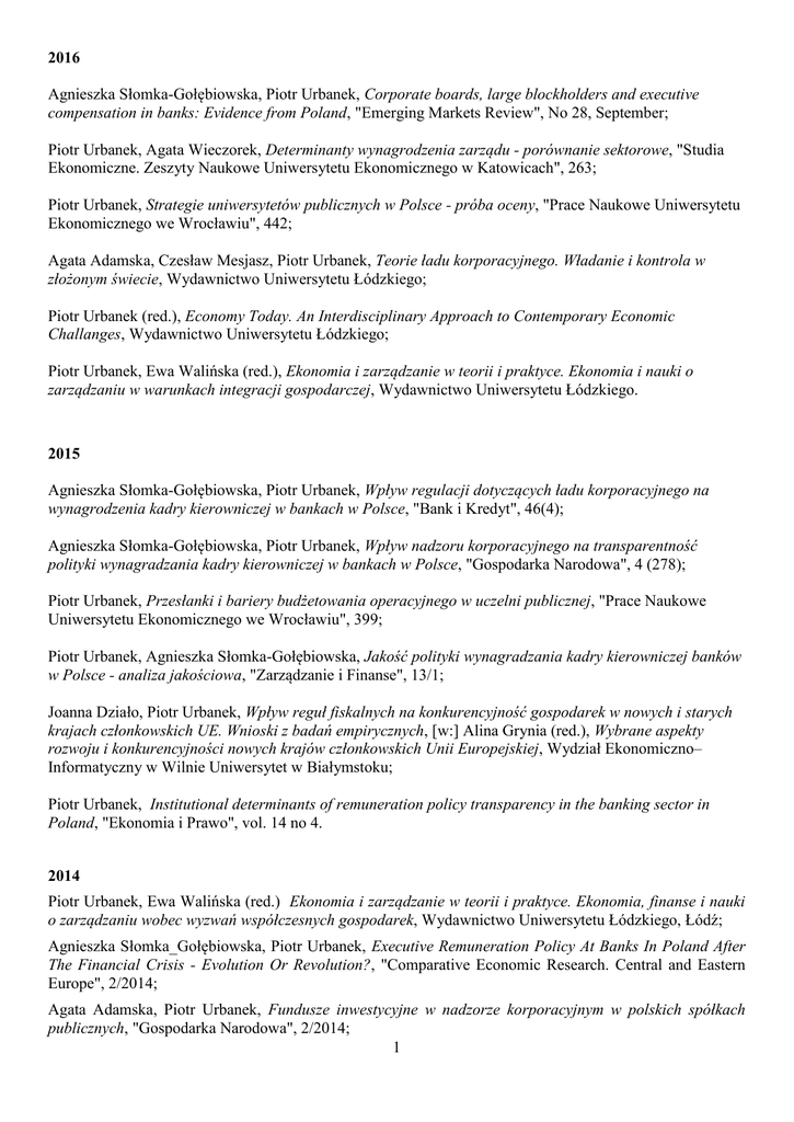 2016 Agnieszka Słomka-Gołębiowska, Piotr Urbanek, Corporate boards, large blockholders and executive compensation in banks: Evidence from Poland, "Emerging Markets Review", No 28, September; Piotr Urbanek, Agata Wieczorek, Determinanty wynagrodzenia zarządu - porównanie sektorowe, "Studia Ekonomiczne. Zeszyty Naukowe Uniwersytetu Ekonomicznego w Katowicach", 263; Piotr Urbanek, Strategie uniwersytetów publicznych w Polsce - próba oceny, "Prace Naukowe Uniwersytetu Ekonomicznego we Wrocławiu", 442; Agata Adamska, Czesław Mesjasz, Piotr Urbanek, Teorie ładu korporacyjnego. Władanie i kontrola w złożonym świecie, Wydawnictwo Uniwersytetu Łódzkiego; Piotr Urbanek (red.), Economy Today. An Interdisciplinary Approach to Contemporary Economic Challanges, Wydawnictwo Uniwersytetu Łódzkiego; Piotr Urbanek, Ewa Walińska (red.), Ekonomia i zarządzanie w teorii i praktyce. Ekonomia i nauki o zarządzaniu w warunkach integracji gospodarczej, Wydawnictwo Uniwersytetu Łódzkiego. 2015 Agnieszka Słomka-Gołębiowska, Piotr Urbanek, Wpływ regulacji dotyczących ładu korporacyjnego na wynagrodzenia kadry kierowniczej w bankach w Polsce, "Bank i Kredyt", 46(4); Agnieszka Słomka-Gołębiowska, Piotr Urbanek, Wpływ nadzoru korporacyjnego na transparentność polityki wynagradzania kadry kierowniczej w bankach w Polsce, "Gospodarka Narodowa", 4 (278); Piotr Urbanek, Przesłanki i bariery budżetowania operacyjnego w uczelni publicznej, "Prace Naukowe Uniwersytetu Ekonomicznego we Wrocławiu", 399; Piotr Urbanek, Agnieszka Słomka-Gołębiowska, Jakość polityki wynagradzania kadry kierowniczej banków w Polsce - analiza jakościowa, "Zarządzanie i Finanse", 13/1; Joanna Działo, Piotr Urbanek, Wpływ reguł fiskalnych na konkurencyjność gospodarek w nowych i starych krajach członkowskich UE. Wnioski z badań empirycznych, [w:] Alina Grynia (red.), Wybrane aspekty rozwoju i konkurencyjności nowych krajów członkowskich Unii Europejskiej, Wydział Ekonomiczno– Informatyczny w Wilnie Uniwersytet w Białymstoku; Piotr Urbanek, Institutional determinants of remuneration policy transparency in the banking sector in Poland, "Ekonomia i Prawo", vol. 14 no 4. 2014 Piotr Urbanek, Ewa Walińska (red.) Ekonomia i zarządzanie w teorii i praktyce. Ekonomia, finanse i nauki o zarządzaniu wobec wyzwań współczesnych gospodarek, Wydawnictwo Uniwersytetu Łódzkiego, Łódź; Agnieszka Słomka_Gołębiowska, Piotr Urbanek, Executive Remuneration Policy At Banks In Poland After The Financial Crisis - Evolution Or Revolution?, "Comparative Economic Research. Central and Eastern Europe", 2/2014; Agata Adamska, Piotr Urbanek, Fundusze inwestycyjne w nadzorze korporacyjnym w polskich spółkach publicznych, "Gospodarka Narodowa", 2/2014; 1 Piotr Urbanek, Problem agencji w warunkach zdecetralizowanego modelu zarządzania uczelnią publiczną, " Prace Naukowe Uniwersytetu Ekonomicznego we Wrocławiu ", 343; Piotr Urbanek, Programy partycypacji we własności jako narzędzie polityki wynagradzania kadry kierowniczej na przykładzie banków publicznych w Polsce, "Ekonomia i Prawo", vol.; Piotr Urbanek, Standardy etyczne polityki wynagradzania kadry kierowniczej w bankach w okresie kryzysu finansowego - próba oceny, " Prace Naukowe Uniwersytetu Ekonomicznego we Wrocławiu ", 330; Piotr Urbanek, Zmiany akcjonariatu a rotacja członków zarządu na przykładzie polskich spółek publicznych, "Studia Ekonomiczne. Zeszyty Naukowe Uniwersytetu Ekonomicznego w Katowicach", 166; Piotr Urbanek, Programy partycypacji we własności jako narzędzie kreacji czy destrukcji wartości dla akcjonariuszy, "Prace Naukowe Uniwersytetu Ekonomicznego we Wrocławiu", 347. 2013 Piotr Urbanek (red.) Corporate Governance in the Banking Sector, Wydawnictwo Uniwersytetu Łódzkiego, Łódź; Piotr Urbanek, (red.) Ekonomia i zarządzanie w teorii i praktyce. Determinanty konkurencyjności przedsiębiorstw, regionów, gospodarek, Wydawnictwo Uniwersytetu Łódzkiego, Łódź; Piotr Urbanek, Polityka wynagradzania kadry kierowniczej w polskich bankach publicznych na przykładzie spółek indeksu WIB20, "Prace Naukowe Uniwersytetu Ekonomicznego we Wrocławiu", 307; Piotr Urbanek, Polityka wynagradzania kadry kierowniczej w sektorze bankowym w świetle wyników badań empirycznych, "Zarządzanie i Finanse", 2; Piotr Urbanek, Wynik finansowy jako miernik dokonań uczelni publicznej, " Prace Naukowe Uniwersytetu Ekonomicznego we Wrocławiu ", 289; 2012 Piotr Urbanek, Mirosław Wcisły, Fuzje i przejęcia na polskim rynku kapitałowym w warunkach kryzysu gospodarczego, "Ekonomia Międzynarodowa", 3; Piotr Urbanek, Agata Wieczorek, Polityka wynagradzania kadry menedżerskiej jako czynnik budowy zaufania w sektorze bankowym na przykładzie banków publicznych w Polsce, [w:] Jan L.Bednarczyk, Wiesława Przybylska-Kapuścińska (red.), Polityka finansowa w dobie kryzysu integracji europejskiej, CeDeWu; 2011 Piotr Urbanek, Rynek kontroli nad korporacją w warunkach zamkniętego modelu kontroli (na przykładzie polskich spółek publicznych), "Zeszyty Naukowe PTE", 9; Piotr Urbanek, Czy nadzór korporacyjny uchronił polskie banki przed kryzysem?, "Prace Naukowe Uniwersytetu Ekonomicznego we Wrocławiu", 167; Piotr Urbanek, Polityka wynagradzania menedżerów w sektorze finansowym a praktyka polskich banków – wnioski z kryzysu finansowego, "Prace i Materiały Wydziału Zarządzania Uniwersytetu Gdańskiego", 2/1; Piotr Urbanek, Outsourcing w procesie restrukturyzacji przedsiębiorstwa w świetle teorii kosztów transakcyjnych , "Gospodarka Narodowa", 4; Piotr Urbanek, Controlling operacyjny jako narzędzie restrukturyzacji przedsiębiorstwa sektora energetycznego , "Prace Naukowe Uniwersytetu Ekonomicznego we Wrocławiu", 181; 2 Piotr Urbanek (red.), Ekonomia i zarzadzanie w teorii i praktyce, Polityka ekonomiczna i zarządzanie przedsiębiorstwem w warunkach kryzysu gospodarczego, Wydawnictwo Uniwersytetu Łódzkiego, Łódź; Piotr