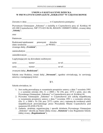 PRYWATNE GIMNAZJUM SOKRATES UMOWA O KSZTAŁCENIE DZIECKA W PRYWATNYM GIMNAZJUM „SOKRATES” W CZĘSTOCHOWIE Zawarta w dniu ____________________ w Częstochowie pomiędzy: Prywatnym Gimnazjum „Sokrates” z siedzibą w Częstochowie przy ul. Krótkiej 44 (42-200 Częstochowa), NIP 573-023-96-96, REGON 150908973-00063, zwanej dalej „Szkołą”; oraz Państwem ____________________________________________________________ Rodzicami/opiekunami prawnymi dziecka (data urodzenia _________________nr PESEL: zwanego dalej „Uczniem”, ___________________________ ) zamieszkałym ________________________________________________________ zameldowanym ________________________________________________________ Legitymującymi się dowodami osobistymi: seria __________ numer ____________________ nr tel. seria __________ numer ____________________ nr tel. zwanymi dalej „Rodzicami”. Szkoła oraz Rodzice, zwani dalej „Stronami”, zgodnie oświadczają, że zawierają umowę o następującej treści: § 1. Szkoła oświadcza, że: 1. Jest osobą prowadzącą w rozumieniu przepisów ustawy z dnia 7 września 1991 r. o systemie oświaty (Dz. U. z 2004 r. Nr 256, poz. 2572 z późn. zm.) dla Prywatnego Gimnazjum „Sokrates” w Częstochowie przy ul. Krótkiej 44. 2. Prywatne Gimnazjum „Sokrates” w Częstochowie jest szkołą niepubliczną w rozumieniu przepisów ustawy z dnia 7 września 1991 r. o systemie oświaty (Dz. U. z 2004 r. Nr 256, poz. 2572 z późn. zm.), wpisaną do ewidencji szkół niepublicznych prowadzonego przez Prezydenta Miasta Częstochowa pod numerem ES.4320-276/10. 3. Zadania, strukturę organizacyjną i sposób działania Prywatnego Gimnazjum „Sokrates” określa jej Statut (dalej zwany „Statutem”) oraz Regulamin Szkoły (dalej zwany „Regulaminem”). 1|S tr o na PRYWATNE GIMNAZJUM SOKRATES § 2. 1. Rodzice oświadczają, że: a. przysługuje im władza rodzicielska wobec/są prawnymi opiekunami Ucznia ________________________ i są uprawnieni do zawarcia niniejszej umowy, b. zapoznali się z treścią Statutu oraz Regulaminu. 2. Rodzice zapewniają, że przekazali Szkole rzetelną informację na temat stanu zdrowia Ucznia oraz wszelkich zdarzeń i okoliczności mogących mieć wpływ na jego zachowanie. § 3. 1. Na mocy niniejszej umowy Rodzice zlecają a Szkoła przyjmuje zlecenie świadczenia na rzecz Ucznia usług dydaktyczno-wychowawczych i opiekuńczych w Prywatnym Gimnazjum „Sokrates” w Częstochowie w zakresie określonym w Regulaminie, począwszy od roku szkolnego _____________. 2. Nie opisane w Regulaminie dodatkowe zajęcia dydaktyczno-wychowawcze oferowane przez Szkołę mogą być świadczone na mocy odrębnej umowy Rodziców ze Szkołą. 3. Szkoła zobowiązana jest do wykonywania niniejszej umowy z należytą starannością i najwyższą dbałością o dobro Ucznia. § 4. W ramach niniejszej umowy Rodzice zobowiązują się do: 1. Przestrzegania warunków niniejszej umowy, w szczególności terminowej zapłaty czesnego i innych opłat należnych Szkole. 2. Zapewnienia regularnego uczęszczania Ucznia na zajęcia prowadzone przez Szkołę i zapewnienia Uczniowi warunków umożliwiających przygotowywanie się do zajęć celem wypełniania obowiązku szkolnego. 3. Ścisłej współpracy ze Szkołą przez cały czas trwania niniejszej umowy. 4. Przestrzegania Statutu i Regulaminu w zakresie dotyczącym praw i obowiązków Rodziców. § 5. 1. Niniejsza umowa zostaje zawarta na czas określony, od dnia jej zawarcia do dnia 31 sierpnia roku ________ tj. do końca roku szkolnego w którym następuje ukończenie przez Ucznia cyklu kształcenia w gimnazjum. 2|S tr o na PRYWATNE GIMNAZJUM SOKRATES 2. Na potrzeby niniejszej umowy Strony przyjmują, że każdy rok szkolny trwa od 1 września każdego roku do 31 sierpnia roku następnego, zgodnie z art. 63 ustawy z dnia 7 września 1991 r. o systemie oświaty (Dz. U. z 2004 r. Nr 256, poz. 2572 z późn. zm.). § 6. 1. Niniejsza umowa może być rozwiązana przez Rodziców z zachowaniem 3-miesięcznego okresu wypowiedzenia, ze skutkiem na koniec miesiąca, z tym że w przypadku wypowiedzenia złożonego w okresie od 28 lutego do 31 maja danego roku szkolnego niniejsza umowa wygasa z dniem 31 sierpnia tego samego roku. 2. Niniejsza umowa może być rozwiązana przez Szkołę z zachowaniem 3-miesięcznego okresu wypowiedzenia, ze skutkiem na koniec miesiąca wyłącznie z powodu spowodowanej przez siłę wyższą niemożności wykonywania usług będących przedmiotem niniejszej umowy, z zastrzeżeniem ust.4. Przez siłę wyższą rozumie się nie dające się przewidzieć i niezależne od Szkoły zdarzenia o nadzwyczajnym charakterze niemożliwe do zapobieżenia. Przez siłę wyższą rozumie się również akty administracji państwowej i samorządowej oraz zmiany prawa lub zmiany jego interpretacji uniemożliwiające wykonanie umowy lub powodujące, iż jej wykonywanie połączone byłoby z nadmiernymi trudnościami lub groziłoby Szkole rażącą stratą, a także likwidację Prywatnego Gimnazjum „Sokrates”. 3. Szkoła ma prawo rozwiązać niniejszą umowę bez zachowania terminów wypowiedzenia w przypadku zaistnienia którejkolwiek z następujących okoliczności: a. zalegania przez Rodziców z zapłatą czesnego przez okres co najmniej dwóch miesięcy, po bezskutecznym wezwaniu do uregulowania zaległości w terminie 7 dni i uprzedzeniu o możliwości wypowiedzenia niniejszej umowy, b. rażącego naruszania przez Rodziców bądź Ucznia postanowień zawartych w Statucie lub Regulaminie, które w szczególności uniemożliwiają pracę nauczycielom lub stwarzają zagrożenie dla bezpieczeństwa innych uczniów Prywatnego Gimnazjum „Sokrates”, c. otrzymania przez Ucznia dwukrotnie w jednym okresie oceny nagannej z zachowania, d. otrzymania przez Ucznia na koniec okresu oceny nagannej z zachowania. 4. Rodzice mają prawo rozwiązać niniejszą umowę bez zachowania terminów wypowiedzenia, w prz