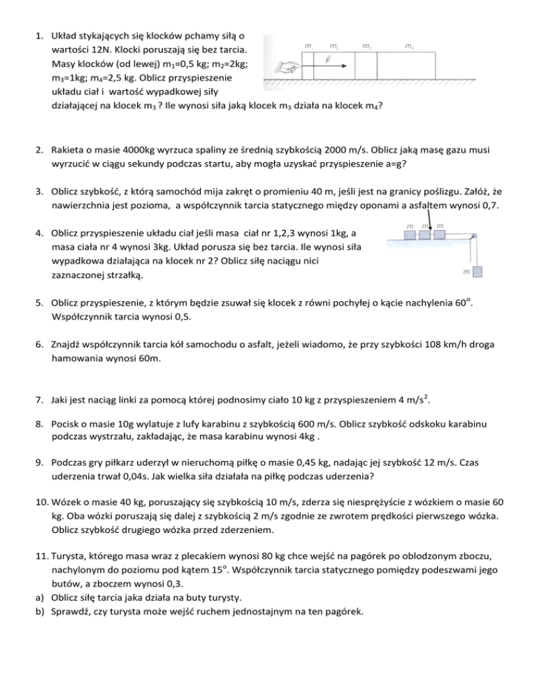 1. Układ stykających się klocków pchamy siłą o wartości 12N. Klocki