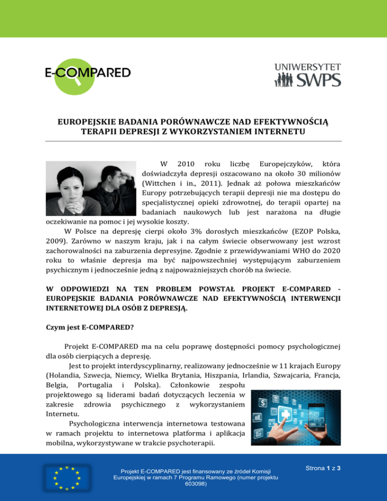 EUROPEJSKIE BADANIA PORÓWNAWCZE NAD EFEKTYWNOŚCIĄ TERAPII DEPRESJI Z WYKORZYSTANIEM INTERNETU W 2010 roku liczbę Europejczyków, która doświadczyła depresji oszacowano na około 30 milionów (Wittchen i in., 2011). Jednak aż połowa mieszkańców Europy potrzebujących terapii depresji nie ma dostępu do specjalistycznej opieki zdrowotnej, do terapii opartej na badaniach naukowych lub jest narażona na długie oczekiwanie na pomoc i jej wysokie koszty. W Polsce na depresję cierpi około 3% dorosłych mieszkańców (EZOP Polska, 2009). Zarówno w naszym kraju, jak i na całym świecie obserwowany jest wzrost zachorowalności na zaburzenia depresyjne. Zgodnie z przewidywaniami WHO do 2020 roku to właśnie depresja ma być najpowszechniej występującym zaburzeniem psychicznym i jednocześnie jedną z najpoważniejszych chorób na świecie. W ODPOWIEDZI NA TEN PROBLEM POWSTAŁ PROJEKT E-COMPARED EUROPEJSKIE BADANIA PORÓWNAWCZE NAD EFEKTYWNOŚCIĄ INTERWENCJI INTERNETOWEJ DLA OSÓB Z DEPRESJĄ. Czym jest E-COMPARED? Projekt E-COMPARED ma na celu poprawę dostępności pomocy psychologicznej dla osób cierpiących a depresję. Jest to projekt interdyscyplinarny, realizowany jednocześnie w 11 krajach Europy (Holandia, Szwecja, Niemcy, Wielka Brytania, Hiszpania, Irlandia, Szwajcaria, Francja, Belgia, Portugalia i Polska). Członkowie zespołu projektowego są liderami badań dotyczących leczenia w zakresie zdrowia psychicznego z wykorzystaniem Internetu. Psychologiczna interwencja internetowa testowana w ramach projektu to internetowa platforma i aplikacja mobilna, wykorzystywane w trakcie psychoterapii. Projekt E-COMPARED jest finansowany ze źródeł Komisji Europejskiej w ramach 7 Programu Ramowego (numer projektu 603098) Strona 1 z 3 Pacjent korzysta z nich między spotkaniami z psychoterapeutą. Platforma zawiera treści psychoedukacyjne oraz interaktywne ćwiczenia. Aplikacja pozwala na pomiar nastroju pacjenta, a nawet jakości snu. Wyniki prezentowane są w formie wykresów. Platforma internetowa i aplikacja są połączone, więc pacjent może m.in. odbierać wiadomości od terapeuty za pomocą aplikacji, a także oglądać na platformie wykres swojego nastroju tworzony przy użyciu pomiarów wykonywanych przez aplikację mobilną. Nad wszystkim czuwa psychoterapeuta, który ma wgląd w wyniki uzyskiwane przez pacjenta podczas ćwiczeń. Na zakończenie projektu zostanie stworzona rekomendacja bazująca na dowodach naukowych na temat tego, w jaki sposób terapia depresji z wykorzystaniem internetu może być w opłacalny sposób zintegrowana z istniejącymi systemami specjalistycznej opieki zdrowotnej w krajach Unii Europejskiej. Opracowane zostanie także uzasadnienie dla wprowadzenia zmian strukturalnych w tych systemach. Jak wygląda uczestnictwo w projekcie E-COMPARED? Osoby cierpiące na depresję, które chcą skorzystać z terapii kontaktują się z jednym z gabinetów psychoterapeutycznych wymienionych na polskiej stronie projektu (www.streslab.eu). Przewidzianych zostało 150 miejsc dla osób, które: są pełnoletnie, podejrzewają, że mogą cierpieć na depresję i mają dostęp do komputera lub tabletu z dostępem do internetu. Po przeprowadzeniu przez psychologa klinicznego wywiadu diagnostycznego, pacjenci zostają losowo rozdzieleni na dwie grupy. Jedna przechodzi klasyczną terapię poznawczo-behawioralną, druga – tę samą terapię, ale z wykorzystaniem internetu. W ten sposób istnieje możliwość porównania efektywności obu form terapii. Terapia z wykorzystaniem internetu trwa około 7 tygodni. W tym czasie pacjent spotyka się z terapeutą w gabinecie i wykonuje zadania online. Terapia klasyczna odbywa się w tradycyjny sposób według scenariusza zaproponowanego pacjentowi przez terapeutę. Co ważne, niezależnie od tego, do jakiej grupy pacjent zostanie losowo przydzielony, otrzyma fachową pomoc. Efektywność terapii online Badania pokazują, że terapia z wykorzystaniem internetu jest odpowiedzią na problemy związane z dostępnością pomocy psychologicznej w wielu krajach. Co więcej, może być ona tańsza dla pacjenta przy jednoczesnym zachowaniu wysokiej jakości. Dodatkowo, badania wskazują, że: dostarczanie wiedzy za pośrednictwem internetu może być tak samo skuteczne jak przy użyciu tradycyjnych metod, a gdy problemy dotyczą rozwoju osobistego – nawet bardziej skuteczne (Sitzmann i in., 2013), Projekt E-COMPARED jest finansowany ze źródeł Komisji Europejskiej w ramach 7 Programu Ramowego (numer projektu 603098) Strona 2 z 3 terapia internetowa jest równie skuteczna jak tradycyjna, ale jest od niej mniej kosztowna dla pacjenta i bardziej opłacalna dla systemu zdrowotnego, a także pozwala oszczędzić czas terapeucie (Kaltenthaler i in., 2006; Smit i in., 2011), psychologiczne interwencje internetowe są skuteczne w zwalczaniu depresji Richards i Richardson, 2012), psychologiczne interwencje internetowe są bardziej skuteczne niż tradycyjne formy pomocy w zwiększaniu poziomu wiedzy i zmianie zachowań dotyczących m.in. odżywiania, korzystania z leczenia i odchudzania (Wantland i in., 2004). Jednym z krajów, w których terapia z wykorzystaniem internetu ma powszechne zastosowanie jest Holandia. Formy leczenia depresji z wykorzystaniem internetu rozwijane są w tym kraju od ponad dekady. Oferowane są one przede wszystkim osobom z objawami łagodnych oraz umiarkowanych stanów depresyjnych. Terapie online projektowane są głównie w oparciu o elementy terapii poznawczo-behawioralnej (ICBT), często łączone są z leczeniem tradycyjnym, w tym farmakoterapią. Poniżej kilka faktów i liczb dotyczących tego, jak to wygląda w praktyce w Holandii: Leczenie z wykorzystaniem internetu zostało włączone do pakietu standardowych procedur medycznych i terapeutycznych, zarówno w ramach publicznej, jak i prywatnej opieki zdrowotnej. Obecnie większość publicznych instytucji opieki zdrowotnej (ponad 70%) oferuje możl