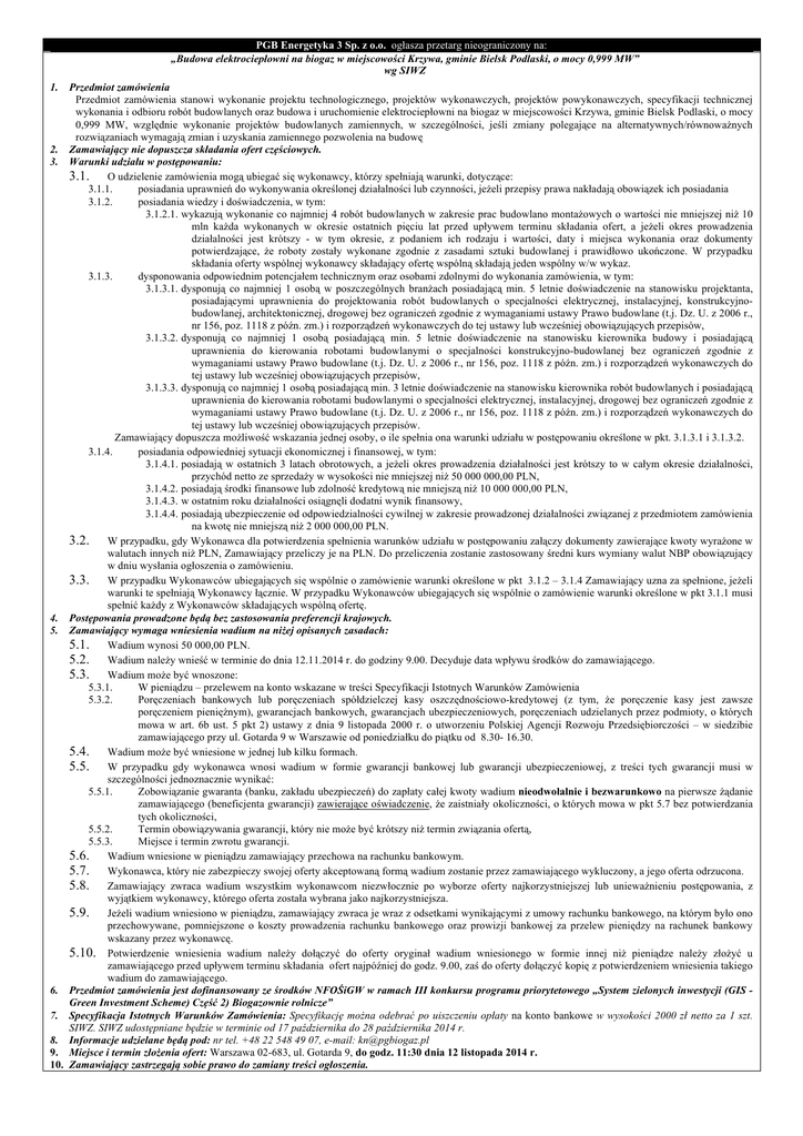 PGB Energetyka 3 Sp. z o.o. ogłasza przetarg nieograniczony na: „Budowa elektrociepłowni na biogaz w miejscowości Krzywa, gminie Bielsk Podlaski, o mocy 0,999 MW” wg SIWZ 1. Przedmiot zamówienia Przedmiot zamówienia stanowi wykonanie projektu technologicznego, projektów wykonawczych, projektów powykonawczych, specyfikacji technicznej wykonania i odbioru robót budowlanych oraz budowa i uruchomienie elektrociepłowni na biogaz w miejscowości Krzywa, gminie Bielsk Podlaski, o mocy 0,999 MW, względnie wykonanie projektów budowlanych zamiennych, w szczególności, jeśli zmiany polegające na alternatywnych/równoważnych rozwiązaniach wymagają zmian i uzyskania zamiennego pozwolenia na budowę 2. Zamawiający nie dopuszcza składania ofert częściowych. 3. Warunki udziału w postępowaniu: 3.1. O udzielenie zamówienia mogą ubiegać się wykonawcy, którzy spełniają warunki, dotyczące: 3.1.1. posiadania uprawnień do wykonywania określonej działalności lub czynności, jeżeli przepisy prawa nakładają obowiązek ich posiadania 3.1.2. posiadania wiedzy i doświadczenia, w tym: 3.1.2.1. wykazują wykonanie co najmniej 4 robót budowlanych w zakresie prac budowlano montażowych o wartości nie mniejszej niż 10 mln każda wykonanych w okresie ostatnich pięciu lat przed upływem terminu składania ofert, a jeżeli okres prowadzenia działalności jest krótszy - w tym okresie, z podaniem ich rodzaju i wartości, daty i miejsca wykonania oraz dokumenty potwierdzające, że roboty zostały wykonane zgodnie z zasadami sztuki budowlanej i prawidłowo ukończone. W przypadku składania oferty wspólnej wykonawcy składający ofertę wspólną składają jeden wspólny w/w wykaz. 3.1.3. dysponowania odpowiednim potencjałem technicznym oraz osobami zdolnymi do wykonania zamówienia, w tym: 3.1.3.1. dysponują co najmniej 1 osobą w poszczególnych branżach posiadającą min. 5 letnie doświadczenie na stanowisku projektanta, posiadającymi uprawnienia do projektowania robót budowlanych o specjalności elektrycznej, instalacyjnej, konstrukcyjnobudowlanej, architektonicznej, drogowej bez ograniczeń zgodnie z wymaganiami ustawy Prawo budowlane (t.j. Dz. U. z 2006 r., nr 156, poz. 1118 z późn. zm.) i rozporządzeń wykonawczych do tej ustawy lub wcześniej obowiązujących przepisów, 3.1.3.2. dysponują co najmniej 1 osobą posiadającą min. 5 letnie doświadczenie na stanowisku kierownika budowy i posiadającą uprawnienia do kierowania robotami budowlanymi o specjalności konstrukcyjno-budowlanej bez ograniczeń zgodnie z wymaganiami ustawy Prawo budowlane (t.j. Dz. U. z 2006 r., nr 156, poz. 1118 z późn. zm.) i rozporządzeń wykonawczych do tej ustawy lub wcześniej obowiązujących przepisów, 3.1.3.3. dysponują co najmniej 1 osobą posiadającą min. 3 letnie doświadczenie na stanowisku kierownika robót budowlanych i posiadającą uprawnienia do kierowania robotami budowlanymi o specjalności elektrycznej, instalacyjnej, drogowej bez ograniczeń zgodnie z wymaganiami ustawy Prawo budowlane (t.j. Dz. U. z 2006 r., nr 156, poz. 1118 z późn. zm.) i rozporządzeń wykonawczych do tej ustawy lub wcześniej obowiązujących przepisów. Zamawiający dopuszcza możliwość wskazania jednej osoby, o ile spełnia ona warunki udziału w postępowaniu określone w pkt. 3.1.3.1 i 3.1.3.2. 3.1.4. posiadania odpowiedniej sytuacji ekonomicznej i finansowej, w tym: 3.1.4.1. posiadają w ostatnich 3 latach obrotowych, a jeżeli okres prowadzenia działalności jest krótszy to w całym okresie działalności, przychód netto ze sprzedaży w wysokości nie mniejszej niż 50 000 000,00 PLN, 3.1.4.2. posiadają środki finansowe lub zdolność kredytową nie mniejszą niż 10 000 000,00 PLN, 3.1.4.3. w ostatnim roku działalności osiągnęli dodatni wynik finansowy, 3.1.4.4. posiadają ubezpieczenie od odpowiedzialności cywilnej w zakresie prowadzonej działalności związanej z przedmiotem zamówienia na kwotę nie mniejszą niż 2 000 000,00 PLN. 3.2. W przypadku, gdy Wykonawca dla potwierdzenia spełnienia warunków udziału w postępowaniu załączy dokumenty zawierające kwoty wyrażone w walutach innych niż PLN, Zamawiający przeliczy je na PLN. Do przeliczenia zostanie zastosowany średni kurs wymiany walut NBP obowiązujący w dniu wysłania ogłoszenia o zamówieniu. 3.3. W przypadku Wykonawców ubiegających się wspólnie o zamówienie warunki określone w pkt 3.1.2 – 3.1.4 Zamawiający uzna za spełnione, jeżeli warunki te spełniają Wykonawcy łącznie. W przypadku Wykonawców ubiegających się wspólnie o zamówienie warunki określone w pkt 3.1.1 musi spełnić każdy z Wykonawców składających wspólną ofertę. 4. Postępowania prowadzone będą bez zastosowania preferencji krajowych. 5. Zamawiający wymaga wniesienia wadium na niżej opisanych zasadach: 5.1. Wadium wynosi 50 000,00 PLN. 5.2. Wadium należy wnieść w terminie do dnia 12.11.2014 r. do godziny 9.00. Decyduje data wpływu środków do zamawiającego. 5.3. Wadium może być wnoszone: 5.3.1. W pieniądzu – przelewem na konto wskazane w treści Specyfikacji Istotnych Warunków Zamówienia 5.3.2. Poręczeniach bankowych lub poręczeniach spółdzielczej kasy oszczędnościowo-kredytowej (z tym, że poręczenie kasy jest zawsze poręczeniem pieniężnym), gwarancjach bankowych, gwarancjach ubezpieczeniowych, poręczeniach udzielanych przez podmioty, o których mowa w art. 6b ust. 5 pkt 2) ustawy z dnia 9 listopada 2000 r. o utworzeniu Polskiej Agencji Rozwoju Przedsiębiorczości – w siedzibie zamawiającego przy ul. Gotarda 9 w Warszawie od poniedziałku do piątku od 8.30- 16.30. 5.4. Wadium może być wniesione w jednej lub kilku formach. 5.5. W przypadku gdy wykonawca wnosi wadium w formie gwarancji bankowej lub gwarancji ubezpieczeniowej, z treści tych gwarancji musi w szczególności jednoznacznie wynikać: 5.5.1. Zobowiązanie gwaranta (banku, zakładu ubezpieczeń) do zapłaty ca